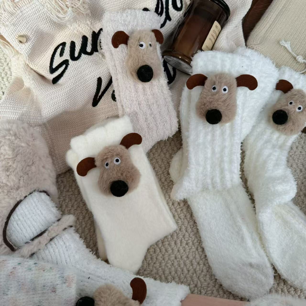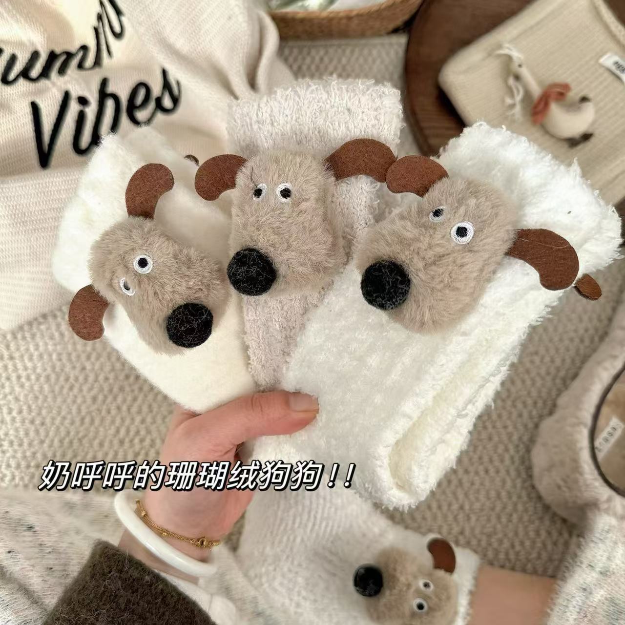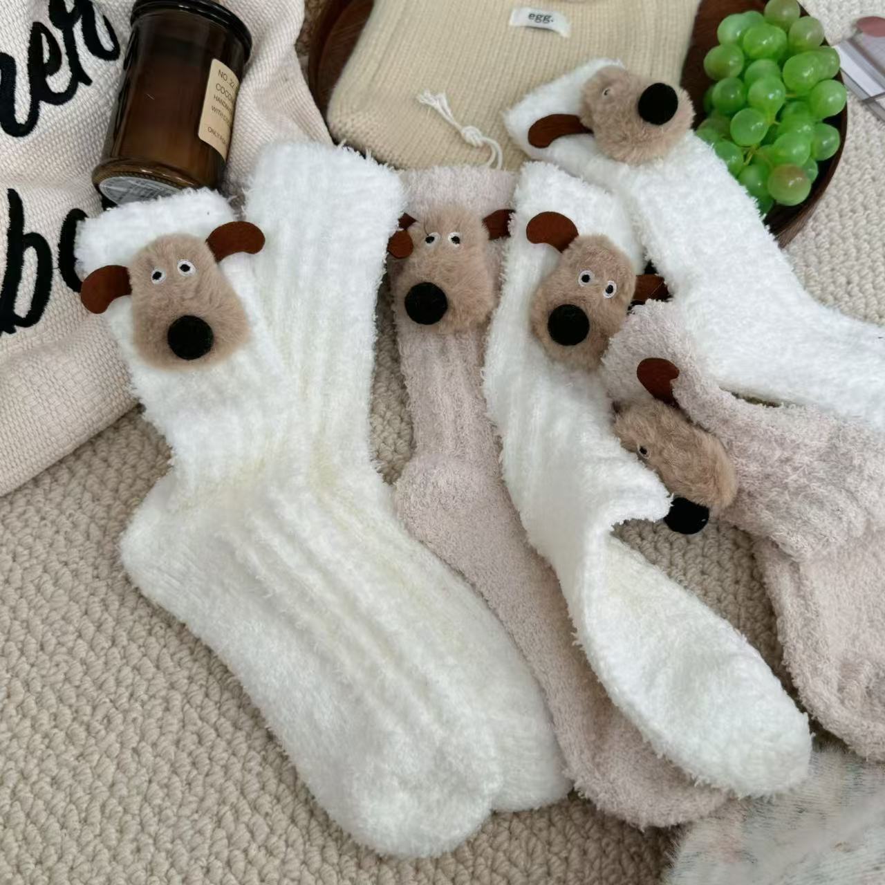한국 동대문 산호 양털 보석 양말 여성 만화 항공기 개 수면 양말 가을과 겨울 기모 두꺼운 양말