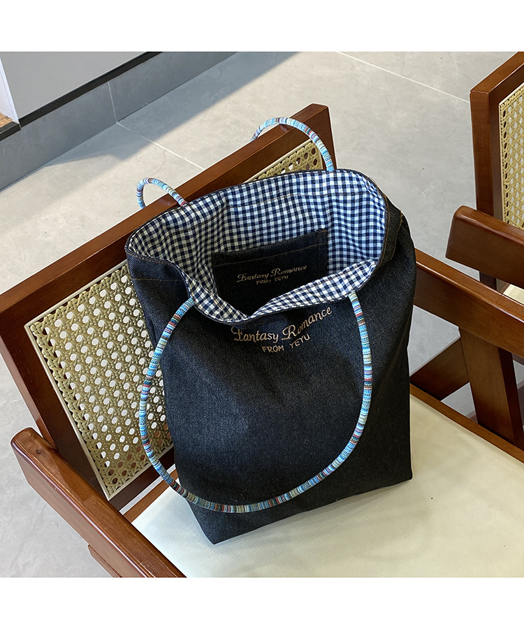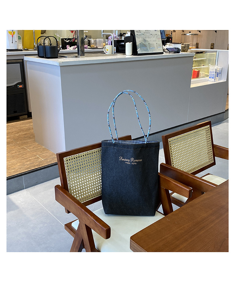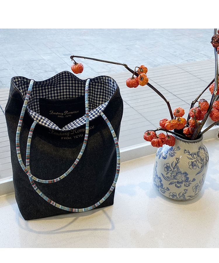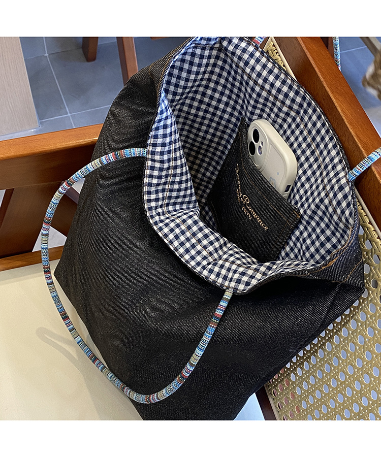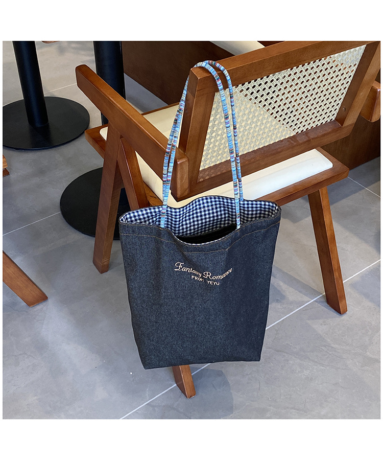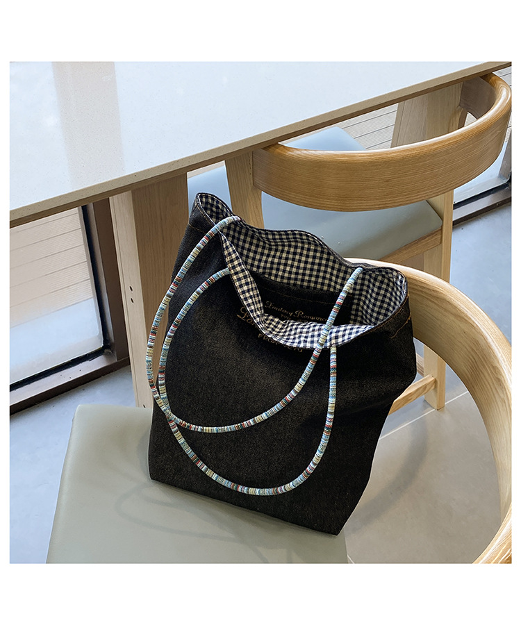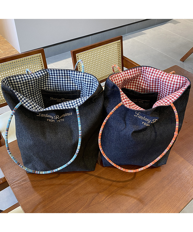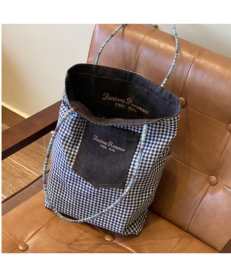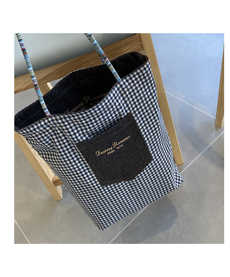 • 데님 블루 체크 무늬 양면 숄더