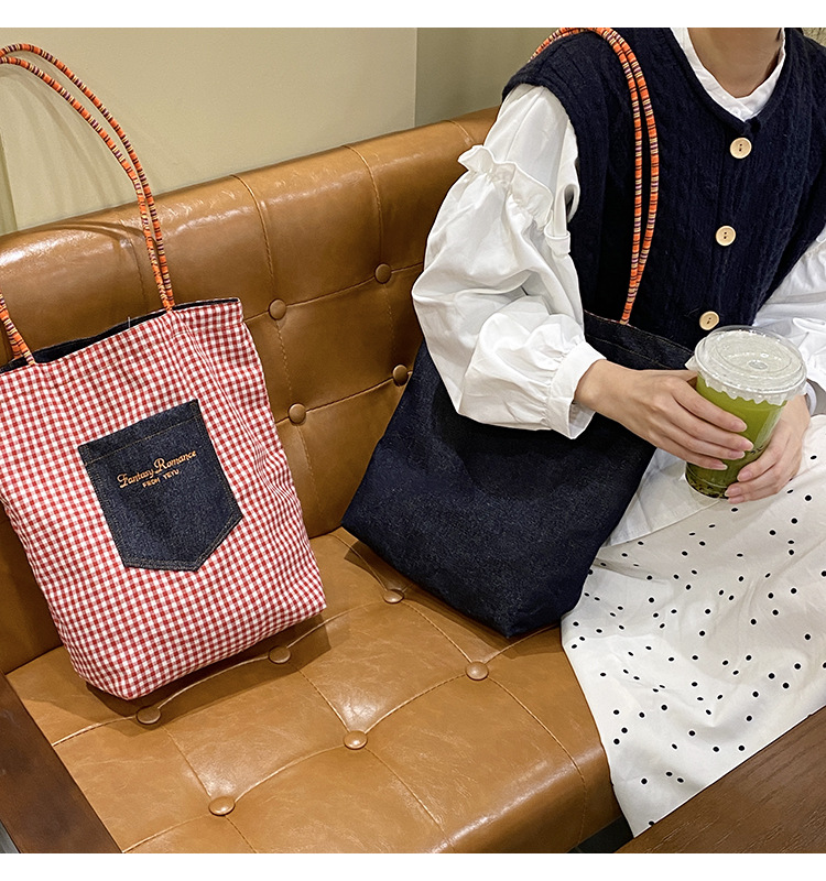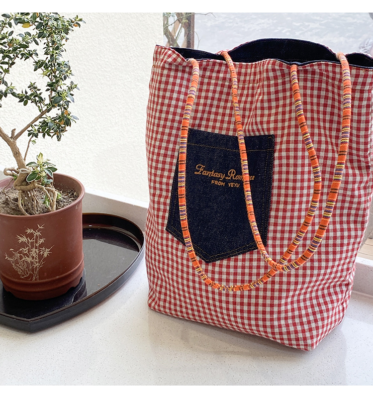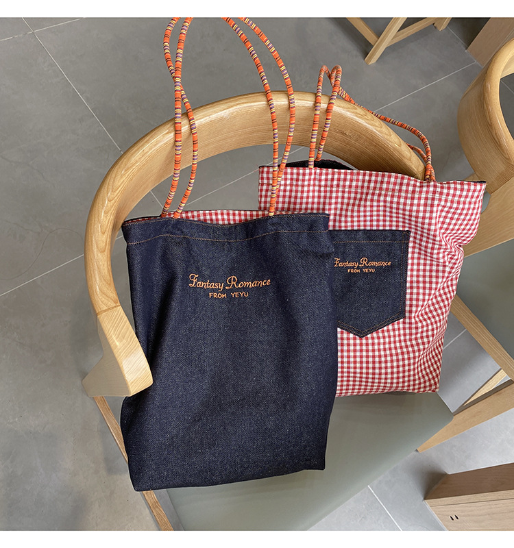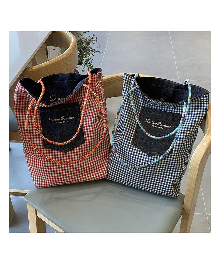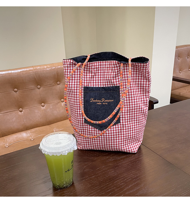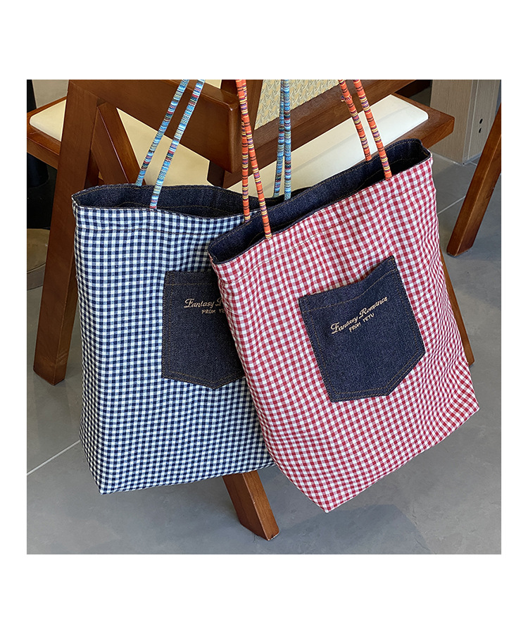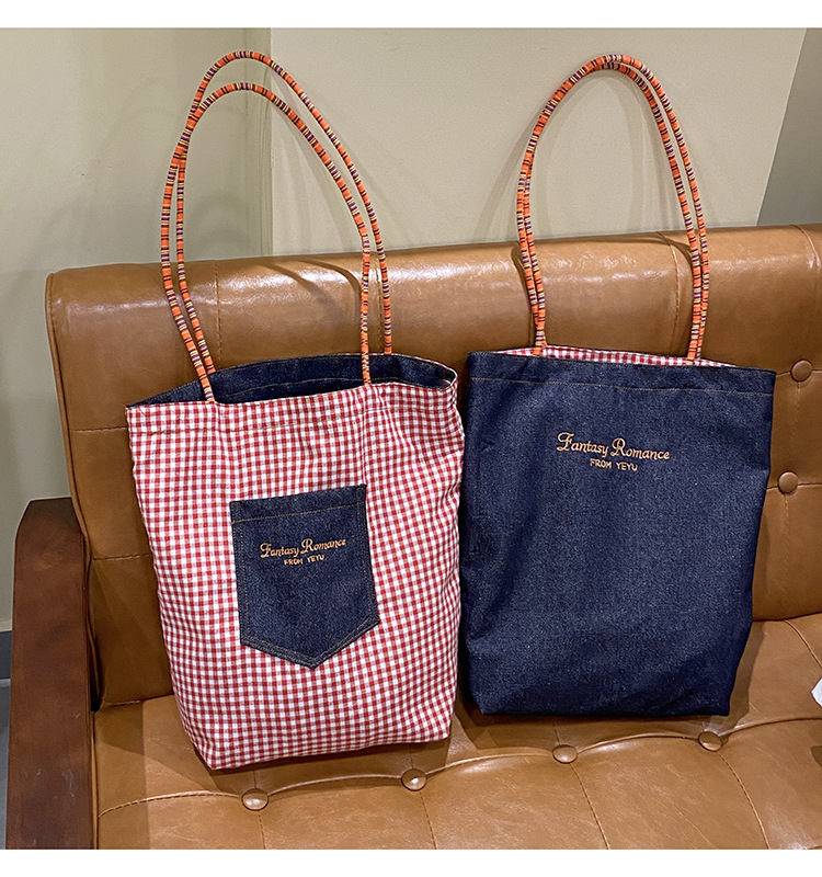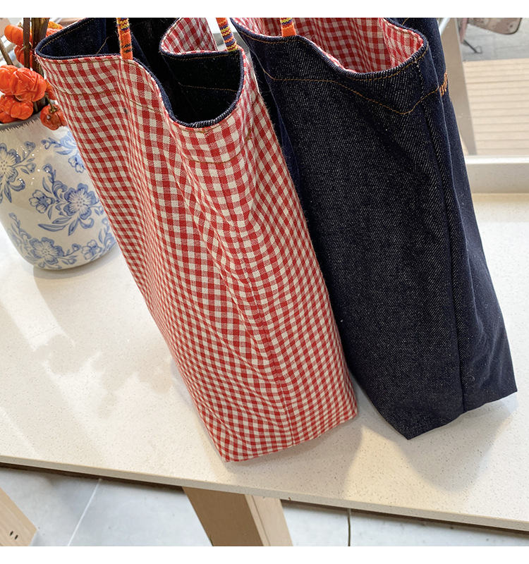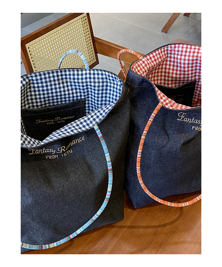 • 데님 레드 체크 무늬 양면 숄더