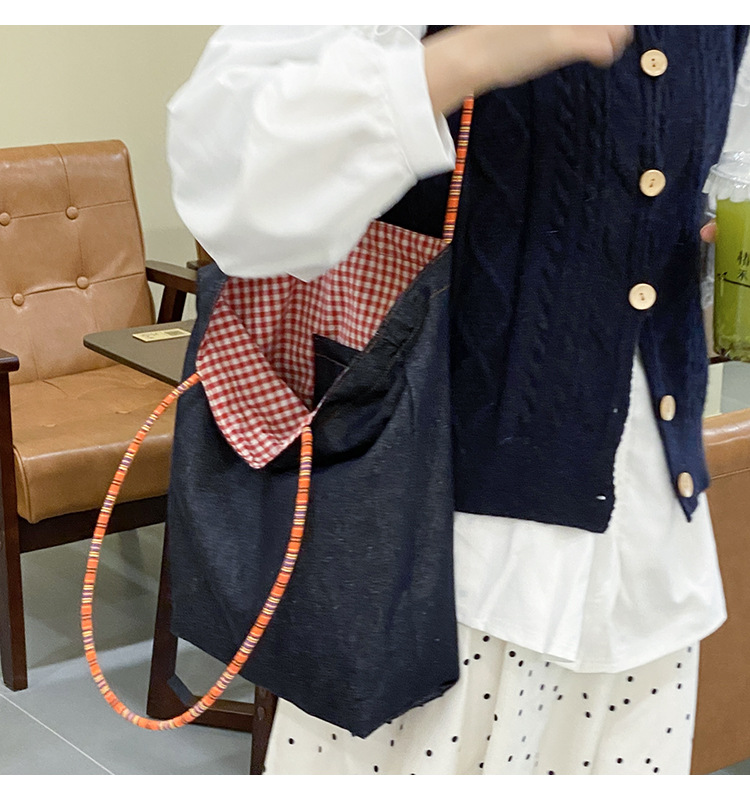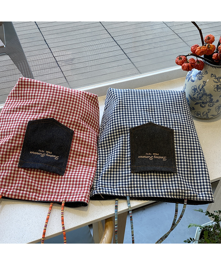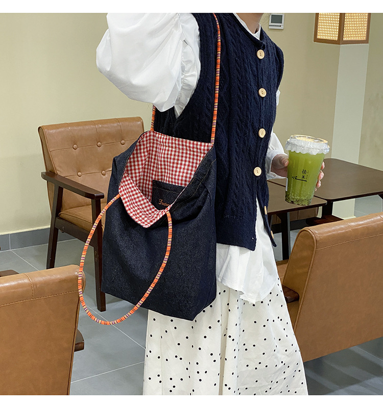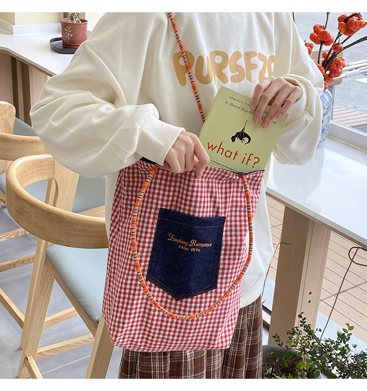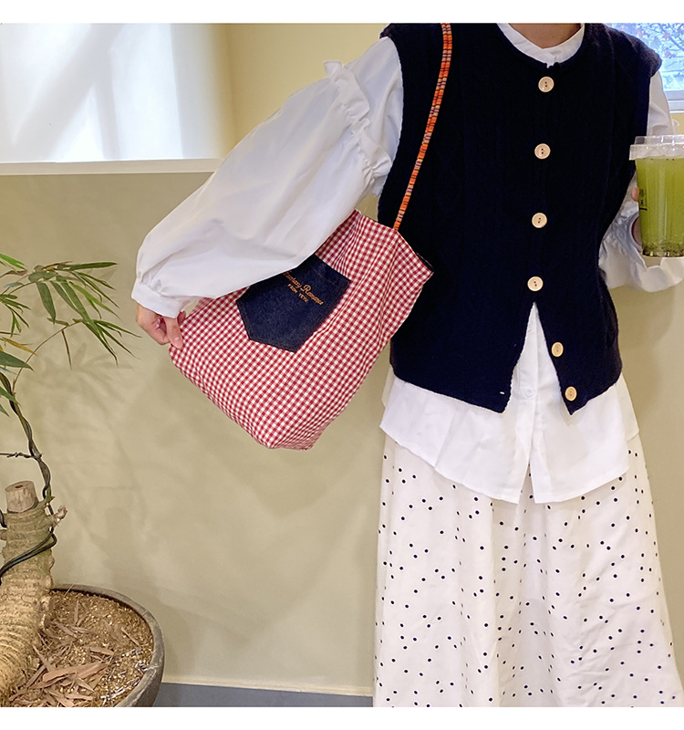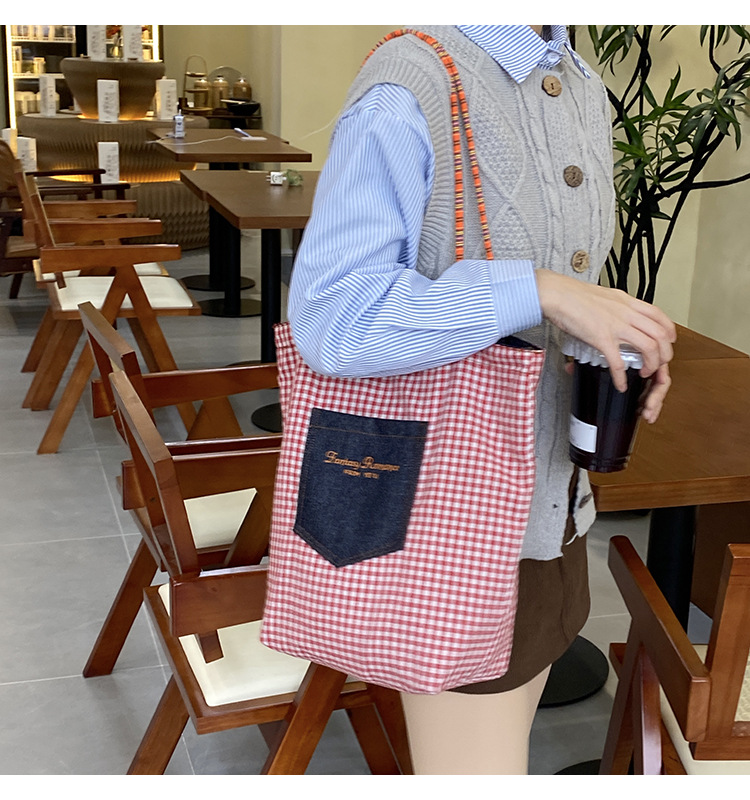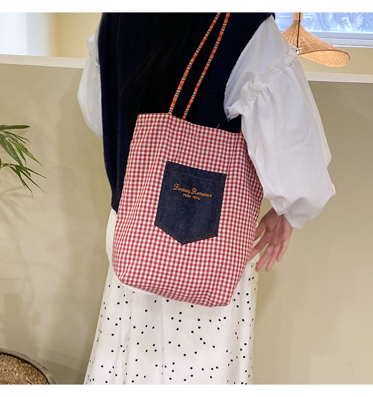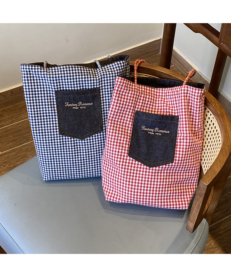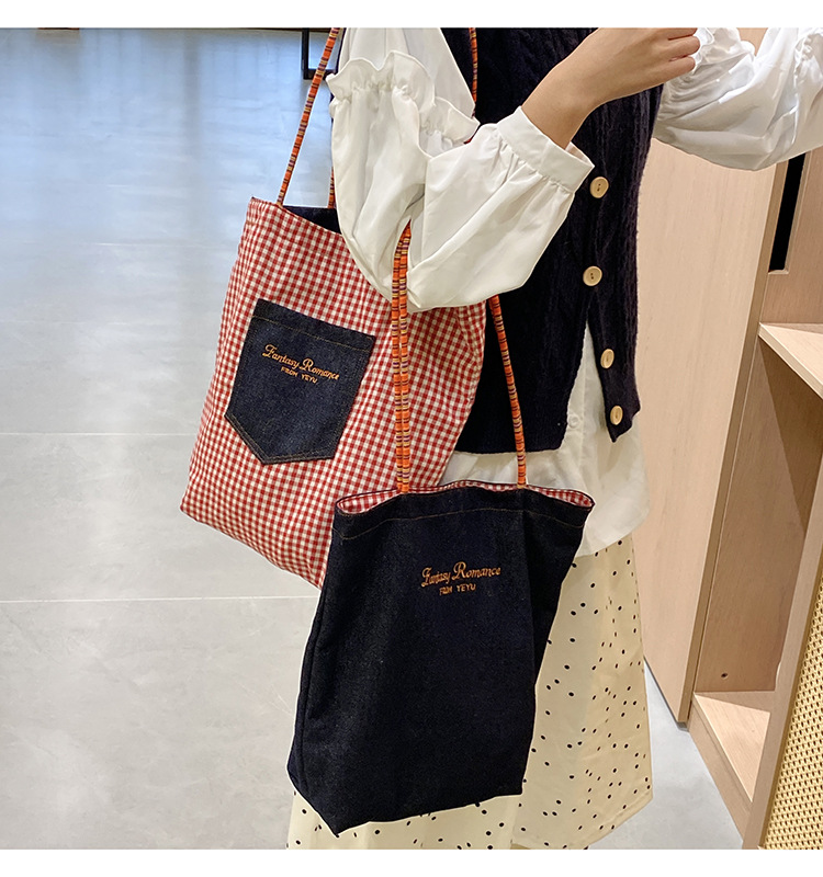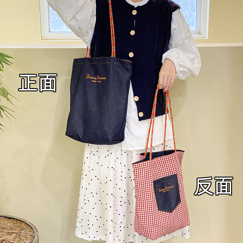 • 데님 레드 체크 무늬 양면 숄더