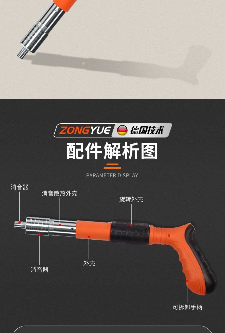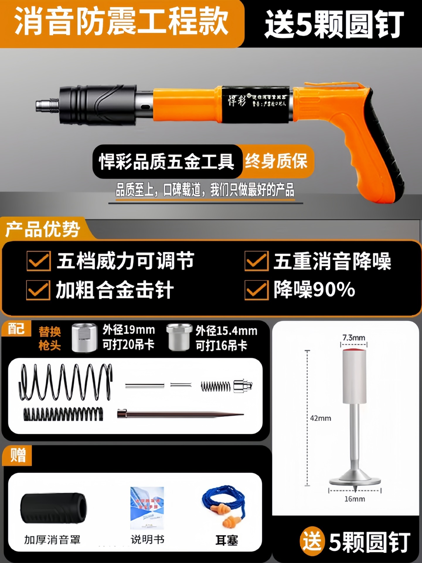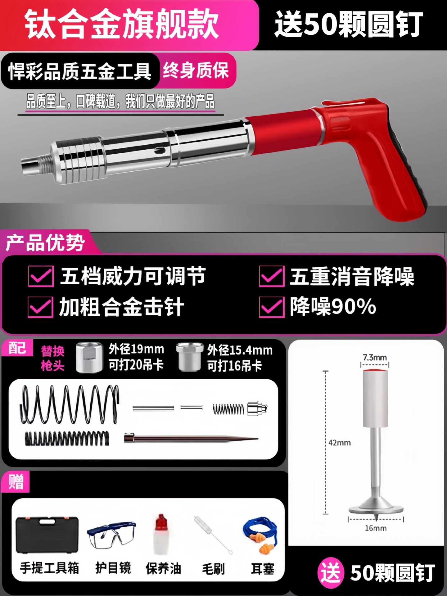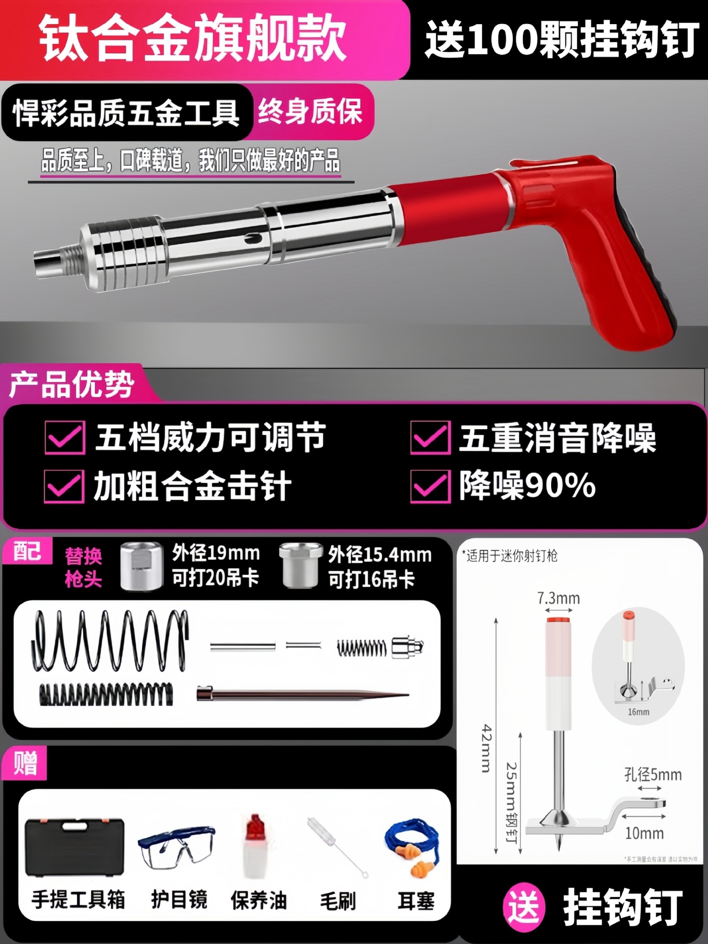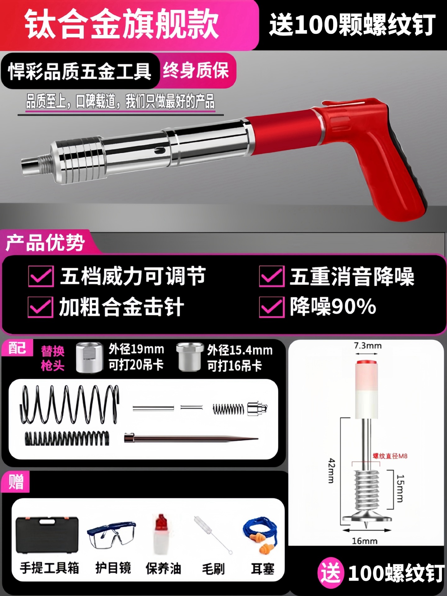 • [독일 기술 - 평생 보증] 전체 강철 몸체 건 못총 + 도구 상자 + 나사산 못 100개(무료 너트), 5단 조절 및 3건 헤드