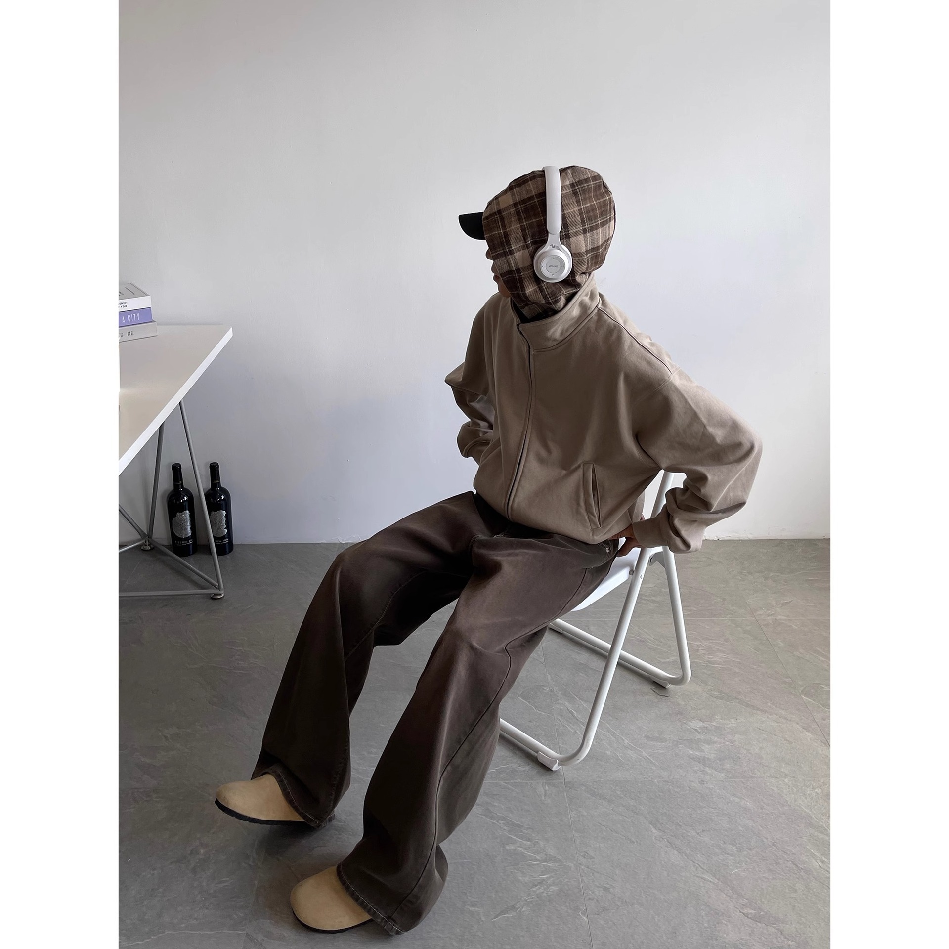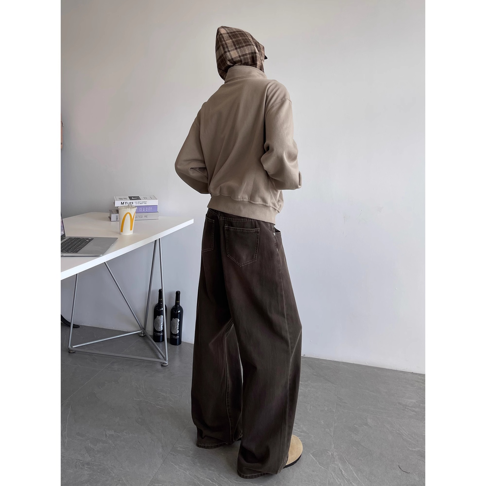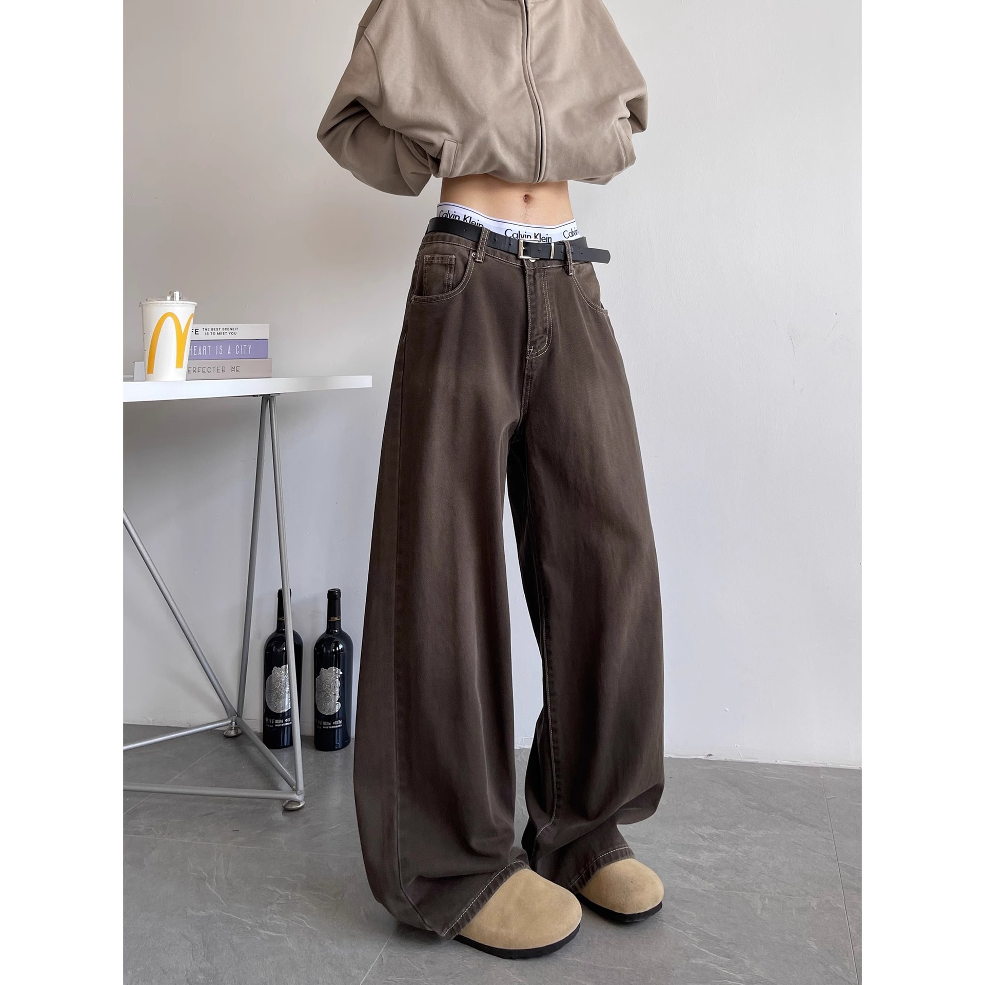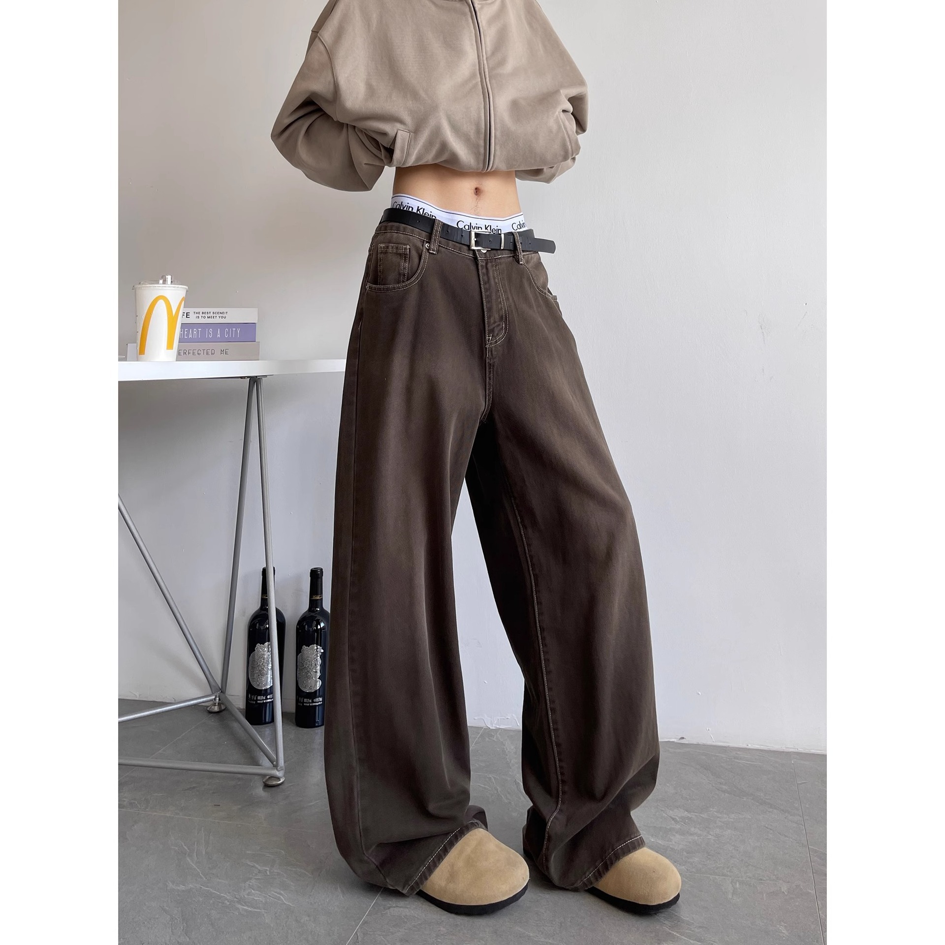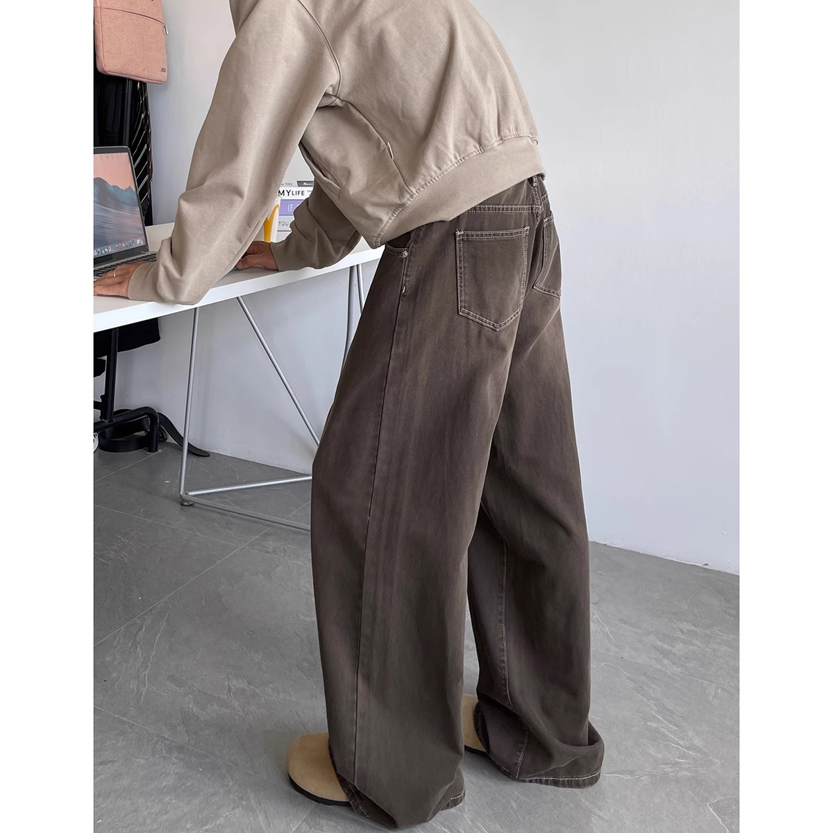 美式洗染棕牛仔裤男秋季潮牌cleanfit高街百搭休闲宽松阔腿长裤子