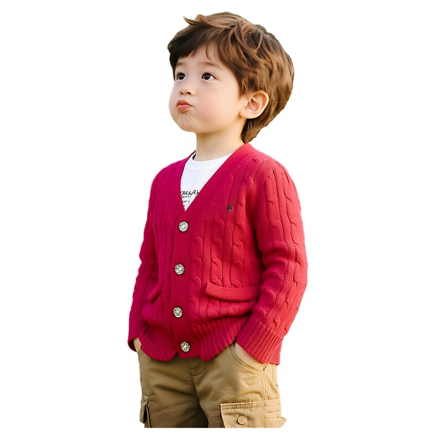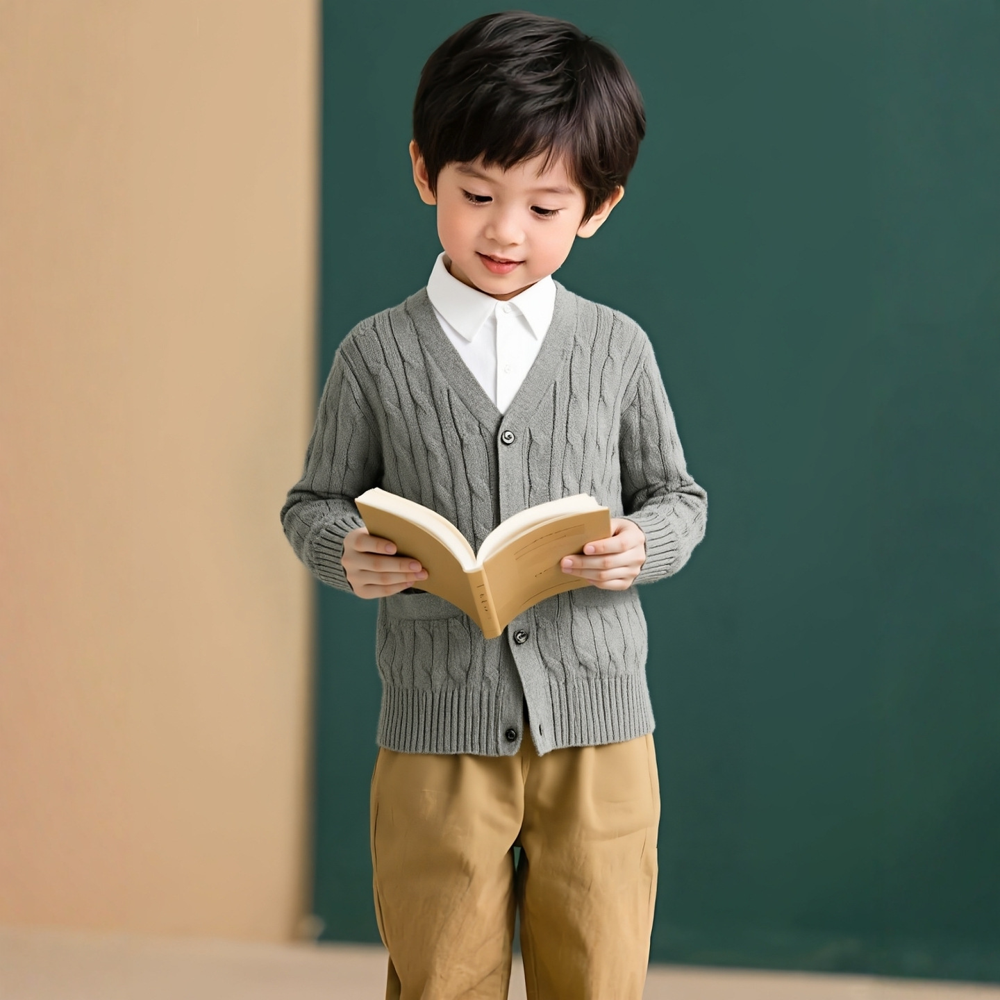 중대형 아동용 니트 가디건, 꽈배기 포켓, 아동용 스웨터, 단색 면사 V넥 코트, 긴팔, 유럽 및 미국 스타일스토어 가기
