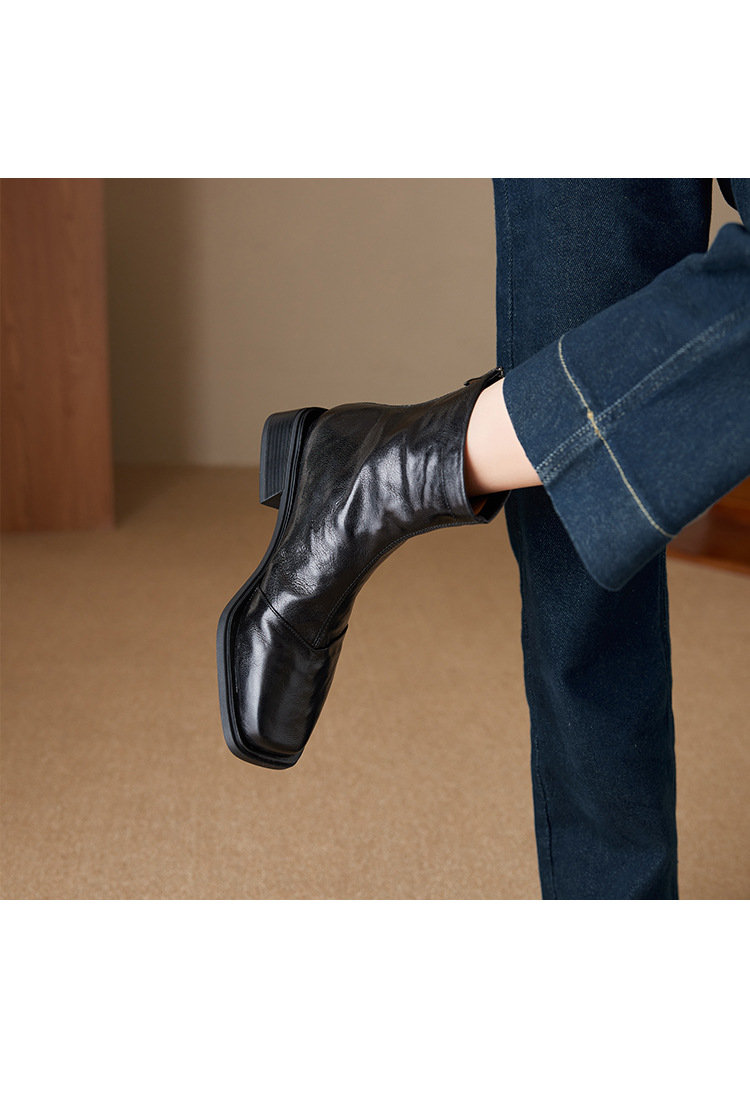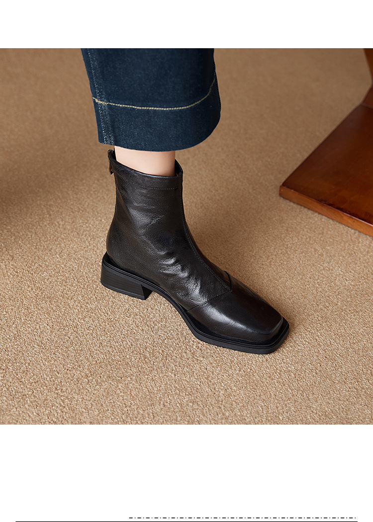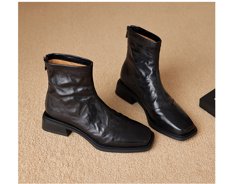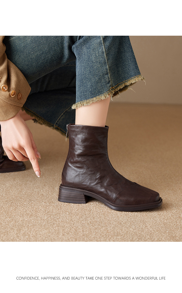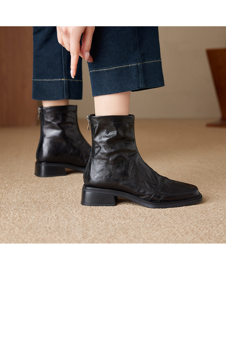 2025 신상 소가죽 부츠 스퀘어토 숏부츠 여성 가을 겨울 패션 레트로 주름 뒷지퍼 마틴부츠 슬림부츠
