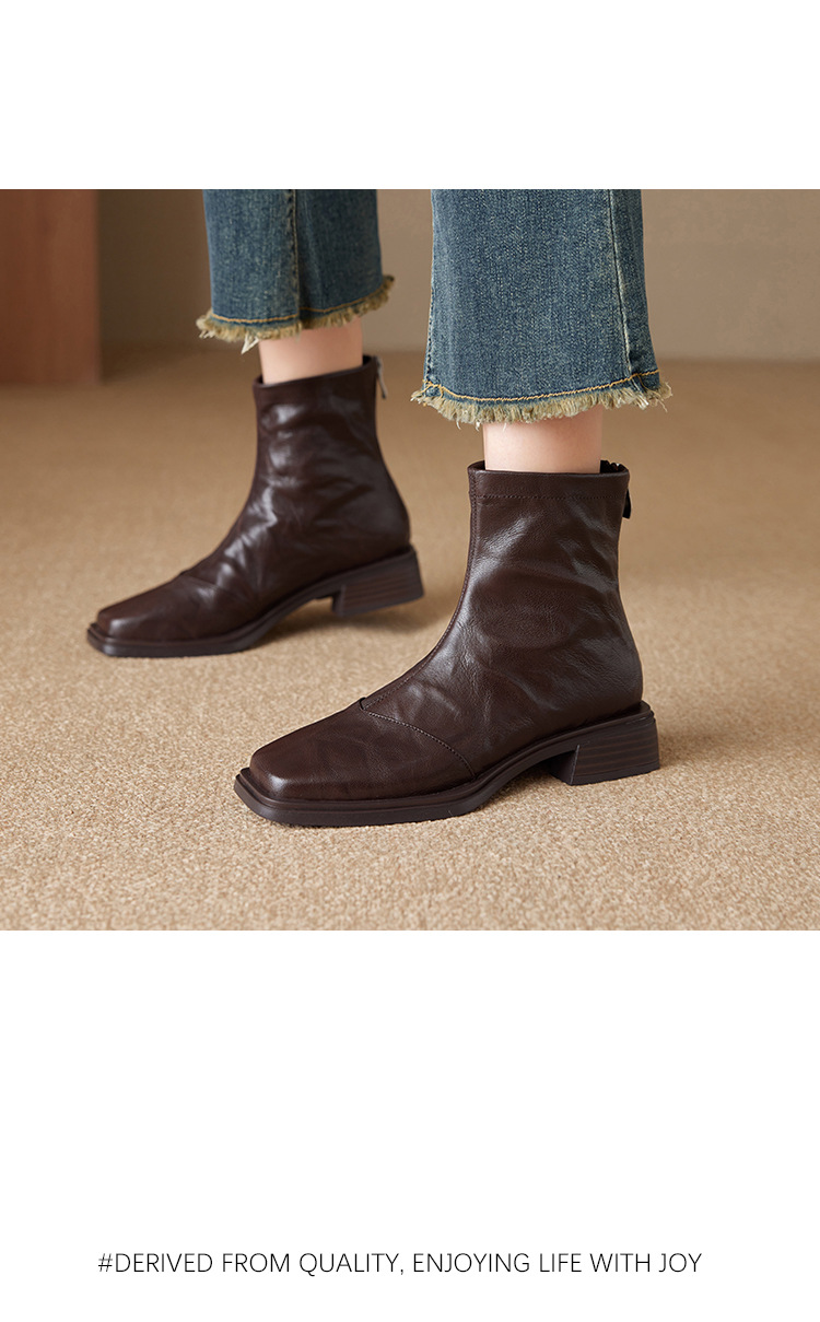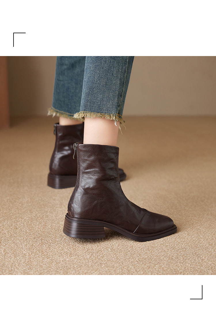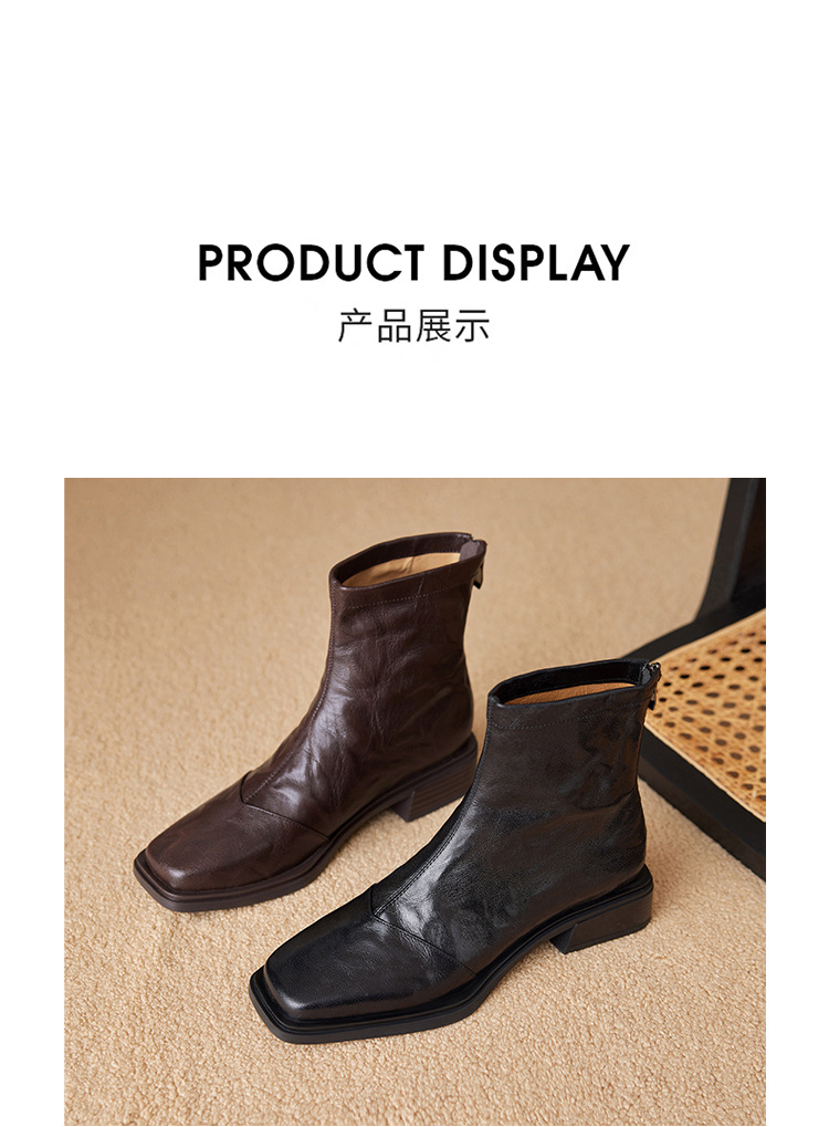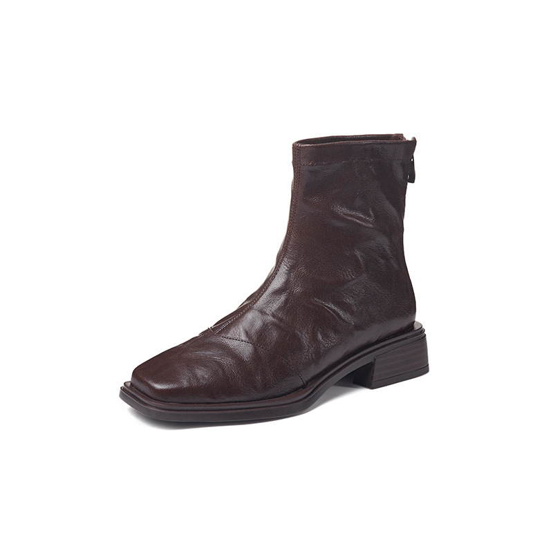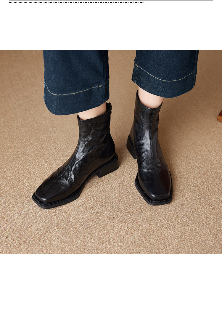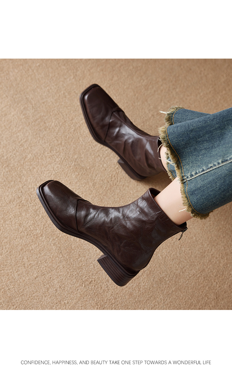 2025 신상 소가죽 부츠 스퀘어토 숏부츠 여성 가을 겨울 패션 레트로 주름 뒷지퍼 마틴부츠 슬림부츠