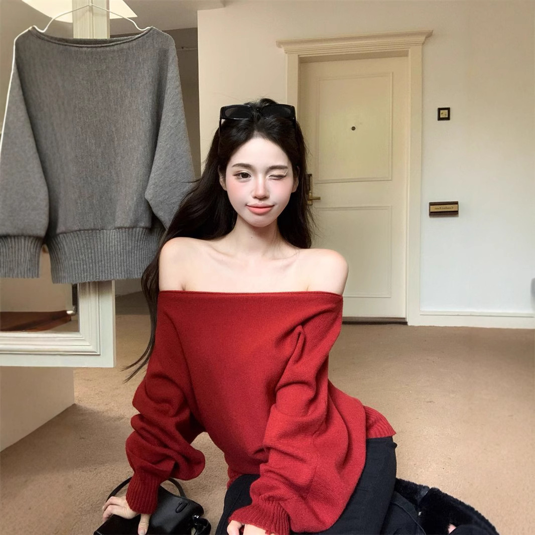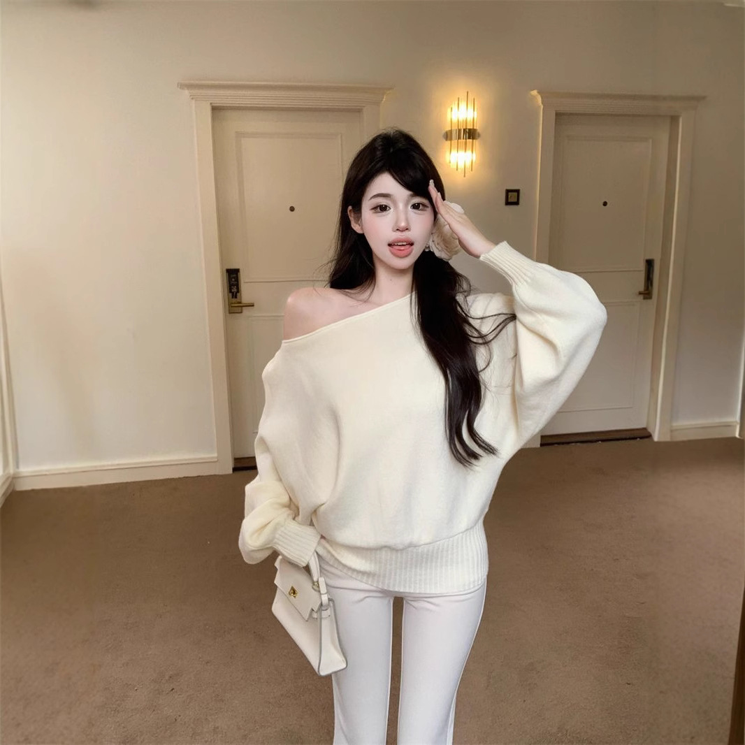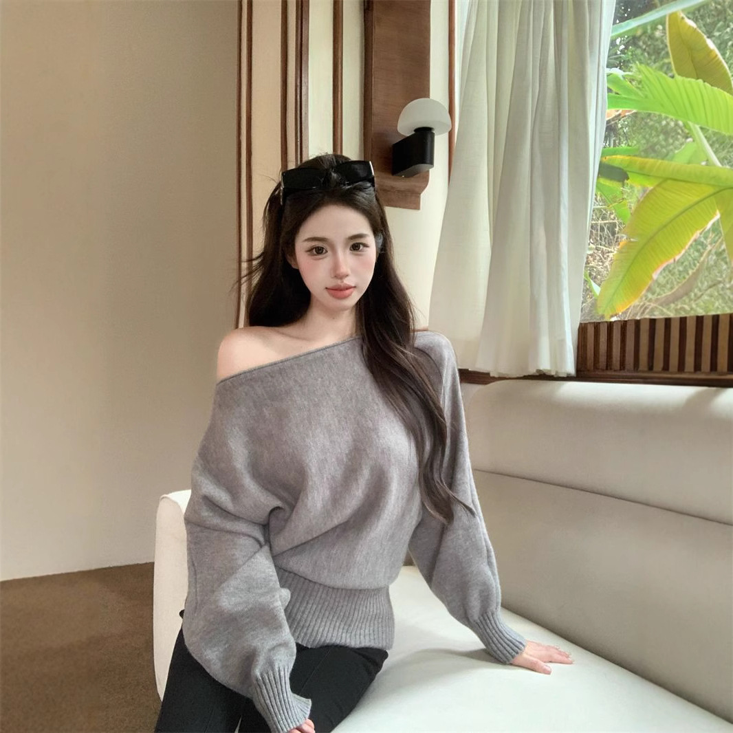 게으른 스타일 핑크 오프 숄더 박쥐 슬리브 스웨터 여성의 가을 디자인 센스 슬랜트 숄더 니트 스웨터 느슨한 오프 숄더 탑