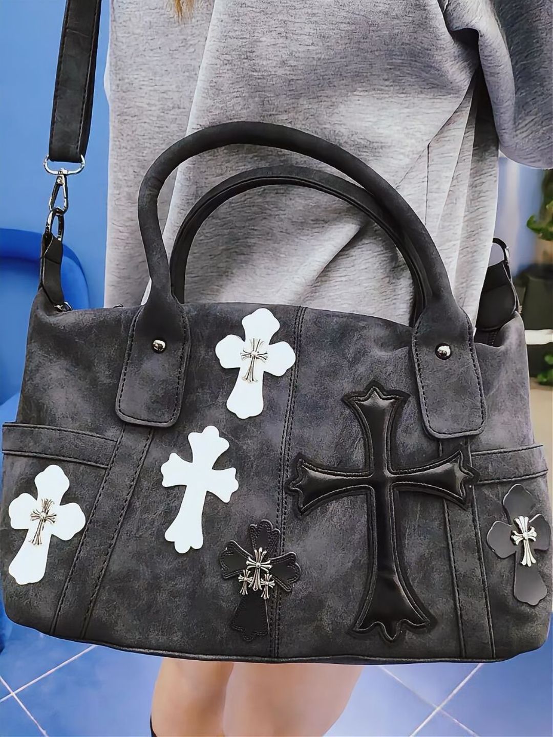 트렌디 한 쿨 하이 컬러 값 흑백 패치 워크 여행 가방 로마 금속 크로스 숄더 크로스 바디 백스토어 가기