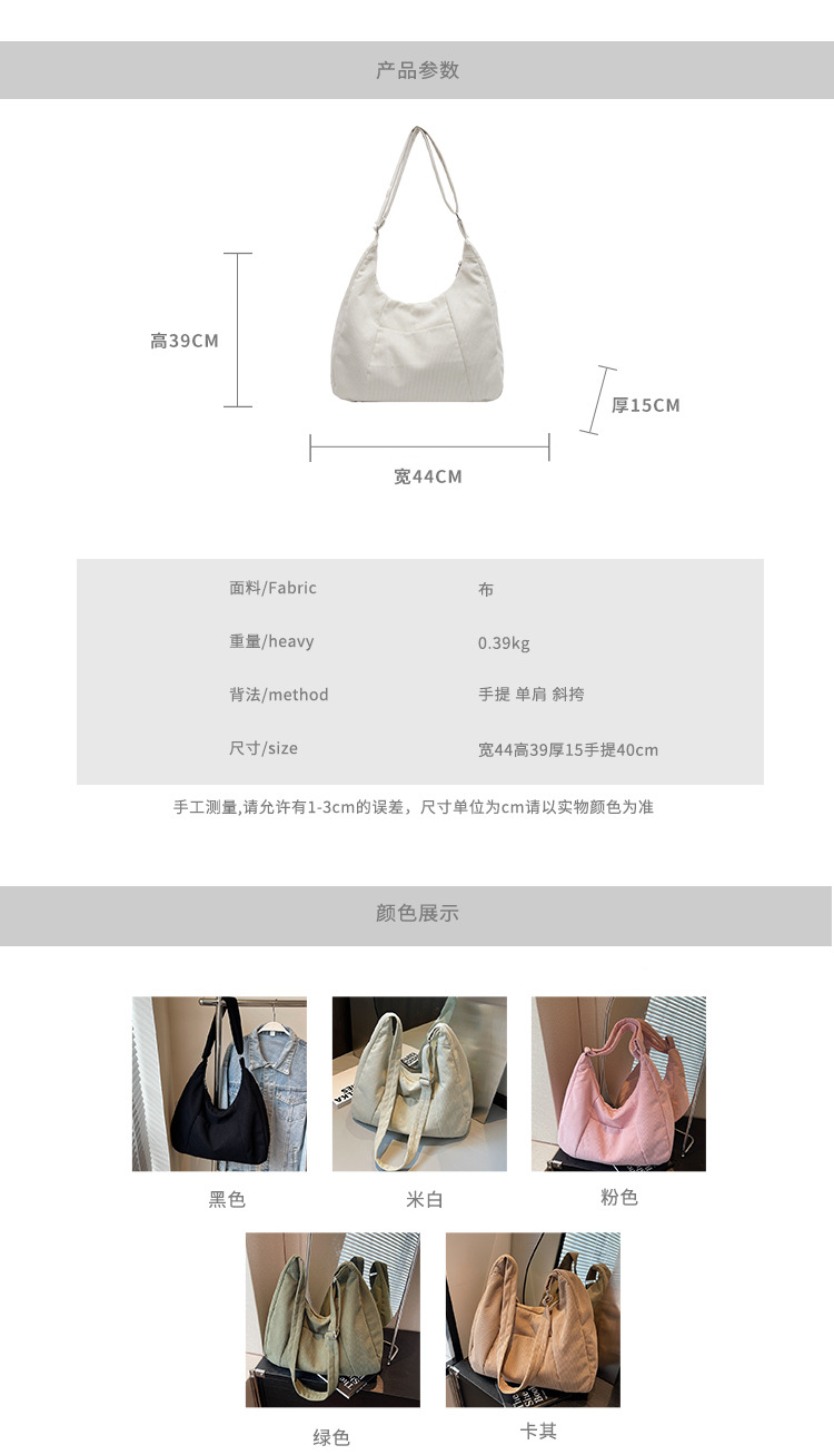 여성용 코듀로이 토트백, 출퇴근용, 대용량, 학생용, 수업용, 숄더백, 핸드백, 직장용, 크로스백, 만두백