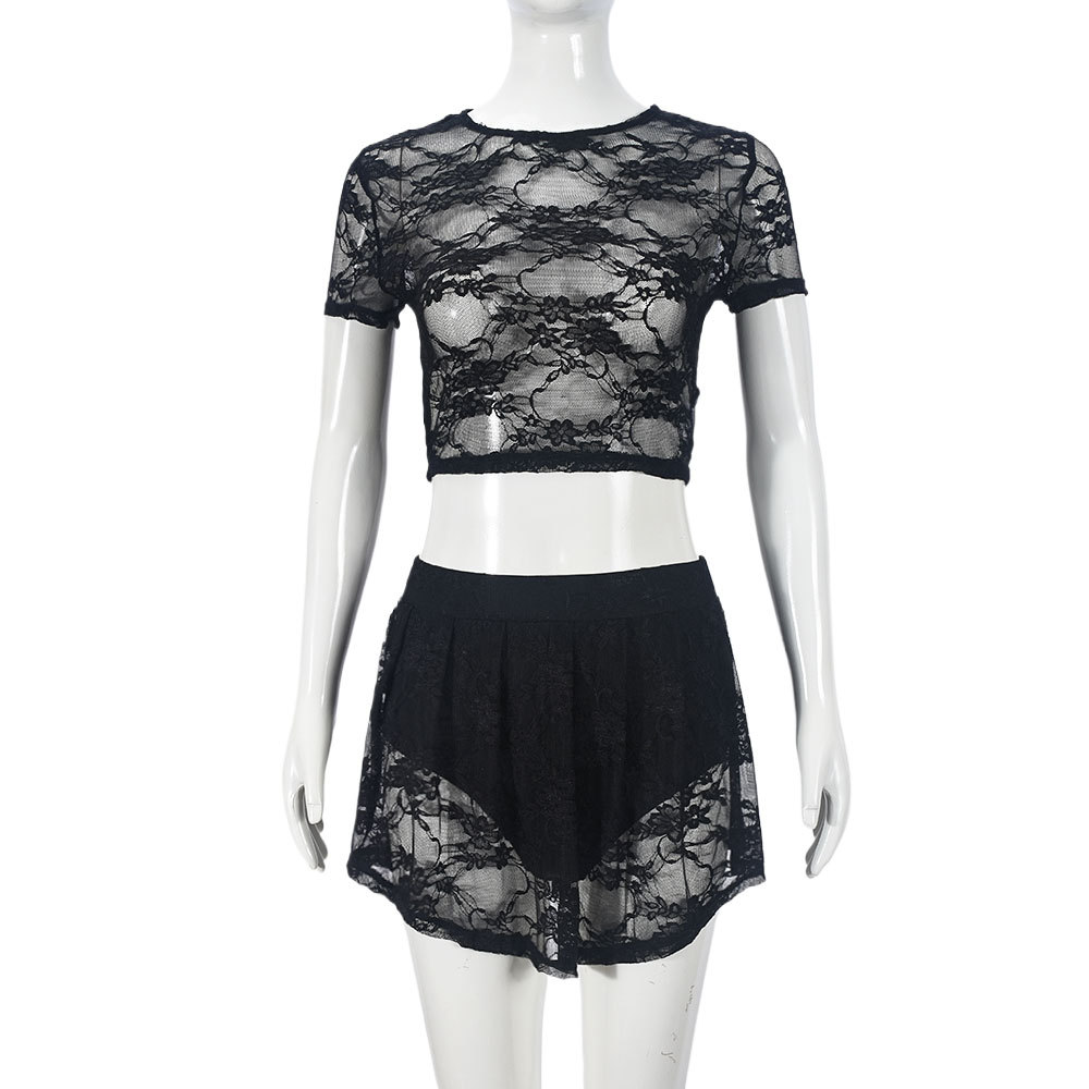 51495 Nazada 새로운 레이스 높은 탄성 할로우 배꼽 뜨거운 소녀 짧은 소매 짧은 스커트 바지 패션 섹시한 세트 여성스토어 가기