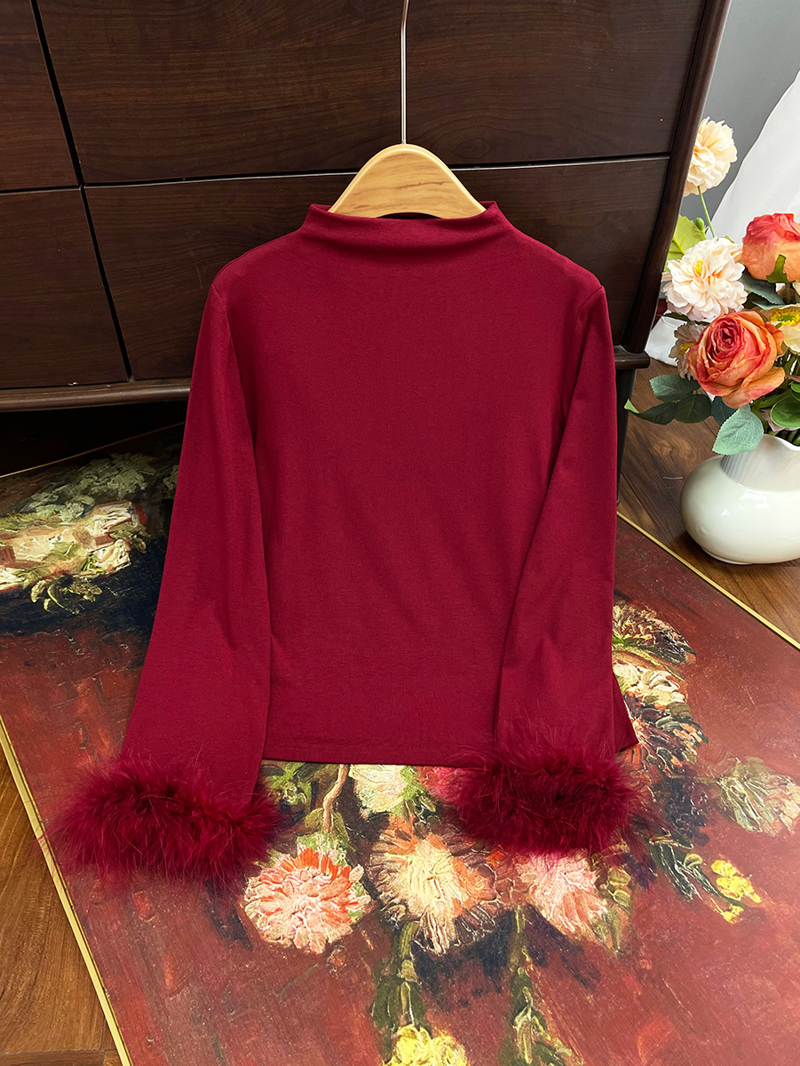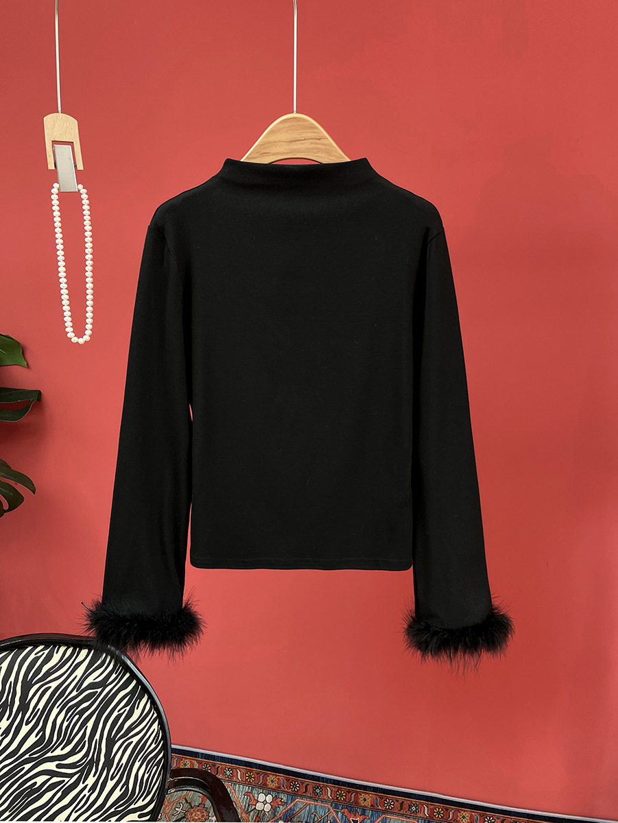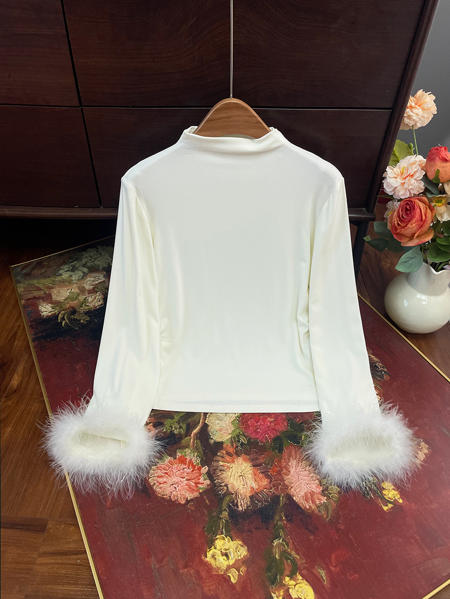 지리【베이스 레이어】중국풍 여성 하프 터틀넥 스플라이싱 타조털 슬림핏 이너웨어 겨울용 만능 아이템스토어 가기