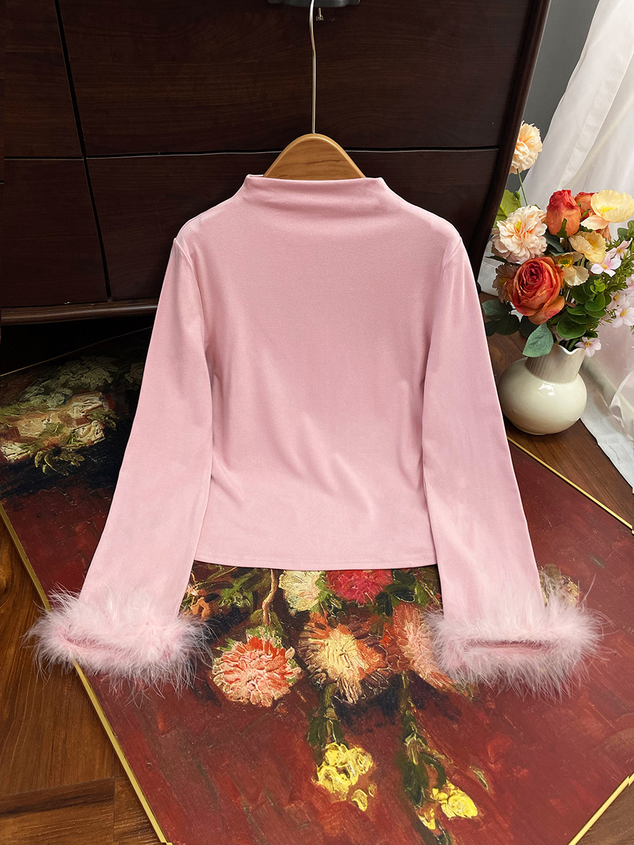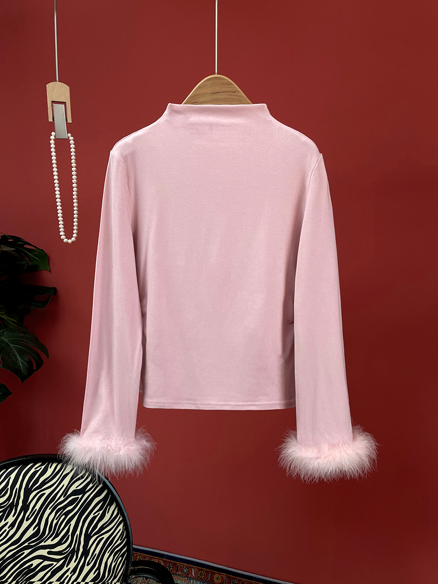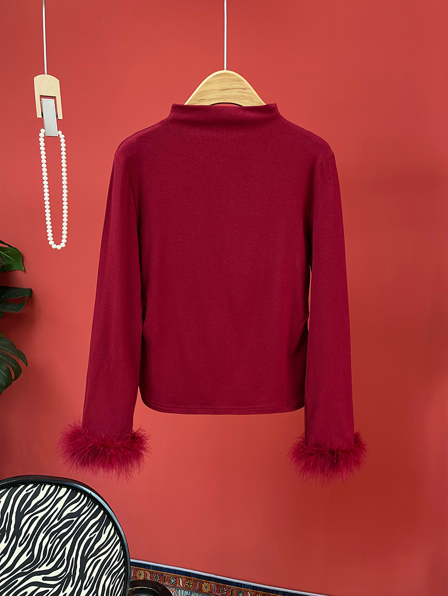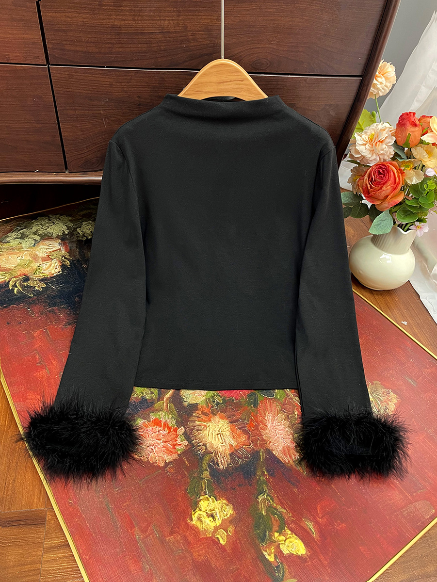 지리【베이스 레이어】중국풍 여성 하프 터틀넥 스플라이싱 타조털 슬림핏 이너웨어 겨울용 만능 아이템스토어 가기