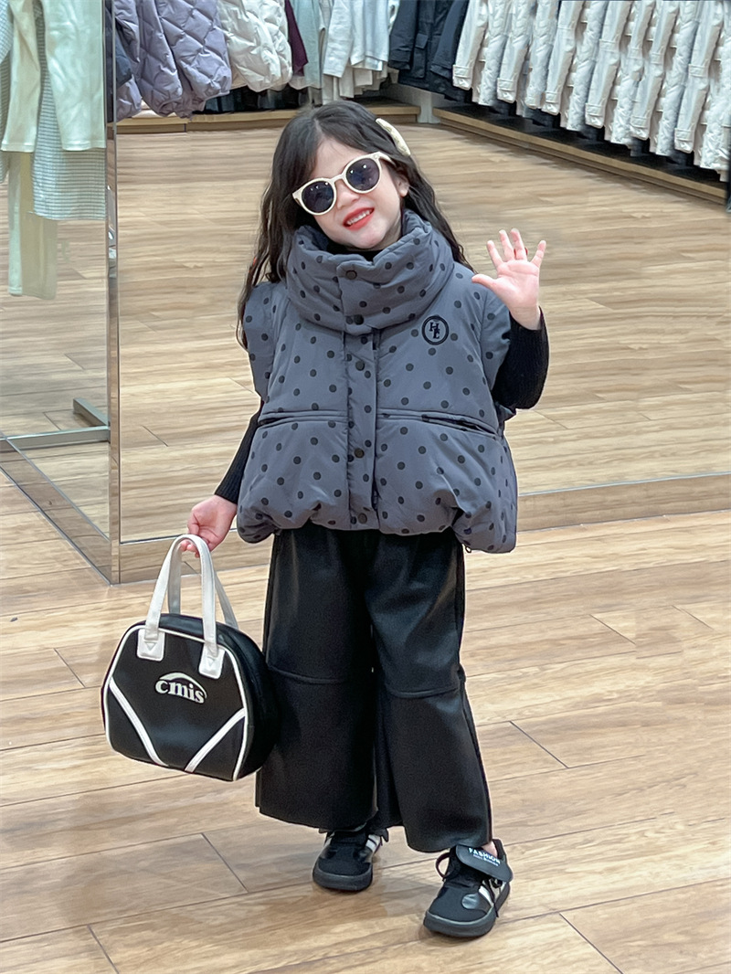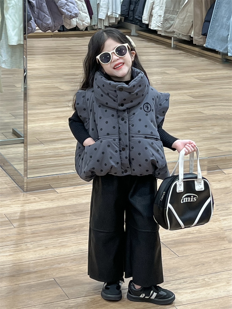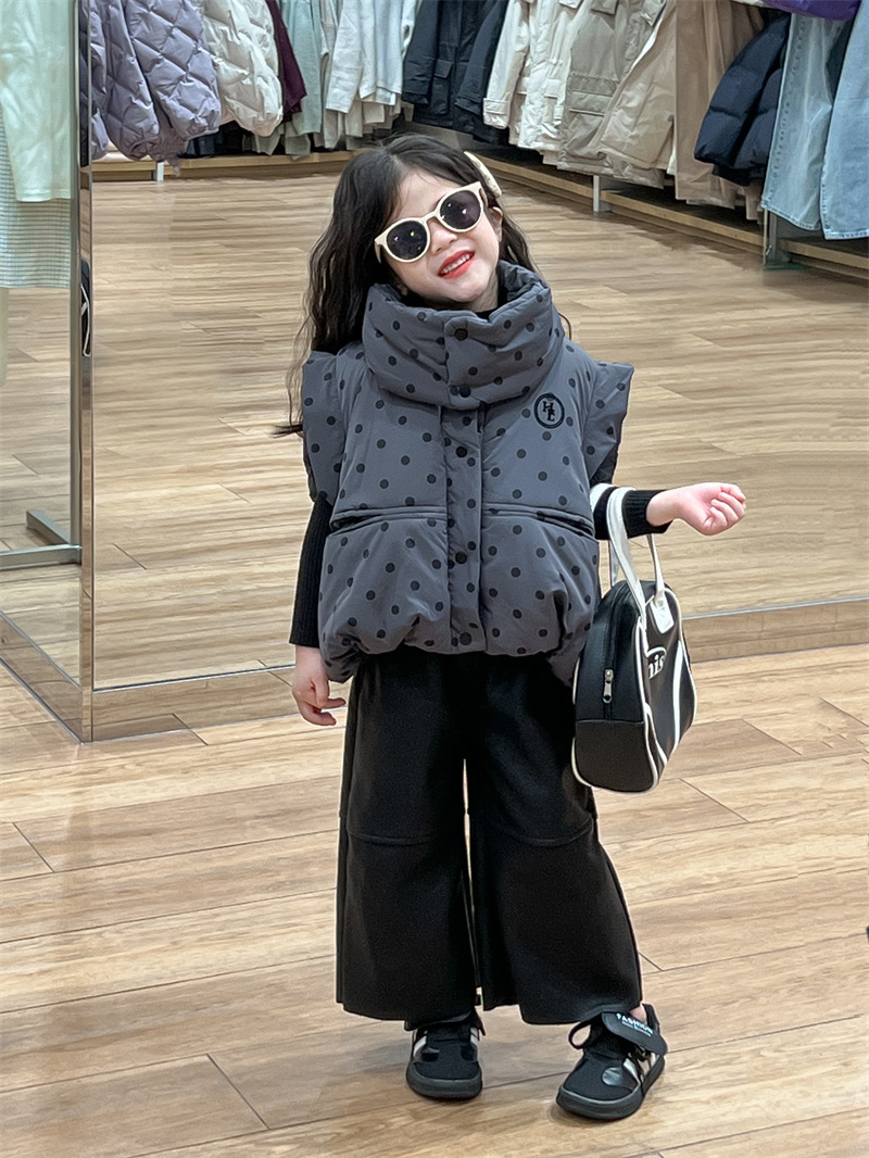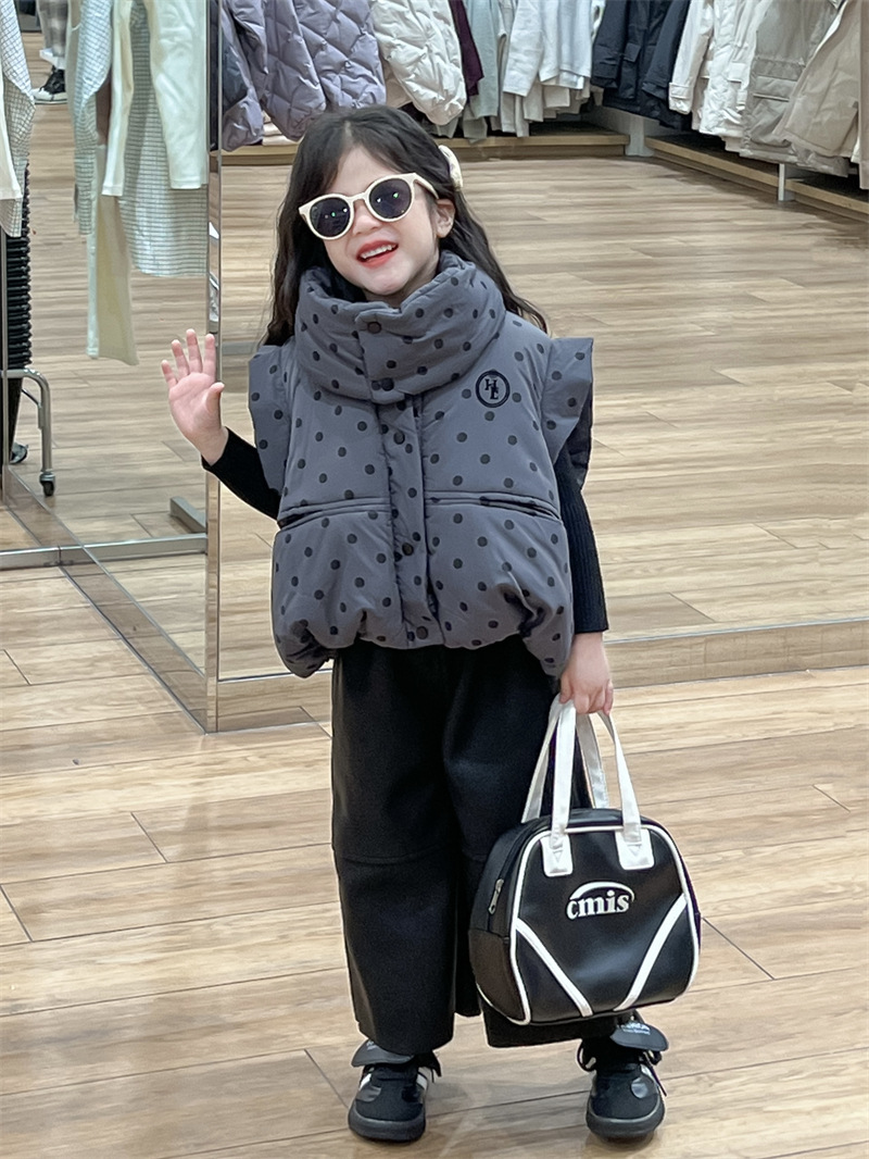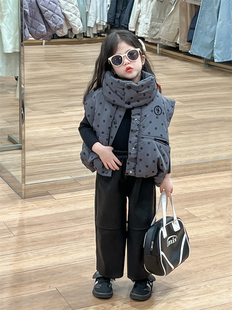 소녀 두꺼운 따뜻한 다운 코튼 그레이 하단 웨이브 도트 분리 가능한 스카프 겨울 비행 슬리브 웨어 조끼