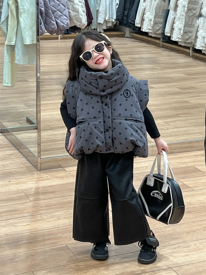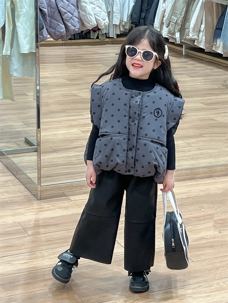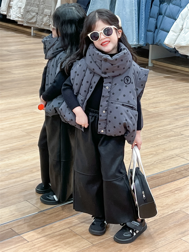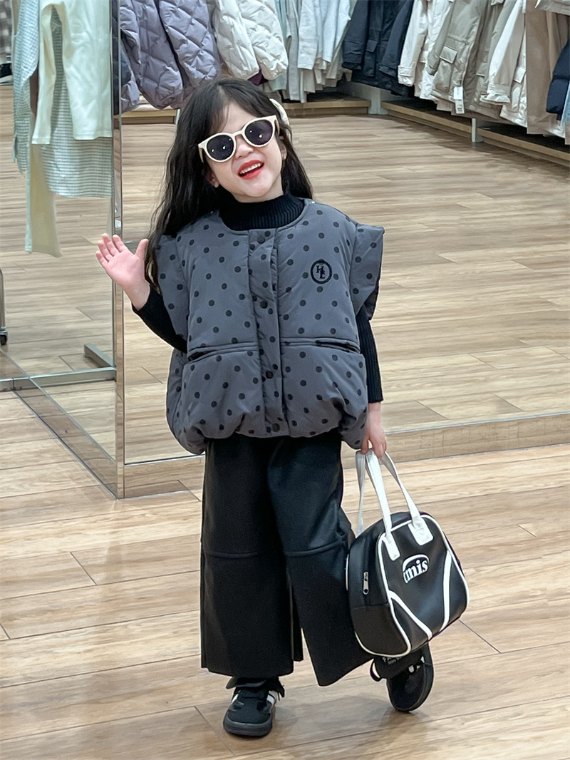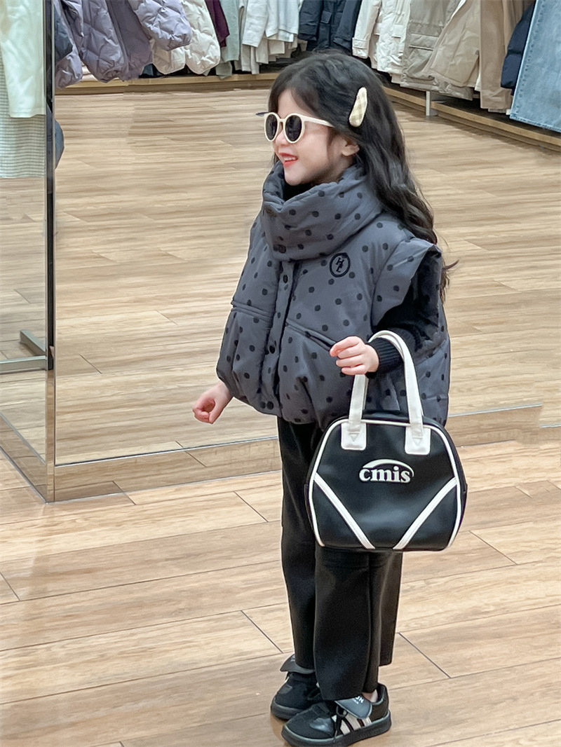 소녀 두꺼운 따뜻한 다운 코튼 그레이 하단 웨이브 도트 분리 가능한 스카프 겨울 비행 슬리브 웨어 조끼