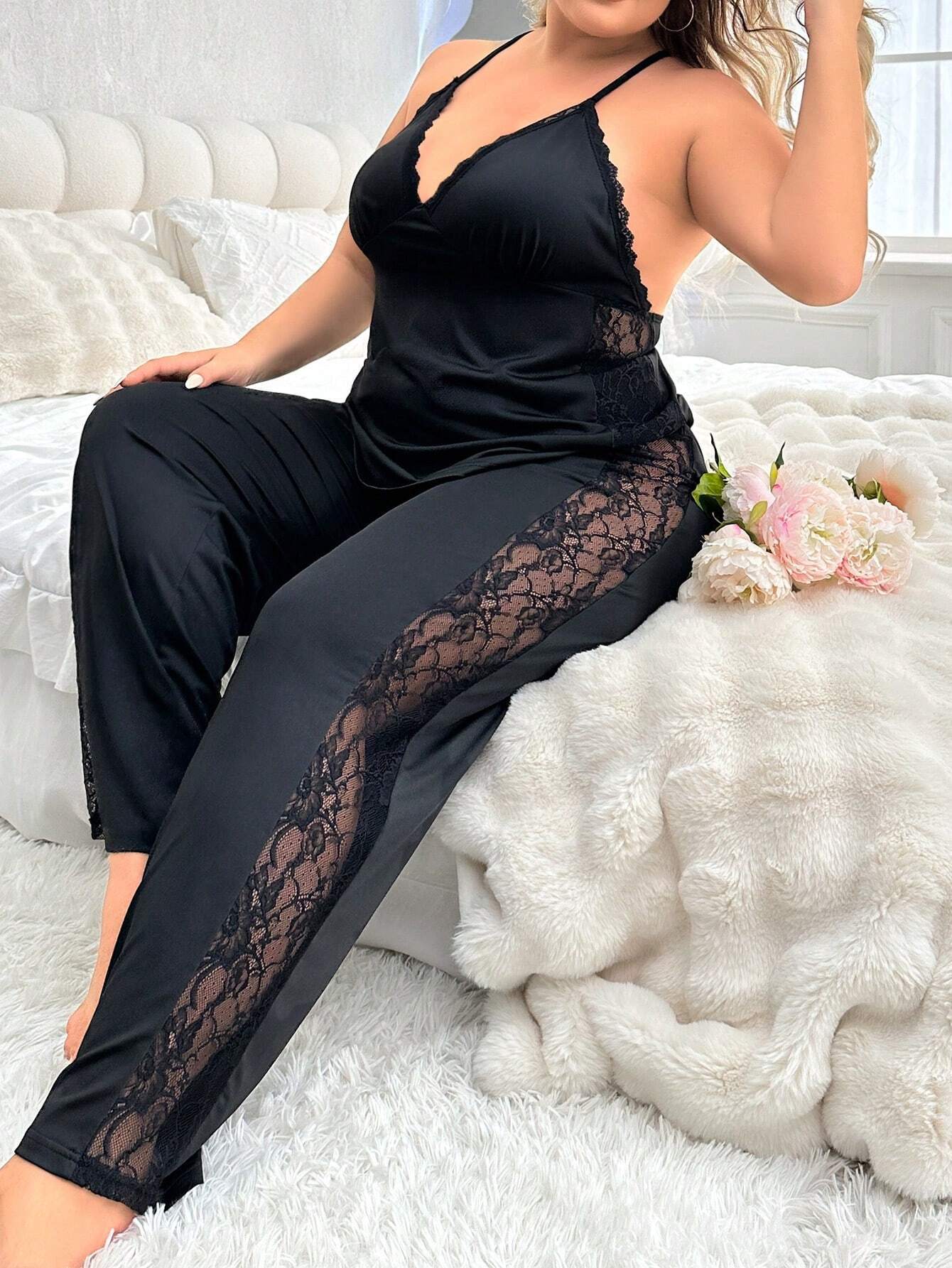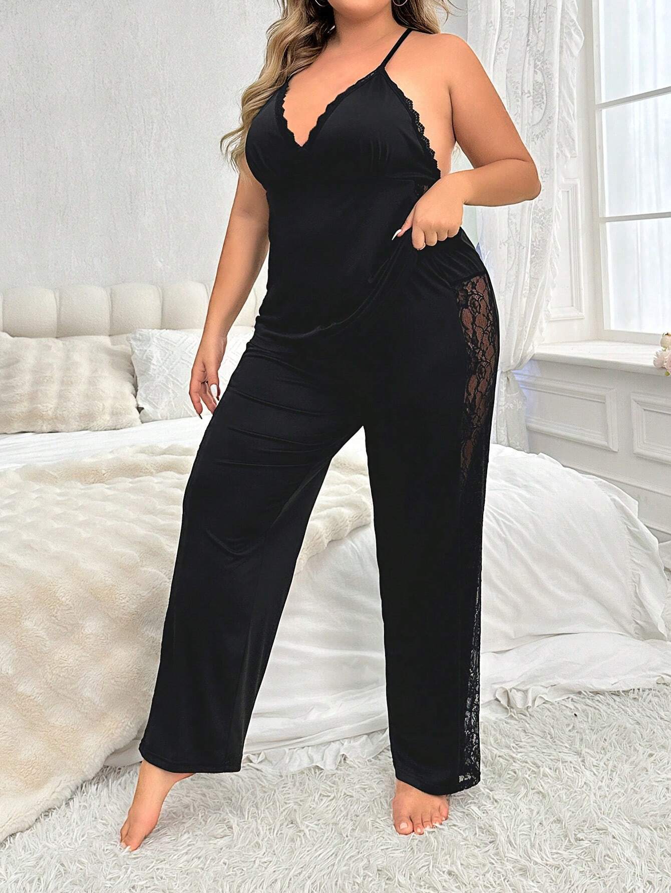 유럽과 미국의 국경 얇은 플러스 사이즈 단색 섹시한 홈 옷 슬링 레이스 바지 파자마 여성 세트 투피스 세트스토어 가기