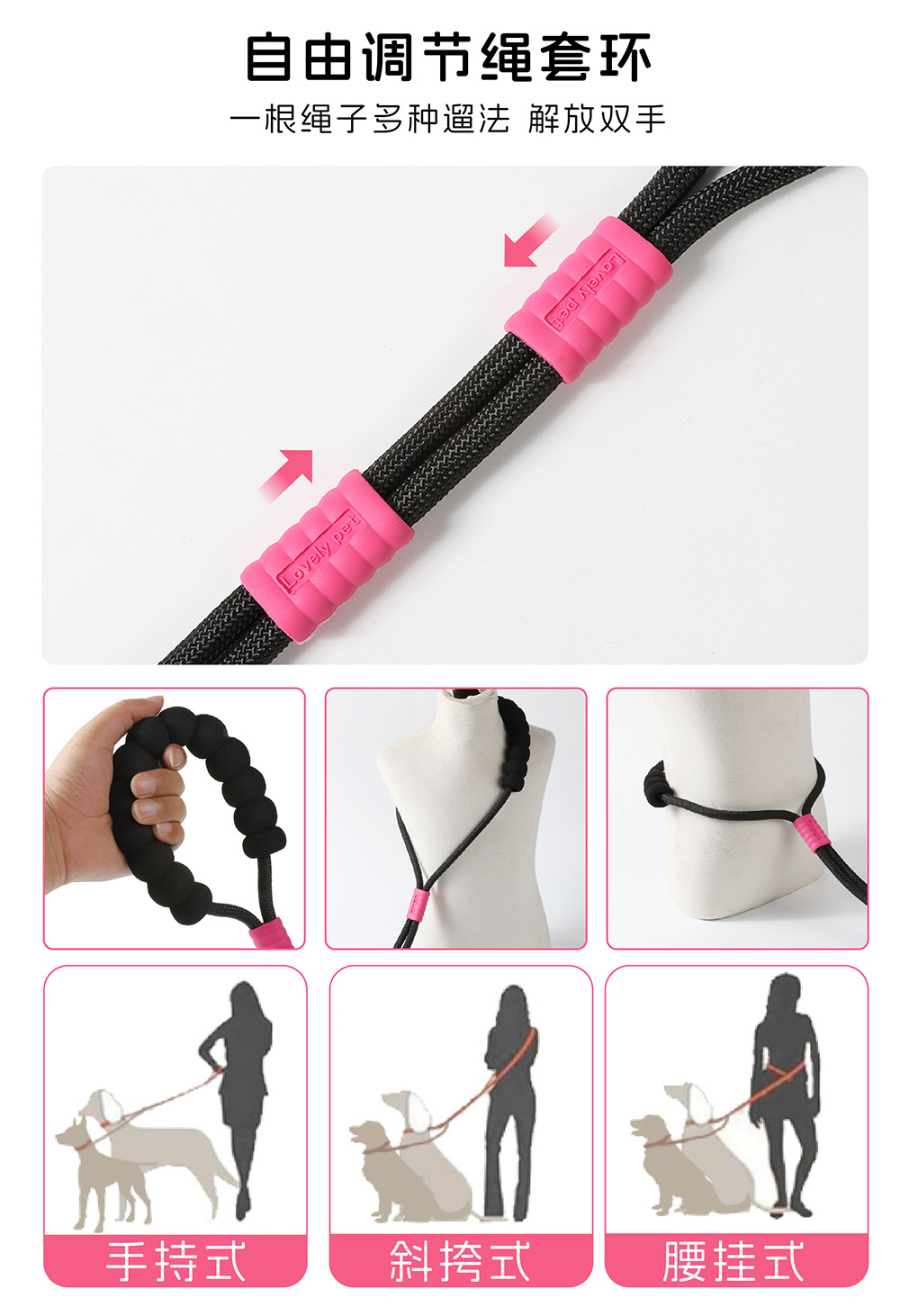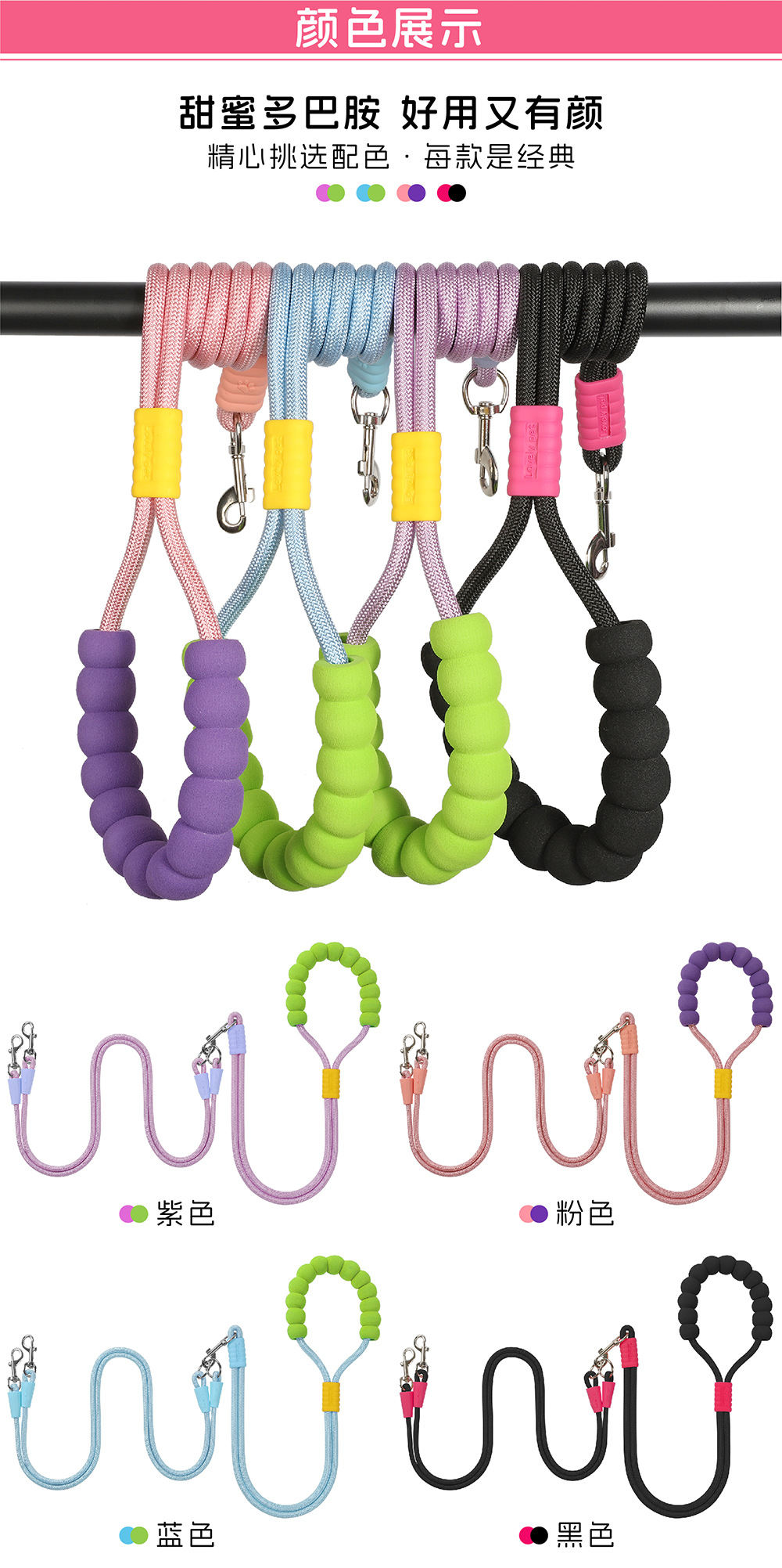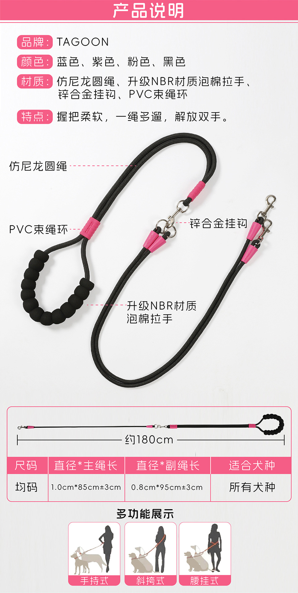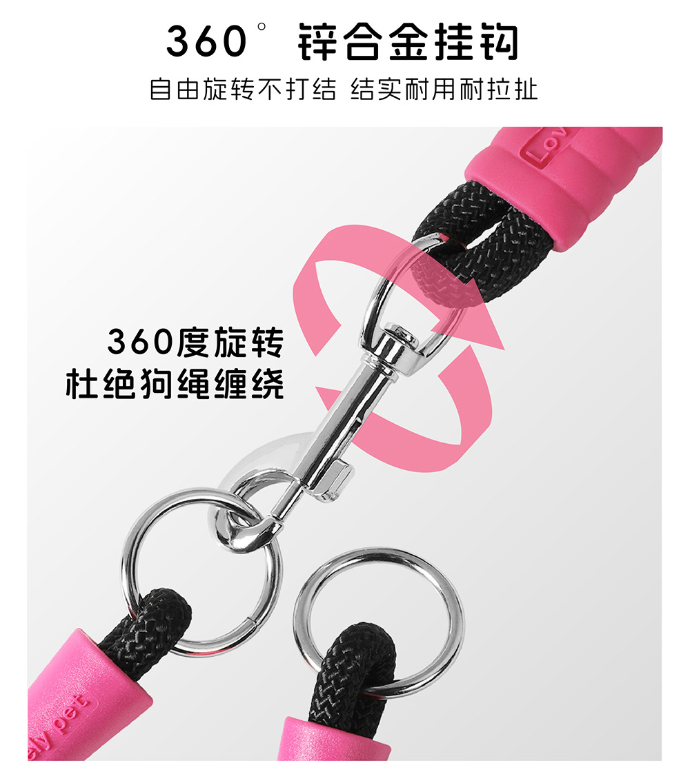 크로스 바디 애완 동물 가죽 끈 1 대 2 도파민 컬러 도그 워킹 로프 착용 방지 멀티 헤드 분리 가능한 개 가죽 끈