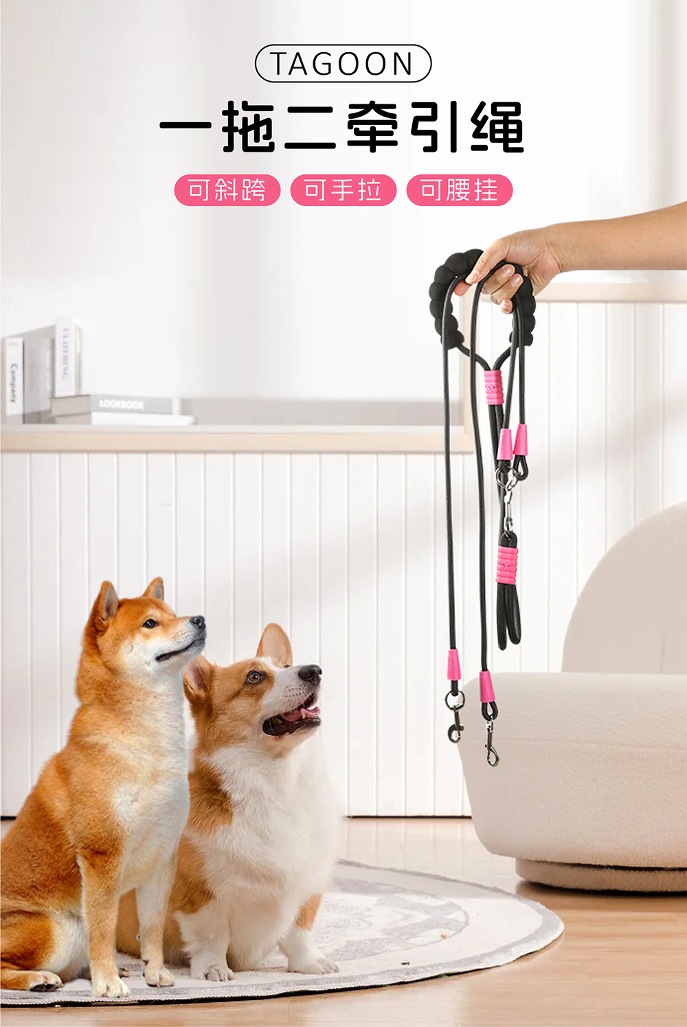 크로스 바디 애완 동물 가죽 끈 1 대 2 도파민 컬러 도그 워킹 로프 착용 방지 멀티 헤드 분리 가능한 개 가죽 끈스토어 가기