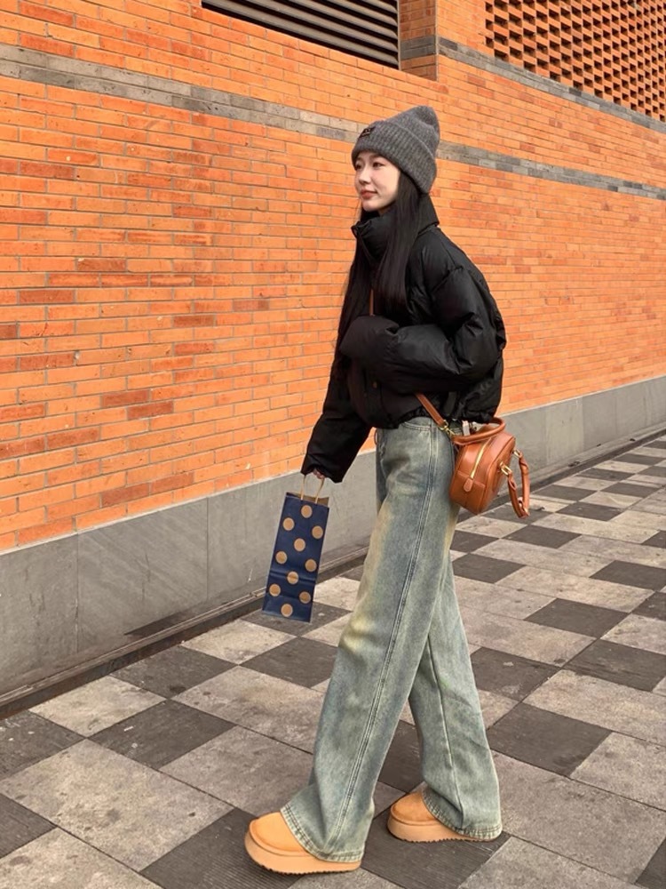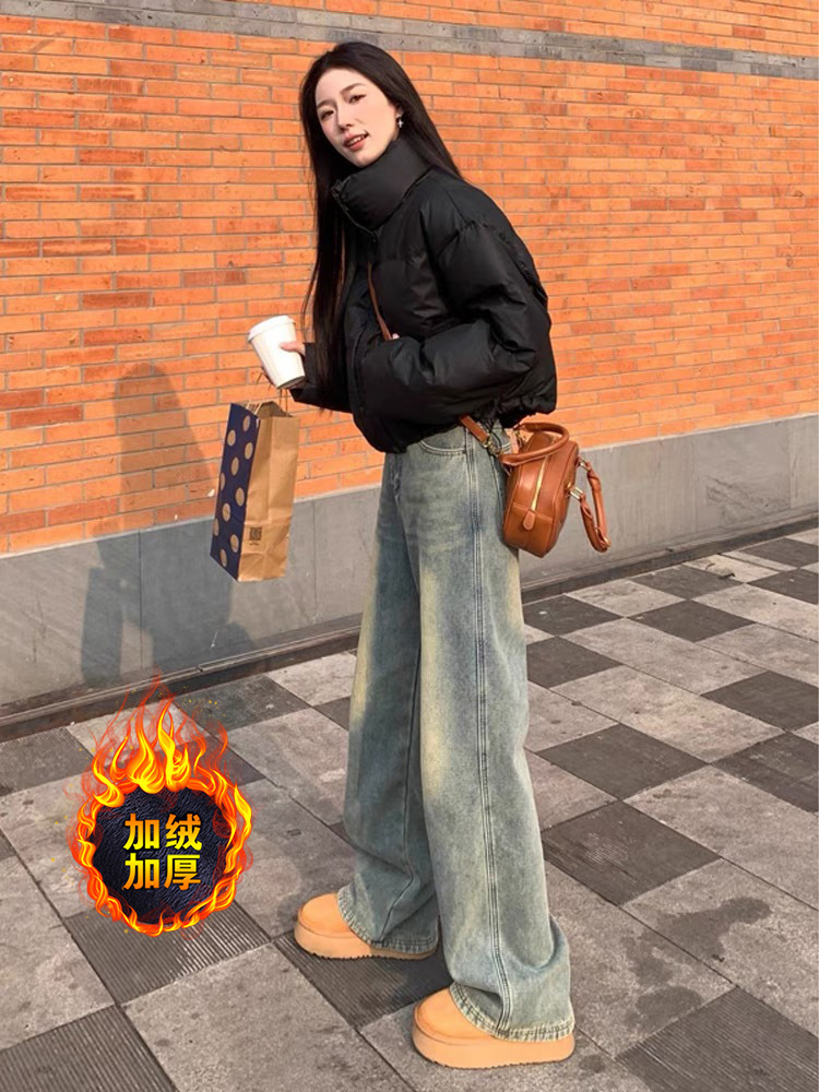 기모 두꺼운 아메리칸 스타일 레트로 스트레이트 레그 청바지 여성의 가을과 겨울 2024 새로운 느슨한 슬리밍 좁은 넓은 다리 바지스토어 가기