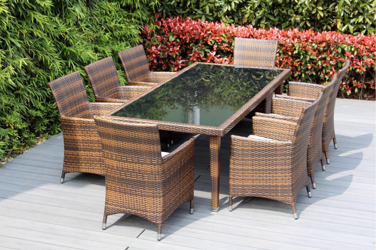 • 카키색 플라스틱 목재 표면, 테이블 1개, 의자 8개
