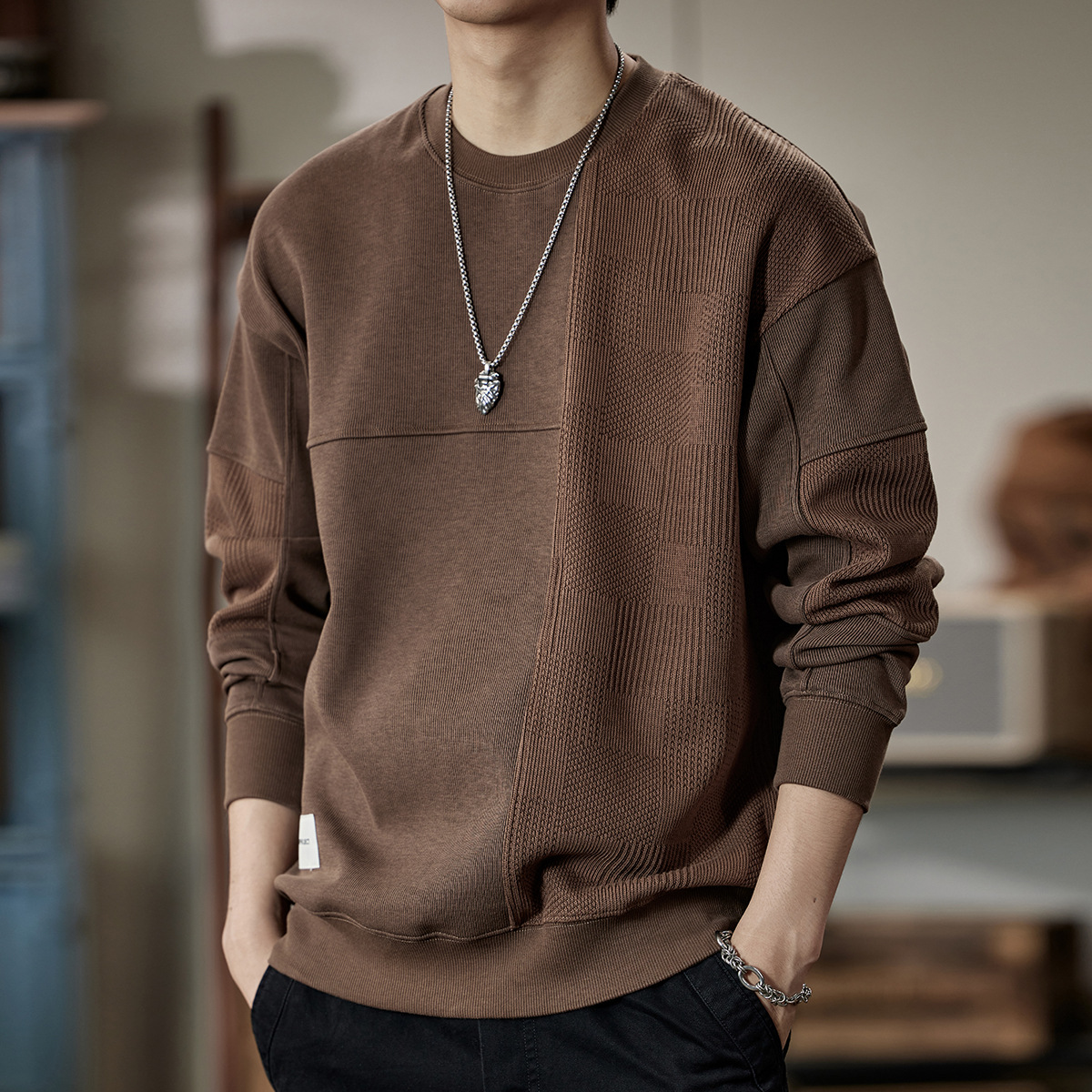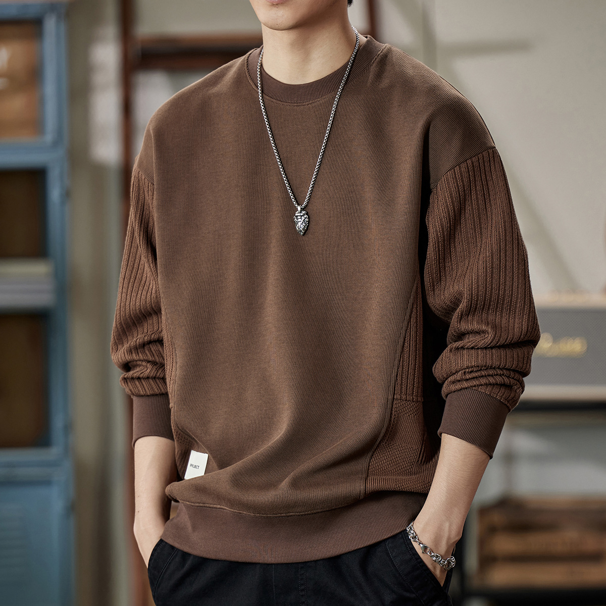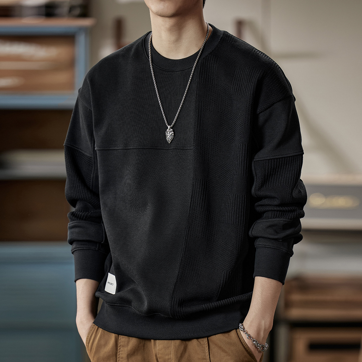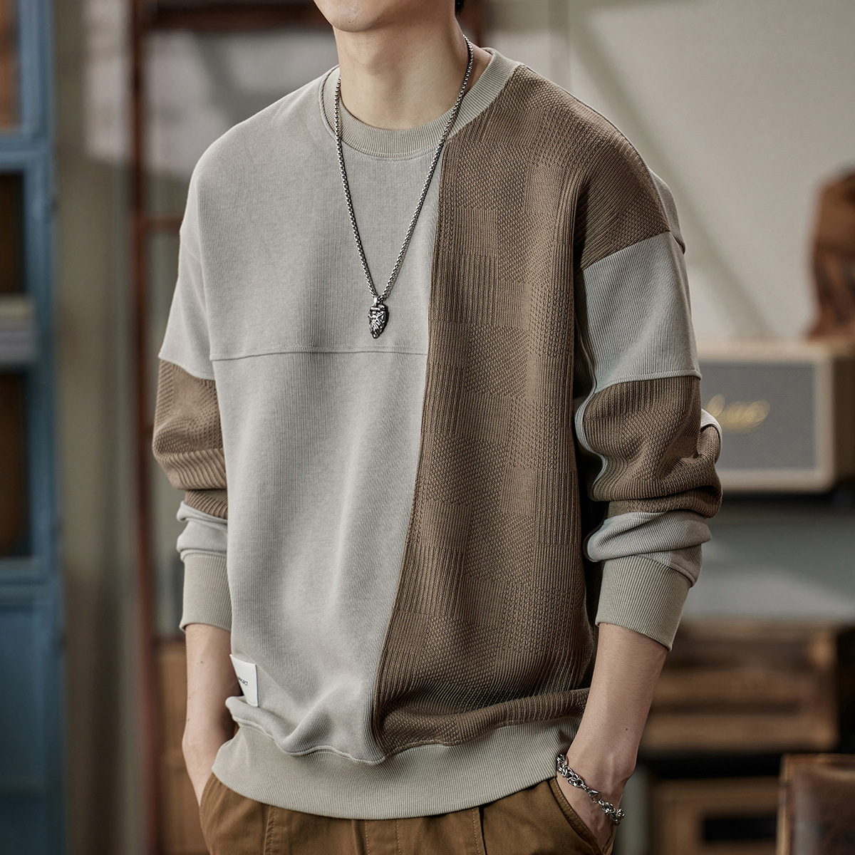 잘 생긴 베이지 색 스웨터 남자의 가을과 겨울 2024 느슨한베이스 셔츠 바느질 후드 긴 소매 최고 가을스토어 가기