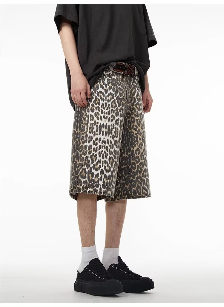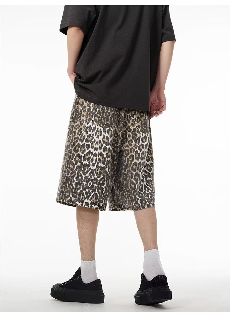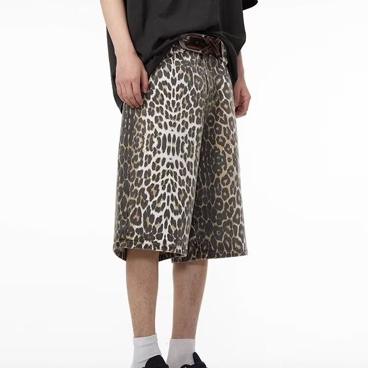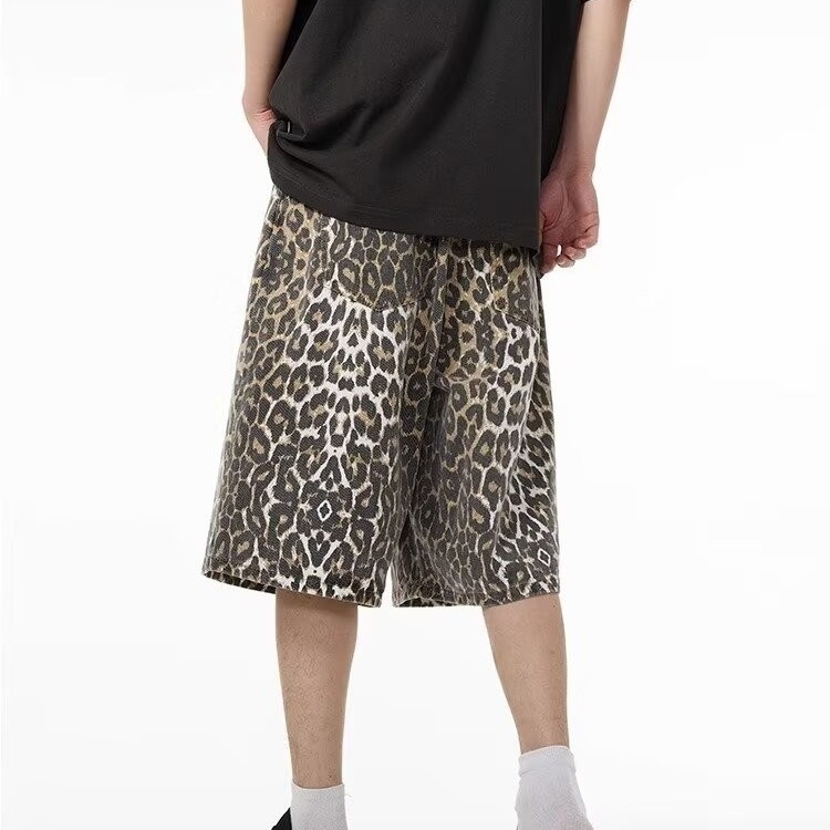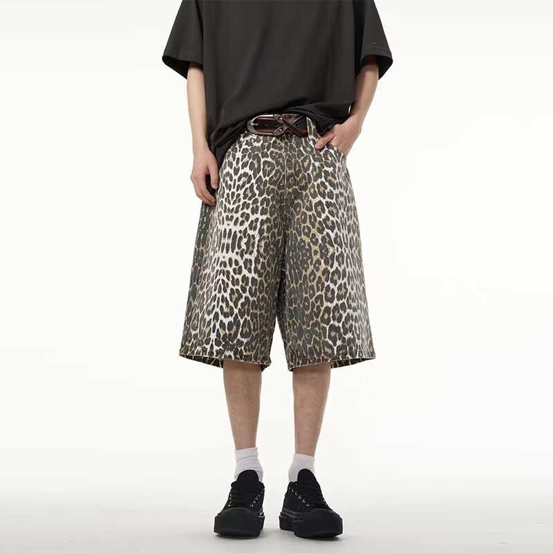 여름 아메리칸 스타일 레트로 와이드 레오파드 무늬 데님 반바지 남성 디자인 센스 틈새 캐주얼 루즈 스트레이트 바지스토어 가기