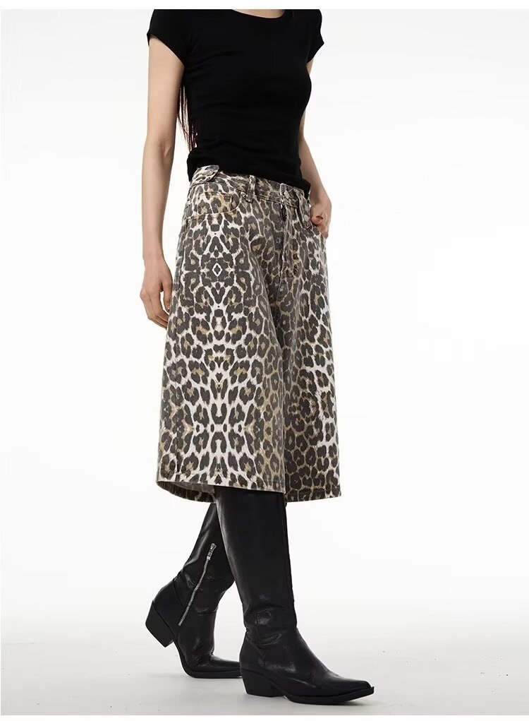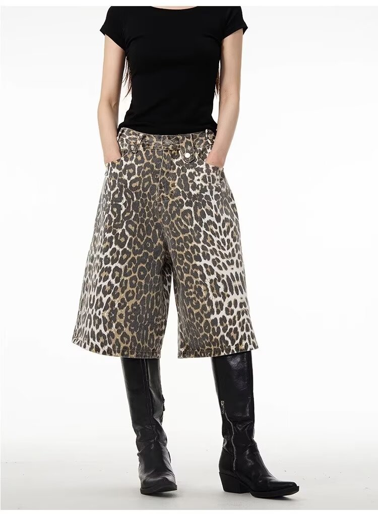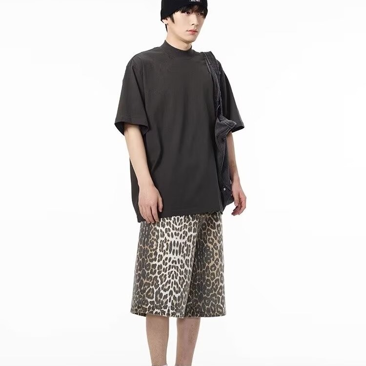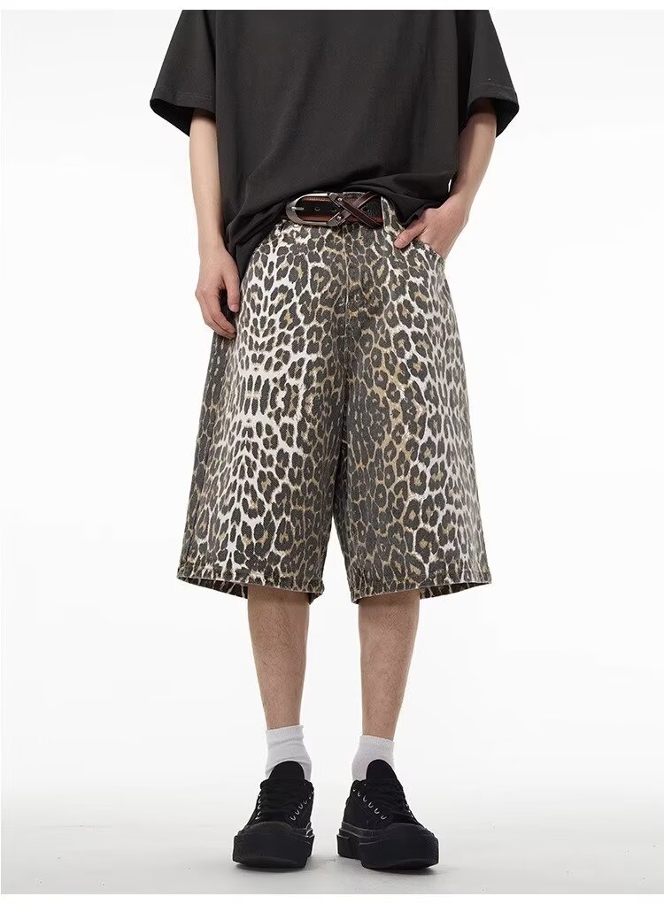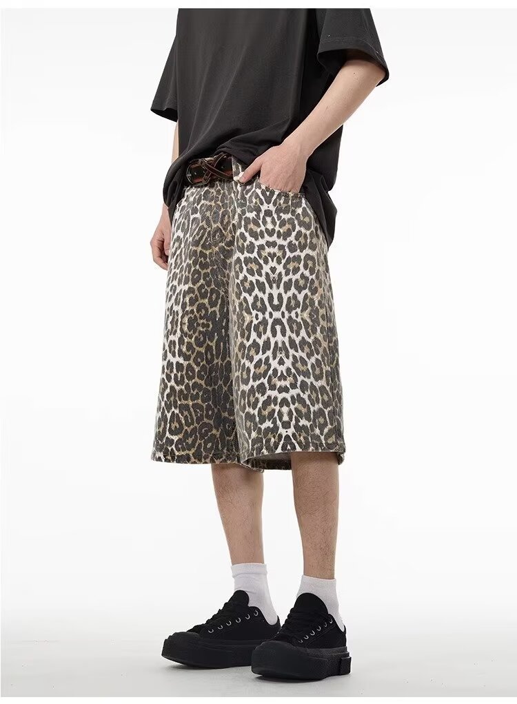 여름 아메리칸 스타일 레트로 와이드 레오파드 무늬 데님 반바지 남성 디자인 센스 틈새 캐주얼 루즈 스트레이트 바지스토어 가기