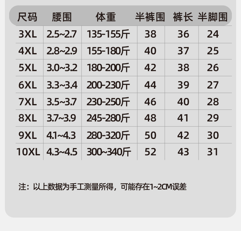 • 10XL은 150-165kg 사이즈에 맞습니다