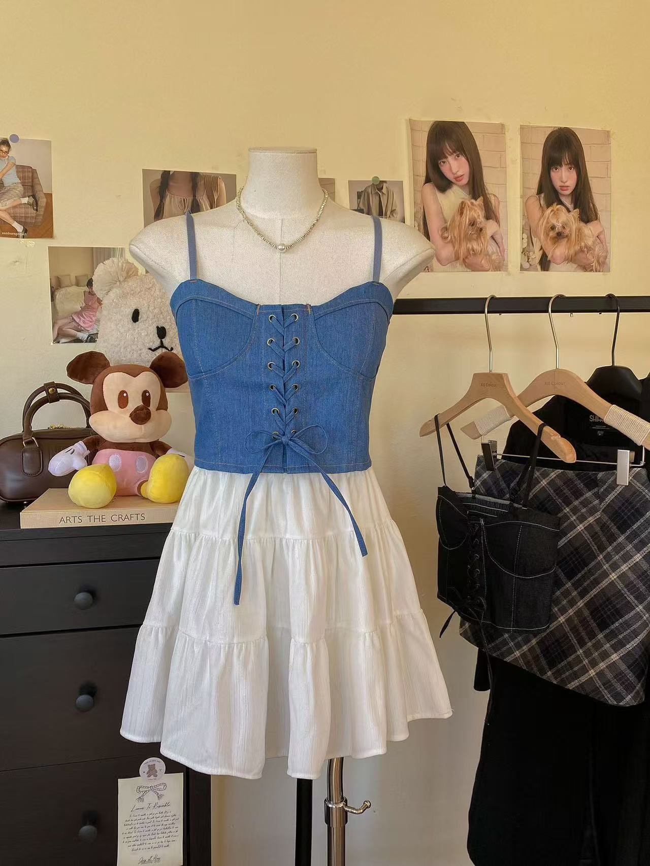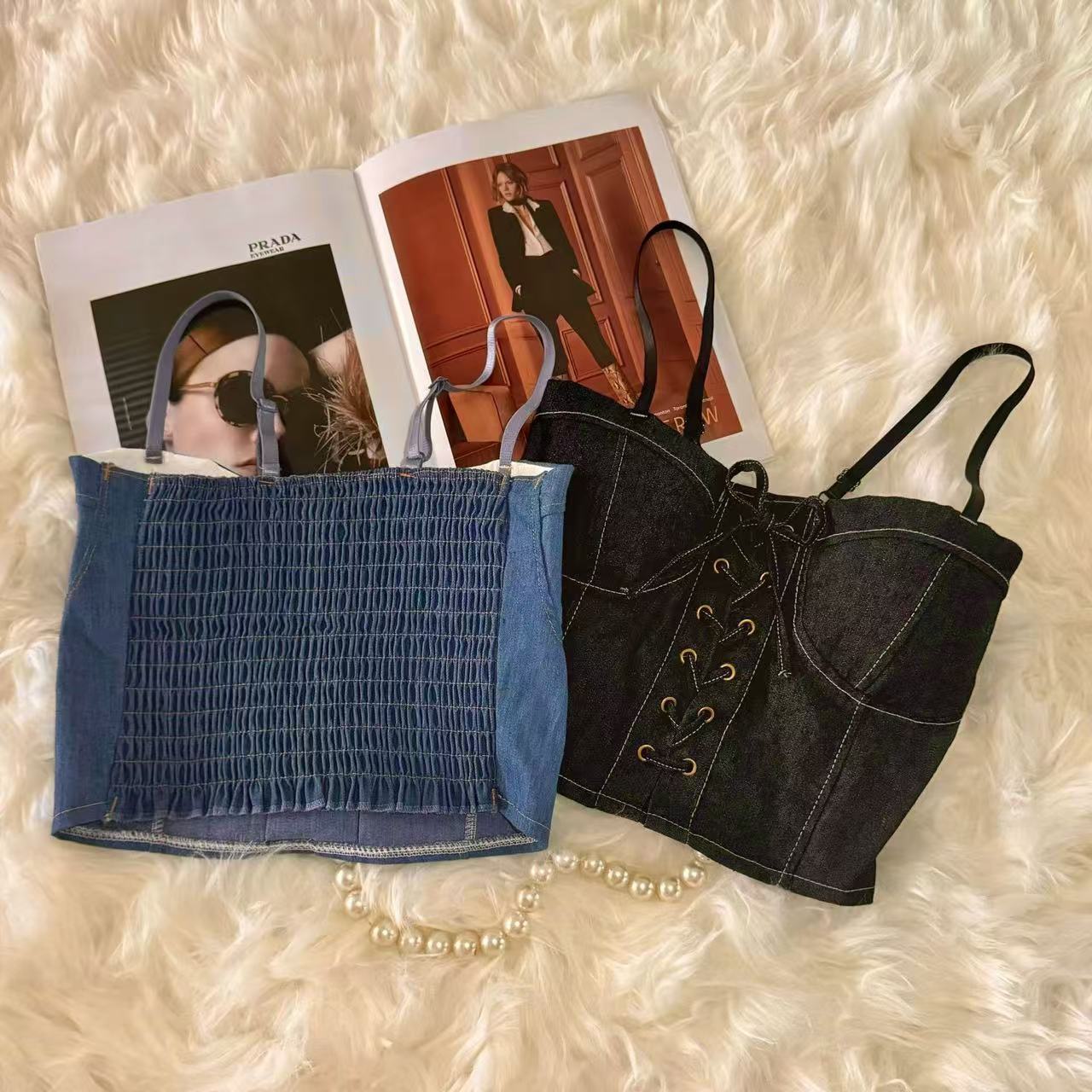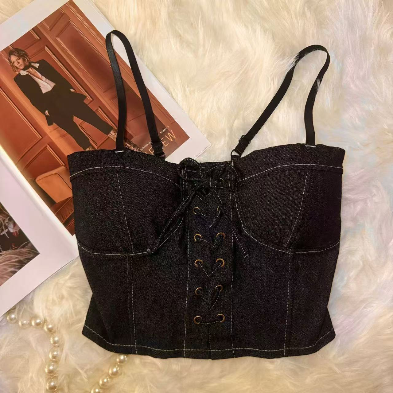 새로운 Bow Tie Drawstring 짧은 데님 가슴 패드 작은 Camisole Vest 틈새 올매치 랩 가슴 아름다운 뒤