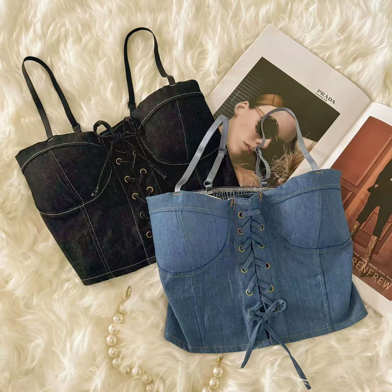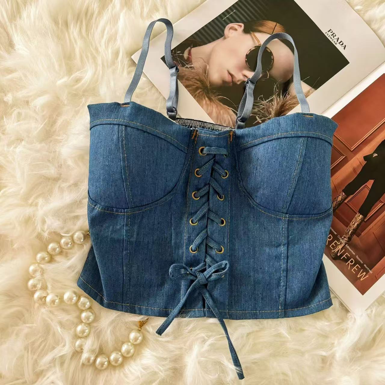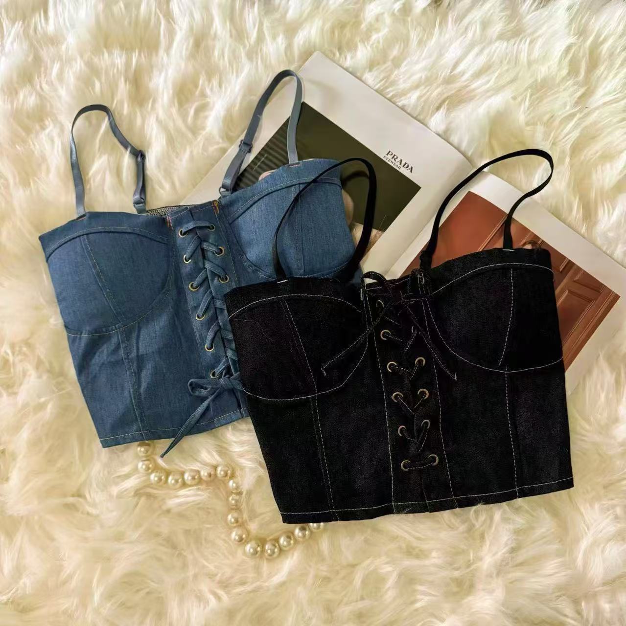 새로운 Bow Tie Drawstring 짧은 데님 가슴 패드 작은 Camisole Vest 틈새 올매치 랩 가슴 아름다운 뒤스토어 가기