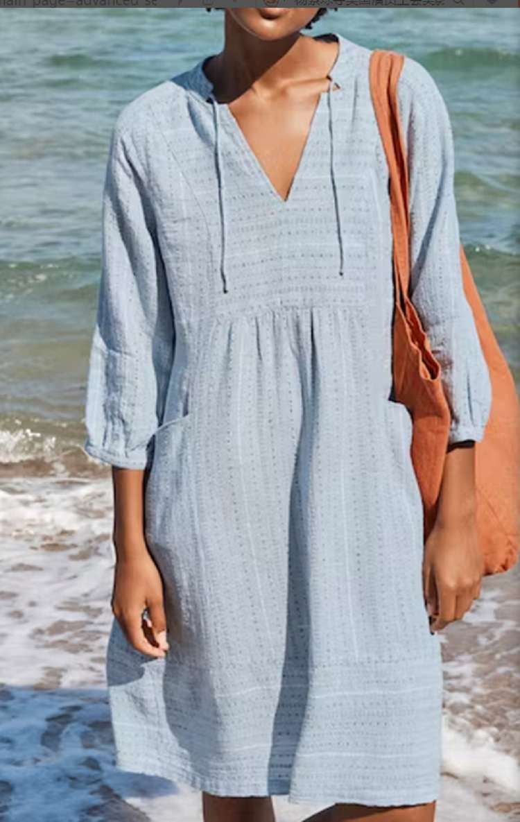 2025년 봄 유럽 및 미국 신상 자카드 면마 원피스 아마존 인기상품 브이넥 캐주얼 루즈핏 포켓 우아함