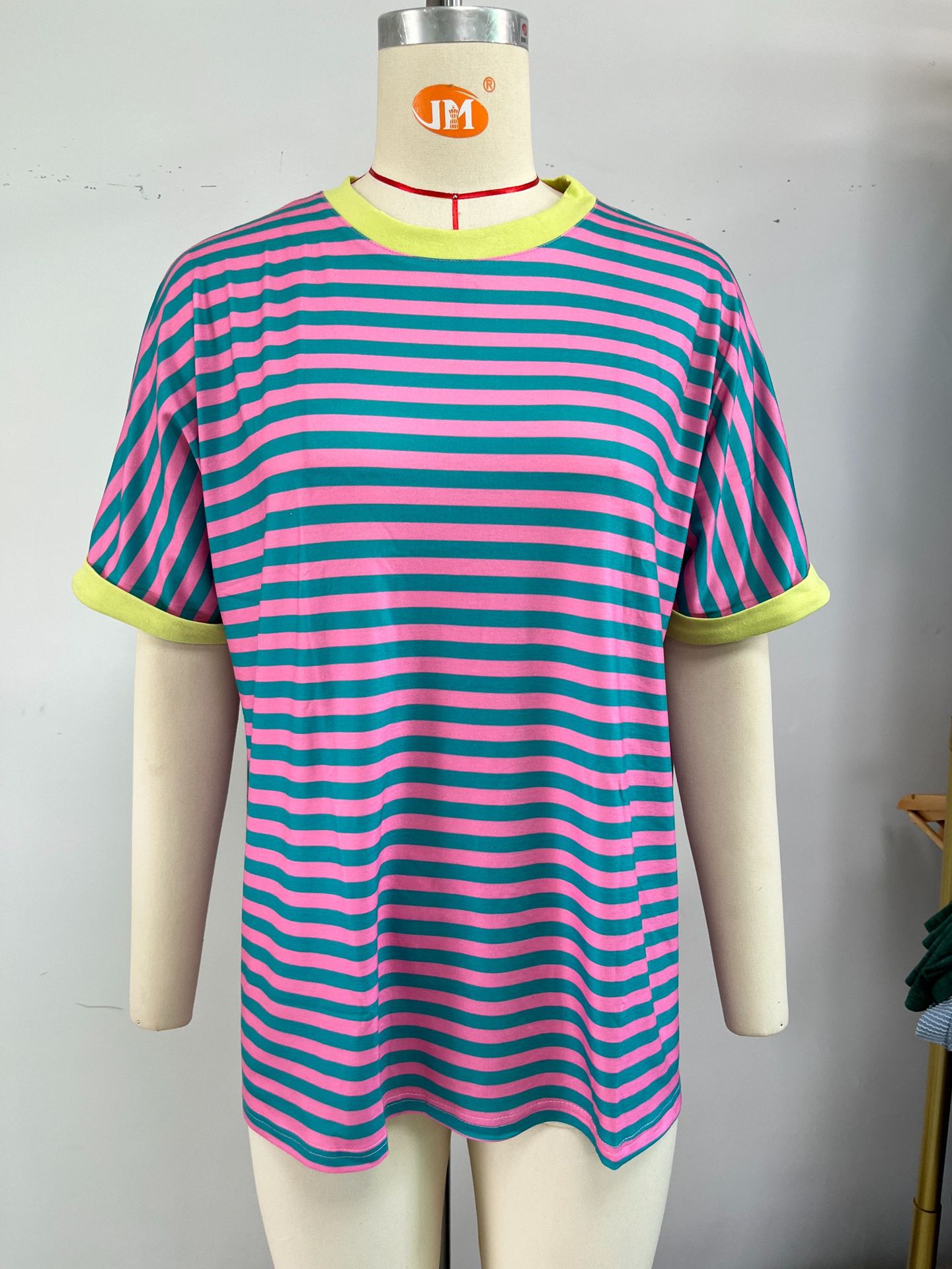 아마존 2025 유럽과 미국 국경 대외 무역 봄과 여름 새로운 줄무늬 색상 대비 둥근 목 느슨한 짧은 소매 티셔츠 재킷
