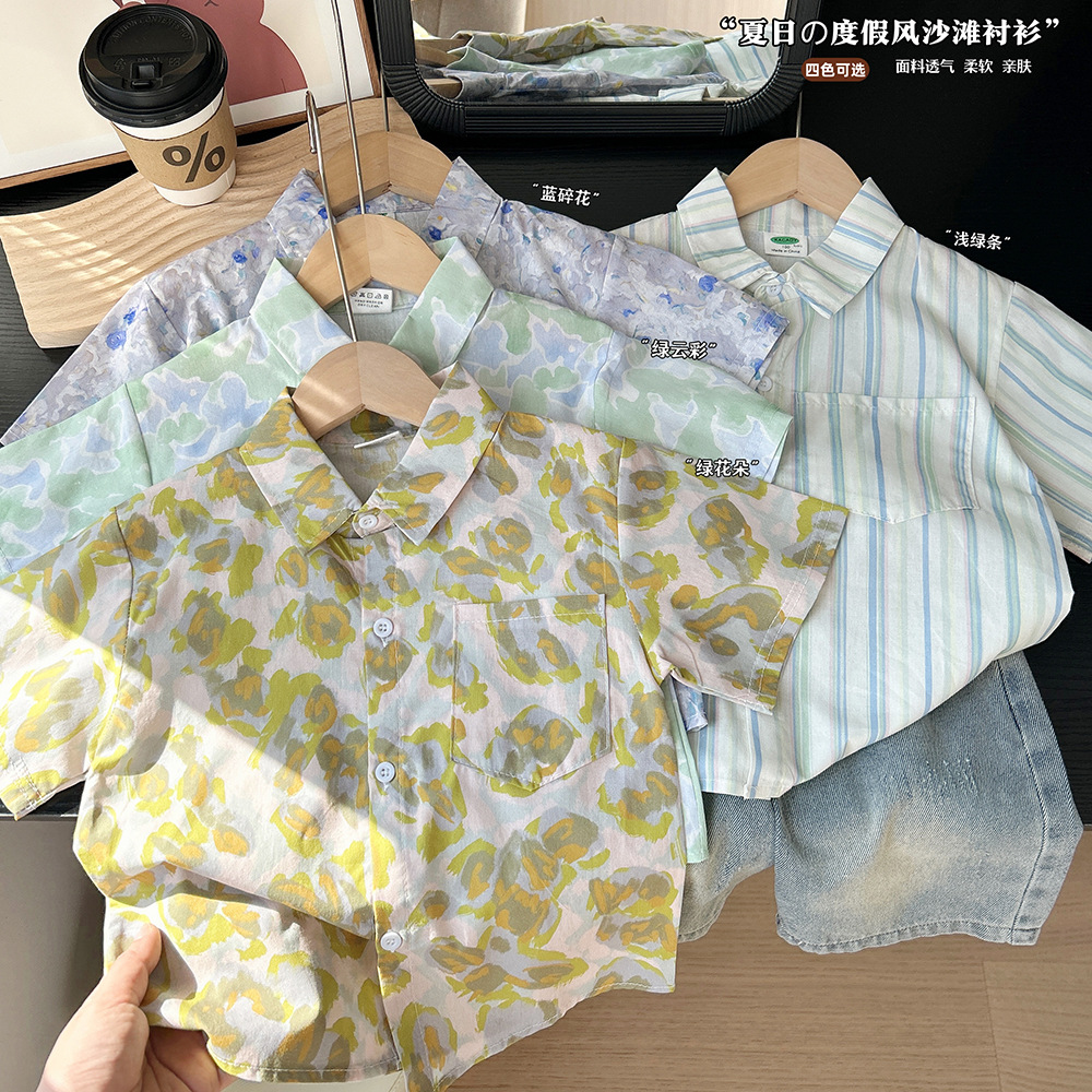 2025 여름 어린이 의류 해변 스타일 홍콩 스타일 꽃 셔츠 짧은 소매 휴가 스타일 짧은 소매 셔츠 재킷 도매스토어 가기