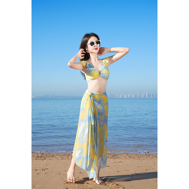 새로운 여성 스플릿 비키니 3 피스 세트 요정 에어 그물 레드 비킨 비치 온천 휴가 수영복 여성 도매