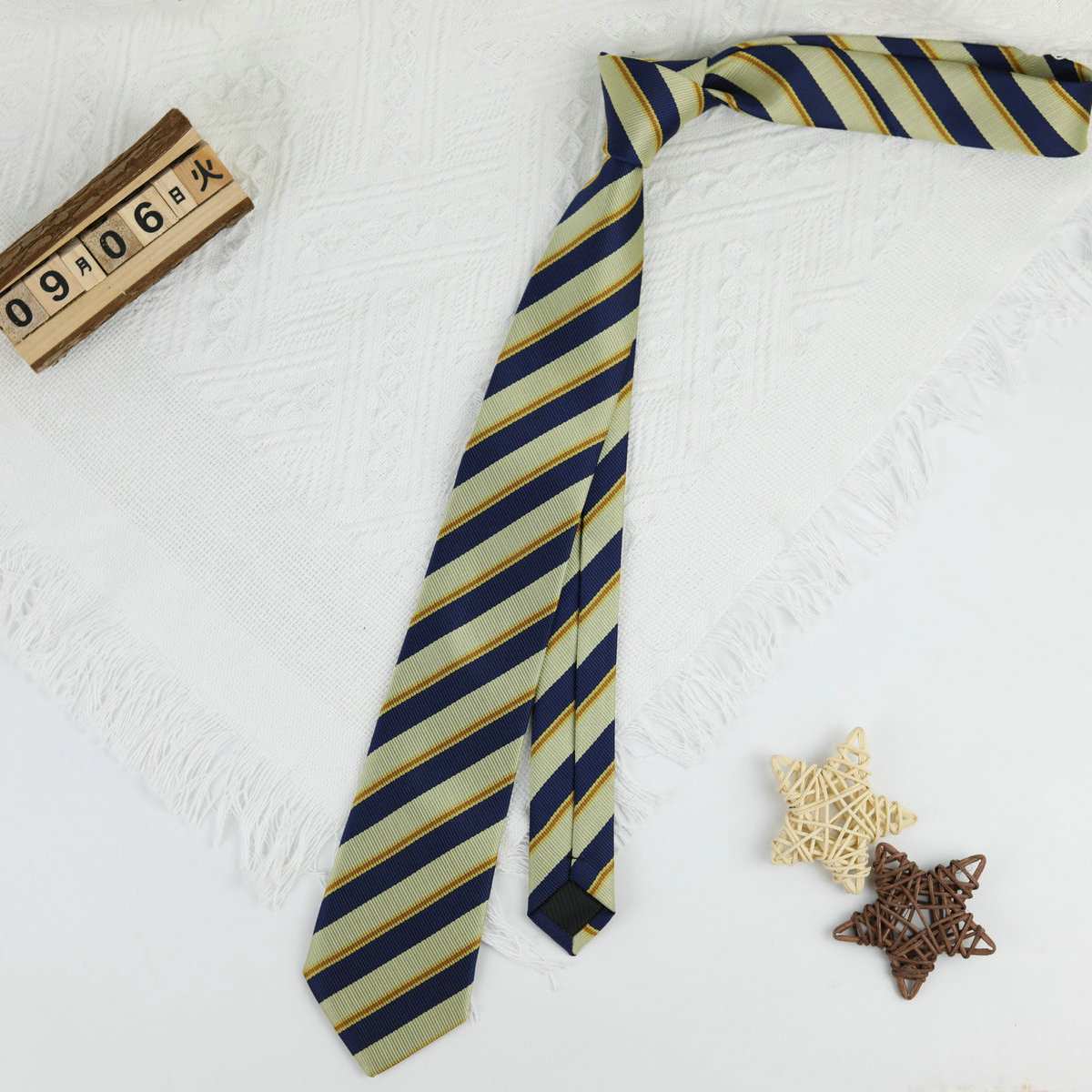 • 노란색 배경에 파란색 줄무늬 손 넥타이