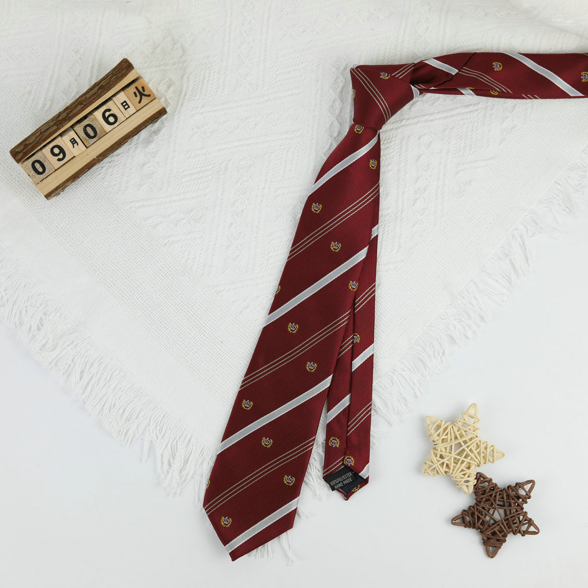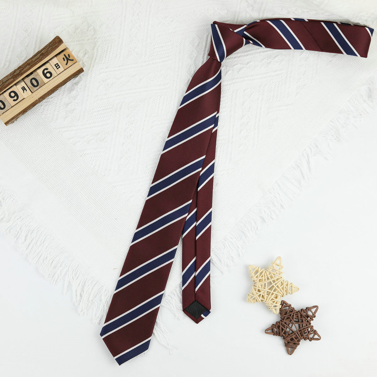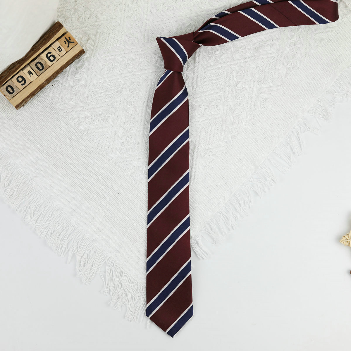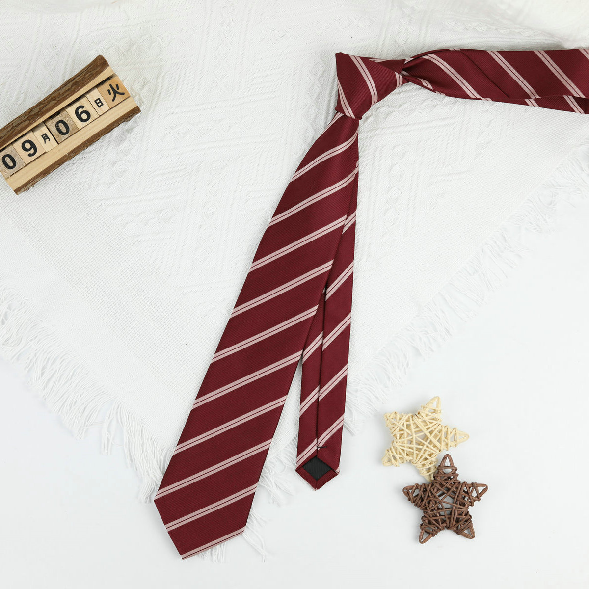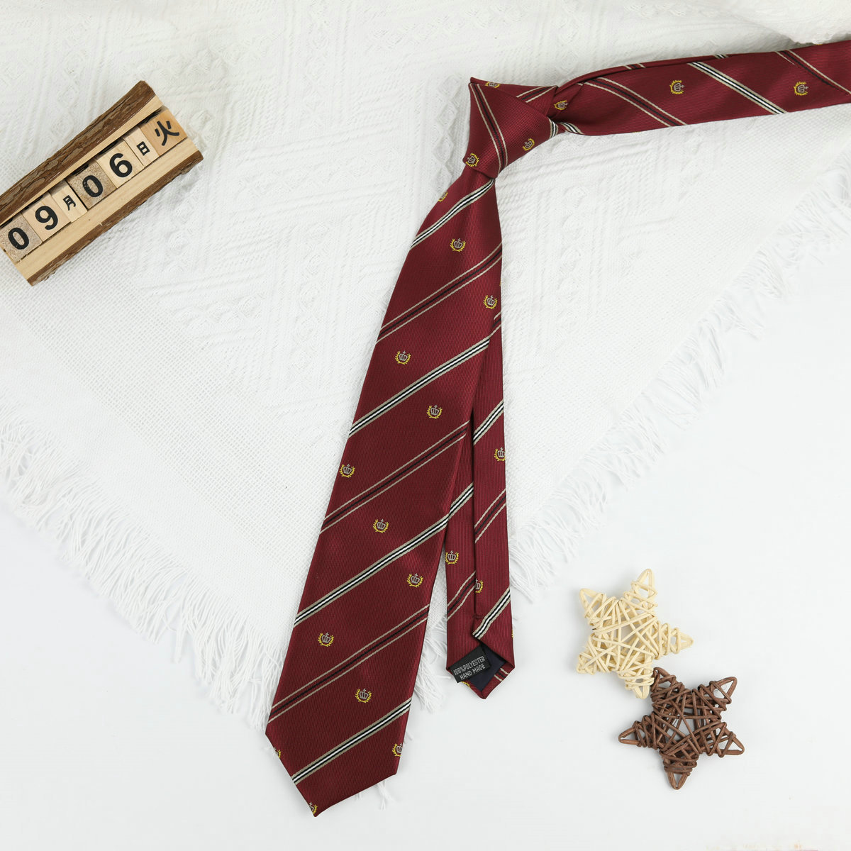 • 작은 왕관 버건디와 화이트 스트라이프 핸드 타이