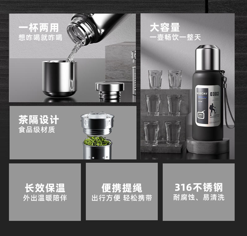 316 스테인레스 스틸 남성용 차와 물 분리 모든 강철 냄비 진공 절연 컵 대용량 야외 등산 두꺼운 물 컵