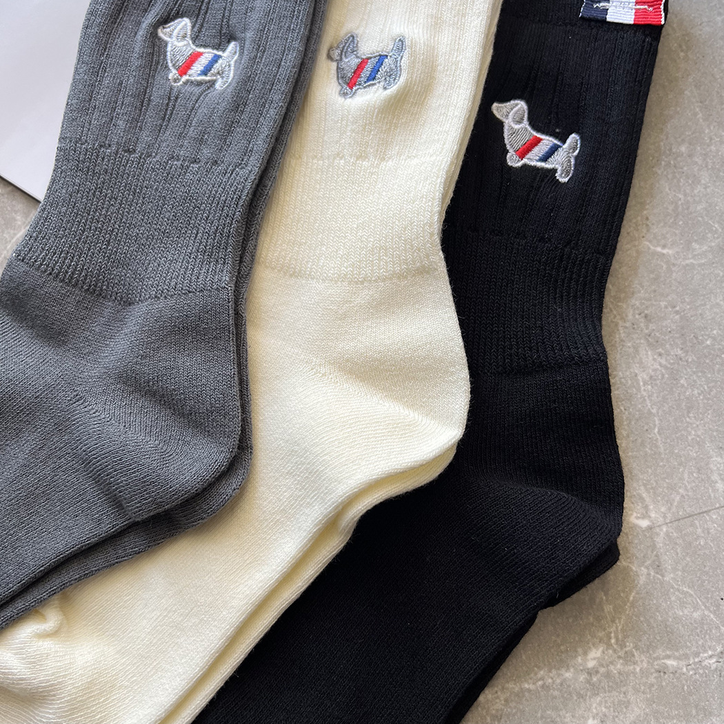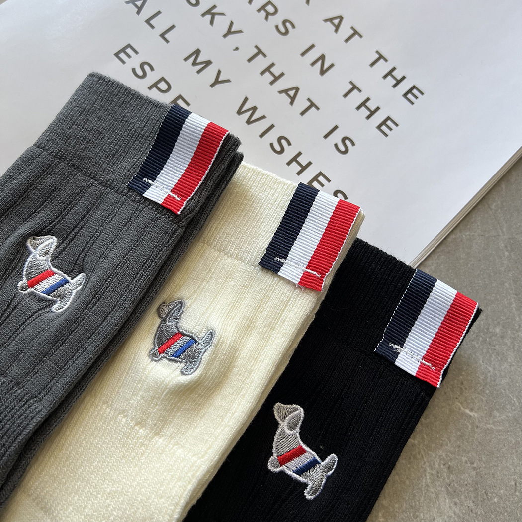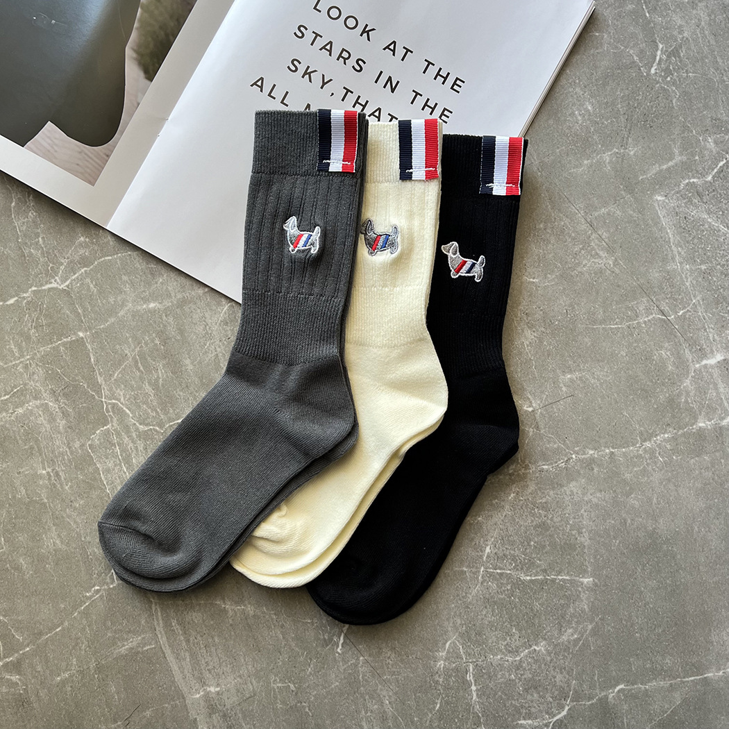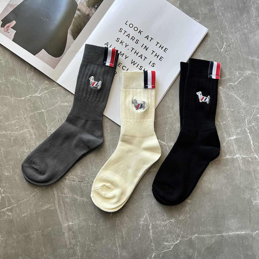 가을과 겨울 새로운 만화 TB 천 라벨 다리 쌓인 양말 영국 스타일 자수 강아지 빨강, 흰색 및 파랑 스트립 여성의 중간 길이 양말스토어 가기
