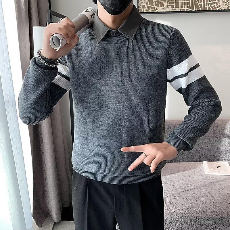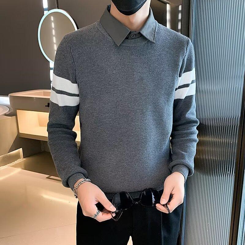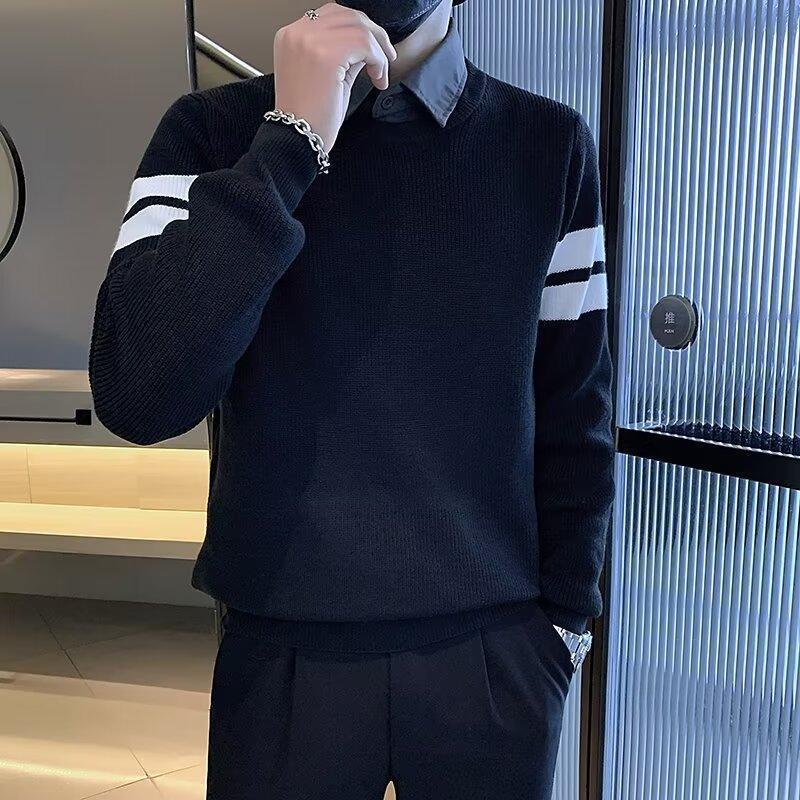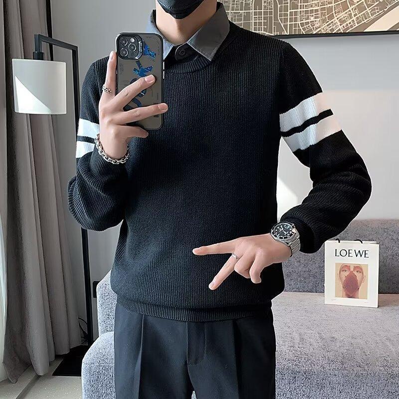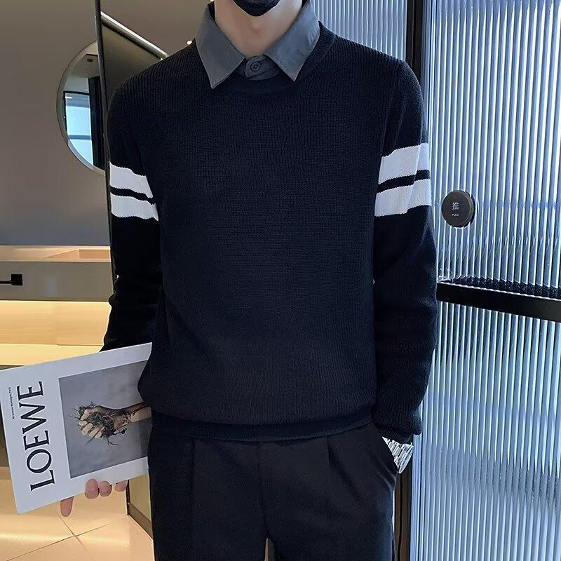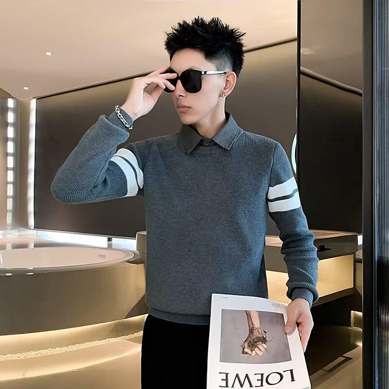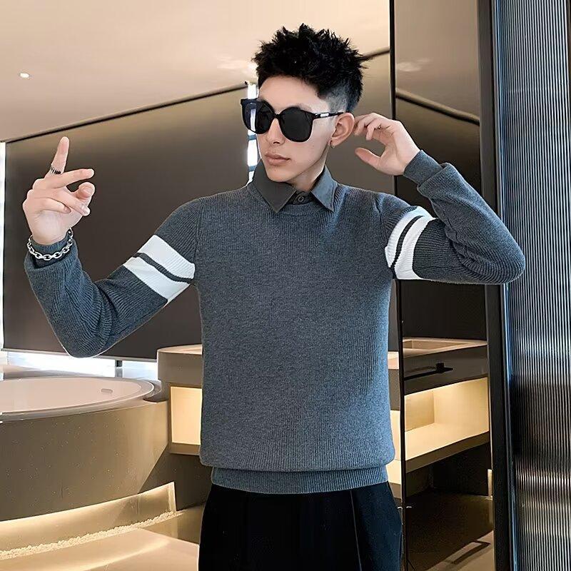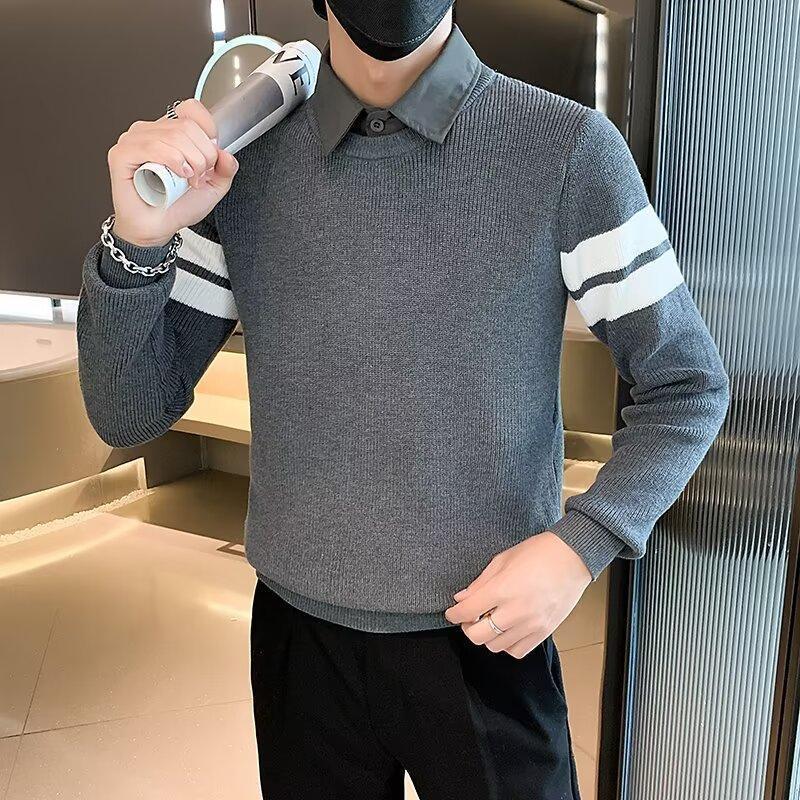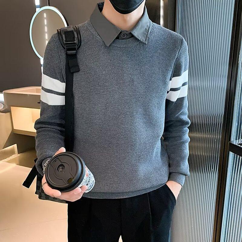 셔츠 칼라 가짜 투피스 스웨터 남자 2024 년 겨울 새 루즈 캐주얼 남성 니트웨어 캐주얼 탑스토어 가기