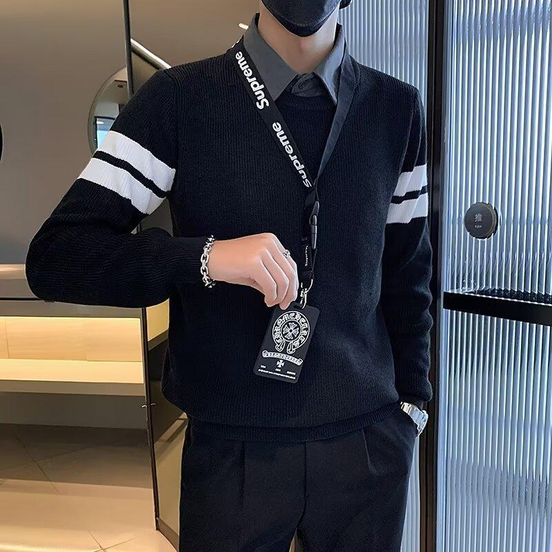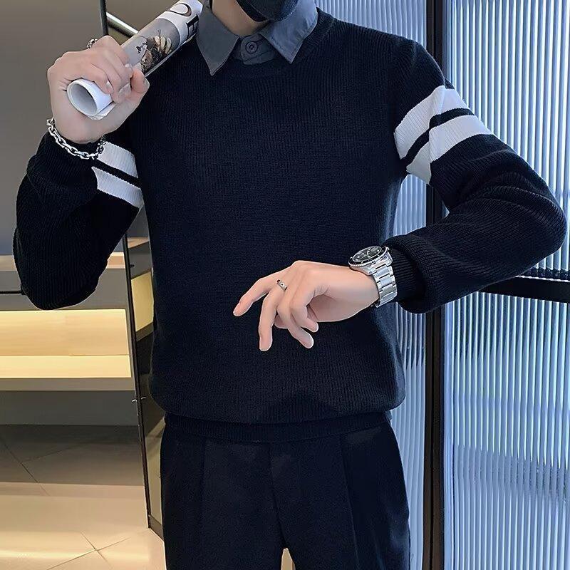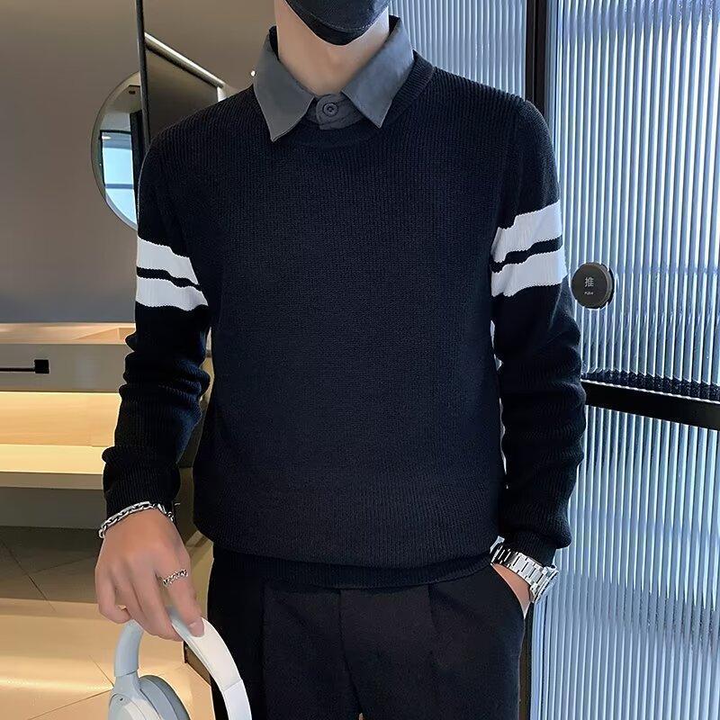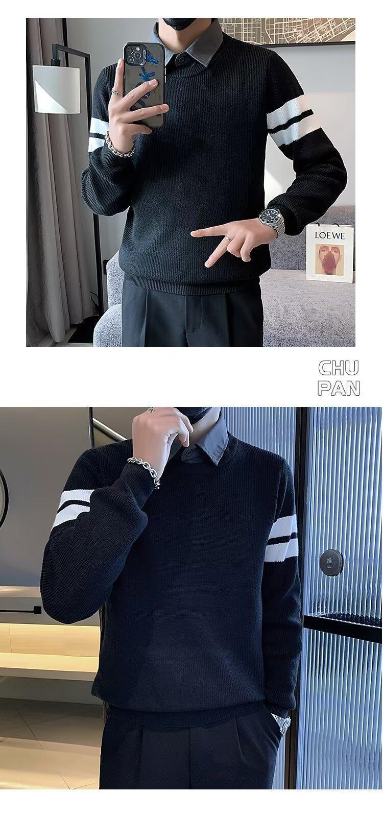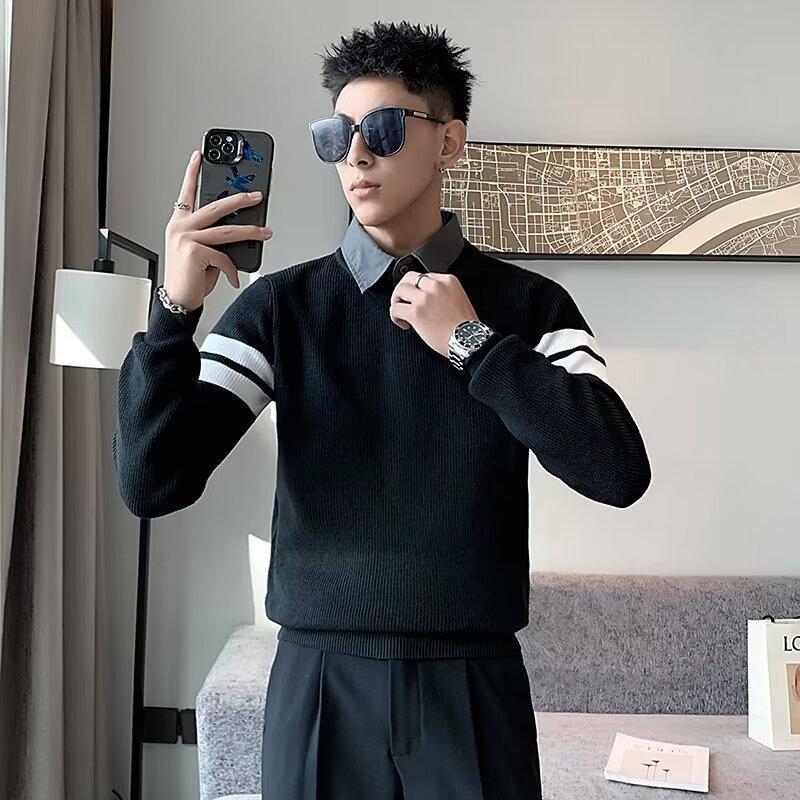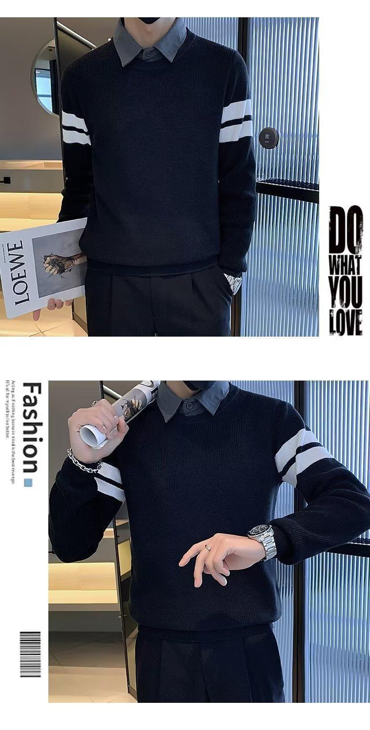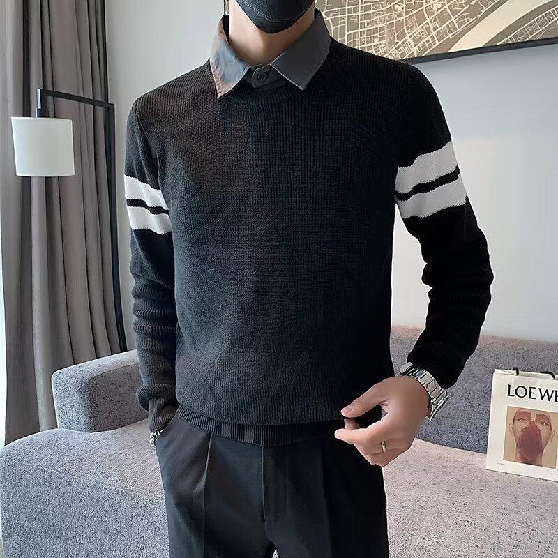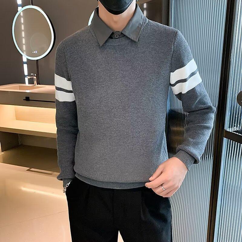 셔츠 칼라 가짜 투피스 스웨터 남자 2024 년 겨울 새 루즈 캐주얼 남성 니트웨어 캐주얼 탑스토어 가기