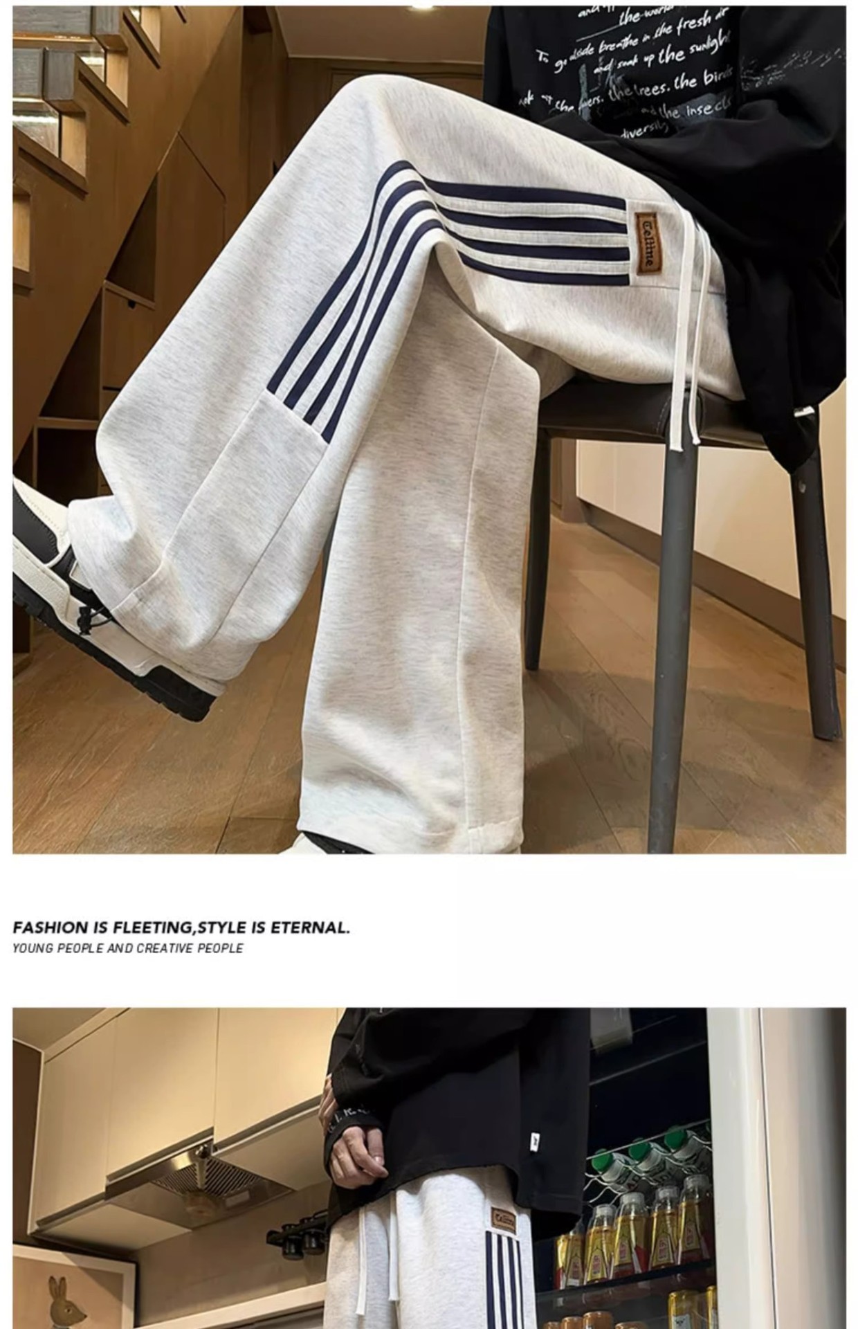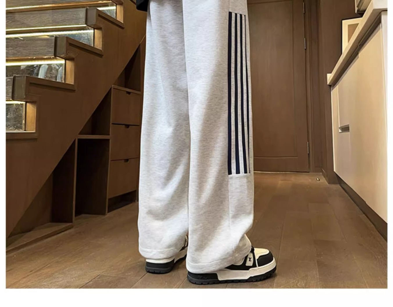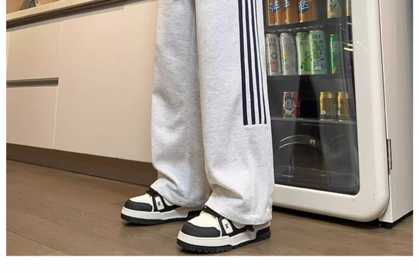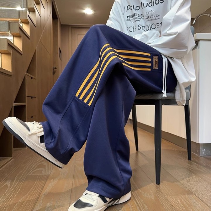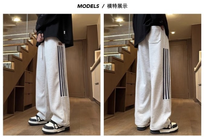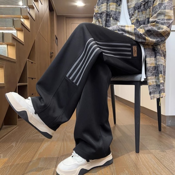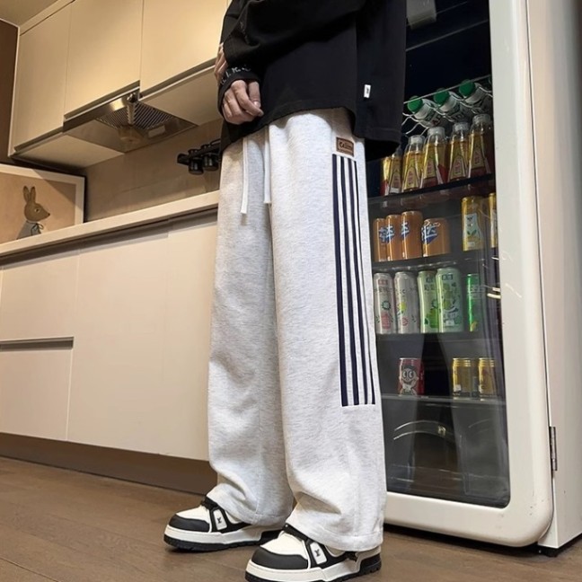 남성용 그레이 헤비웨이트 스포츠 팬츠, 봄, 가을 트렌디 브랜드 아메리칸 스리 스트라이프 캐주얼 팬츠, 루즈한 청소년 스트레이트 스웨트팬츠스토어 가기