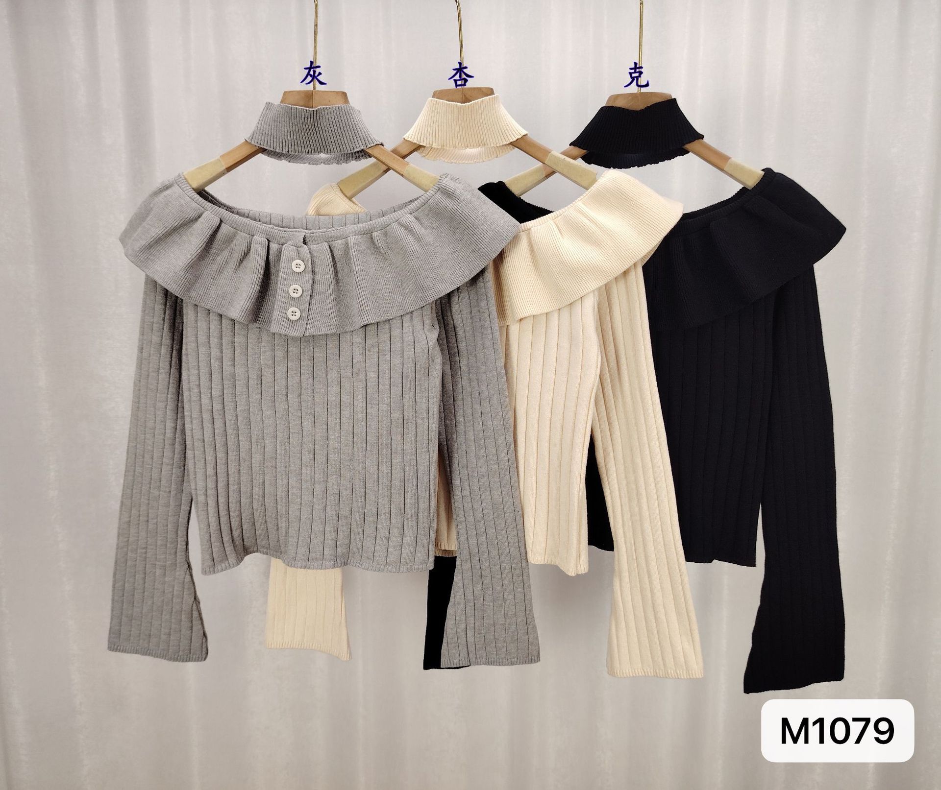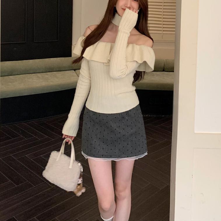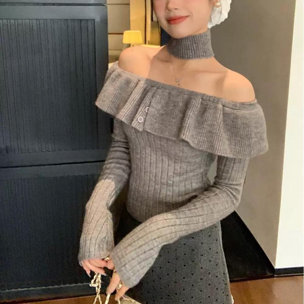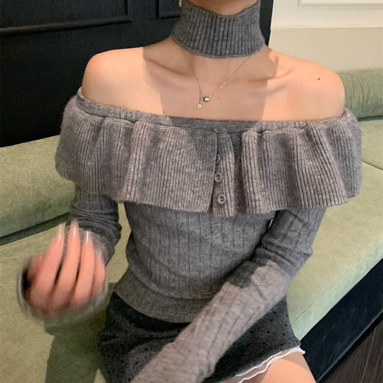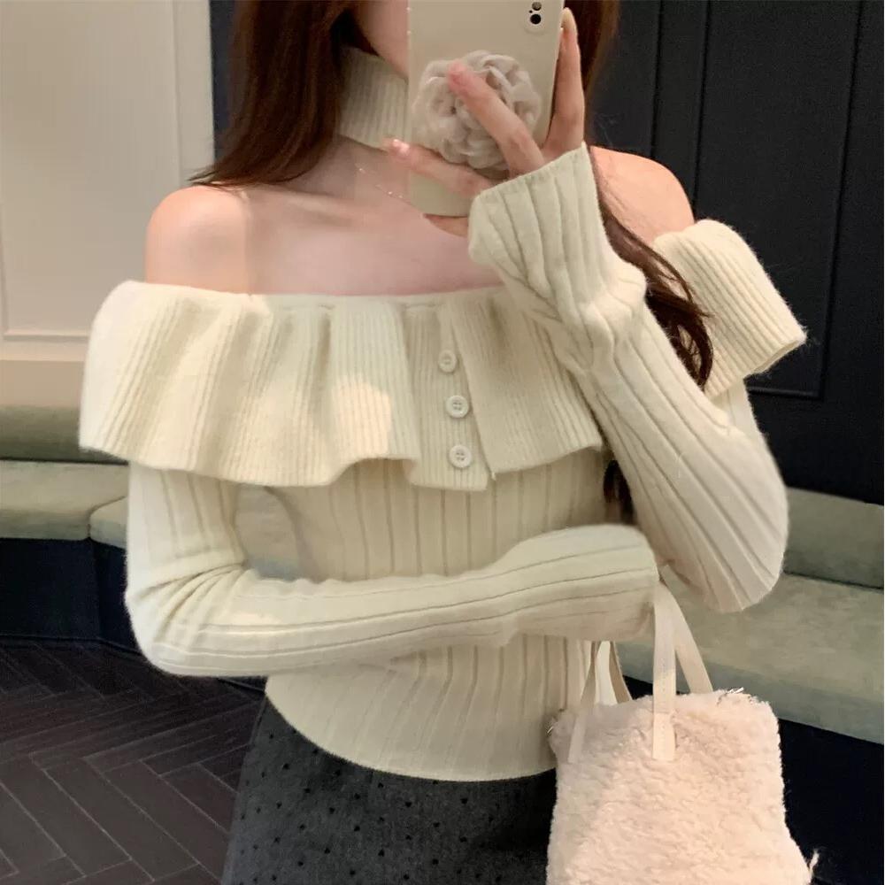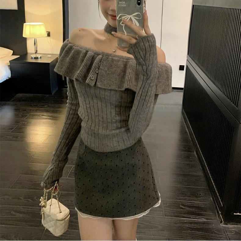 2024 년 가을 겨울 새 어깨 긴 소매 셔츠 탑 여성 한국 스타일 스파이스 걸스 어깨 짧은 니트 베이스 셔츠
