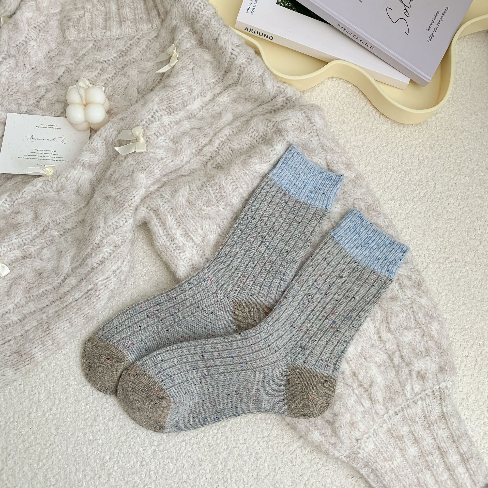 도트 원사 컬러 매칭 양모 양말 여성 두꺼운 라인 일본식 미드 튜브 양말 따뜻한 기모 두꺼운 가을과 겨울 캐시미어 캐시미어