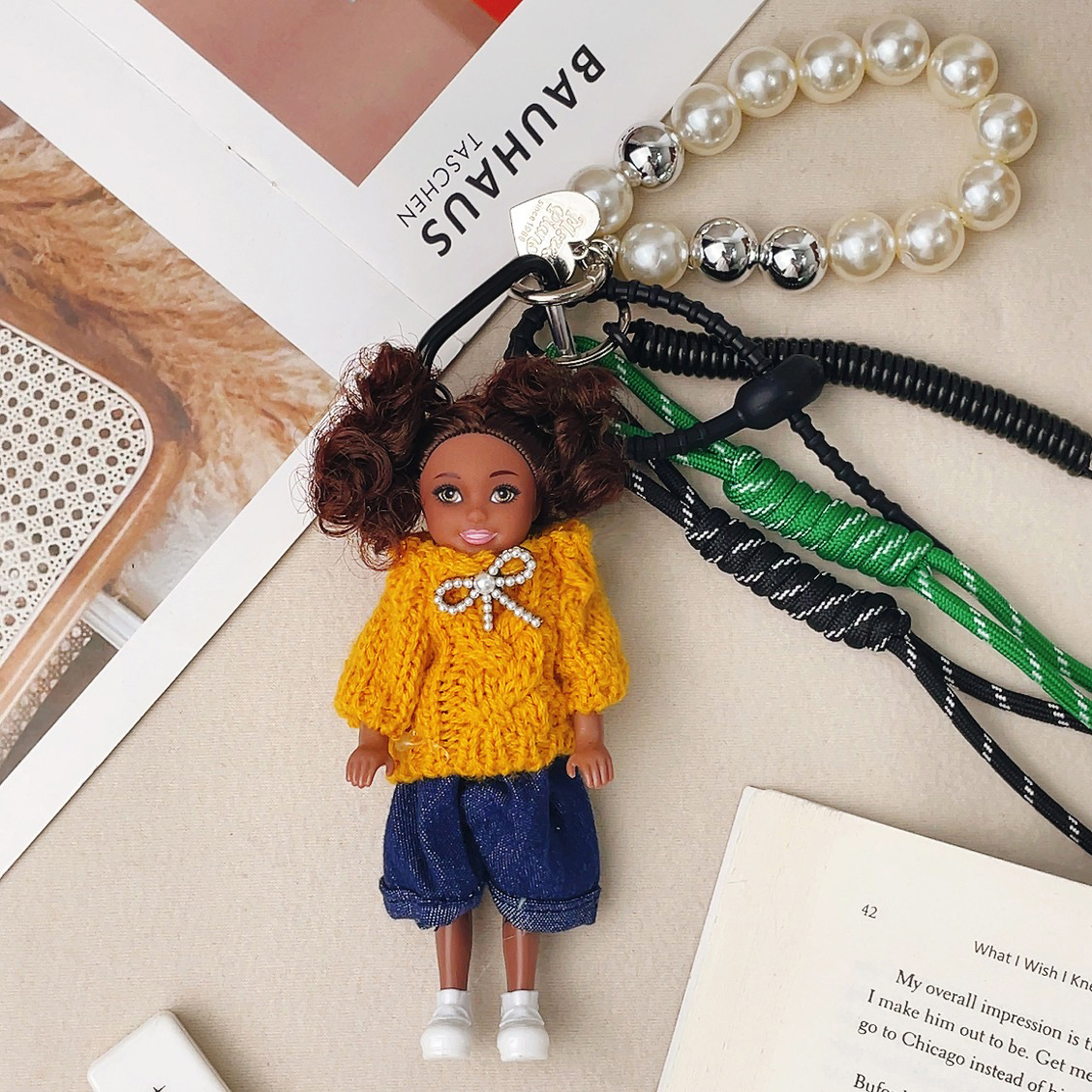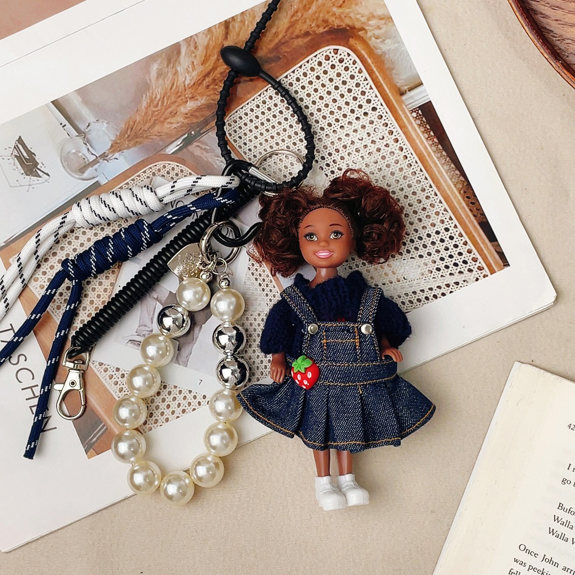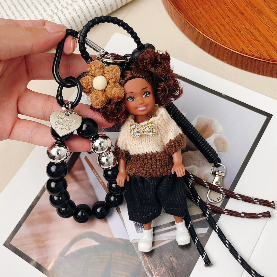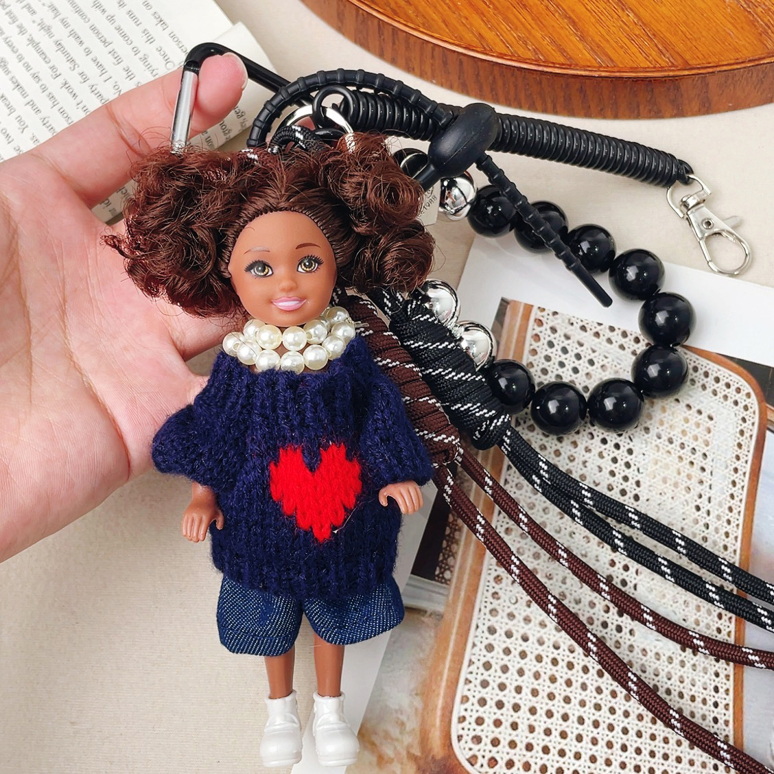 가방 교수형 인형 한국 하이 엔드 센스 귀여운 만화 바비 인형 키 체인 곱슬 머리 검은 소녀 Schoolbag 펜던트