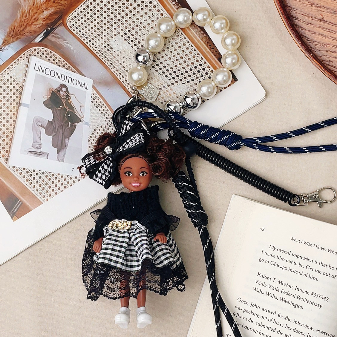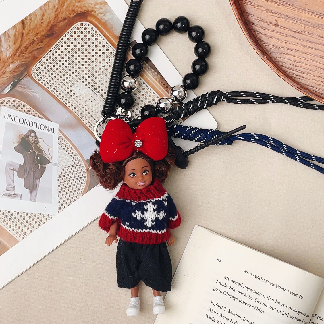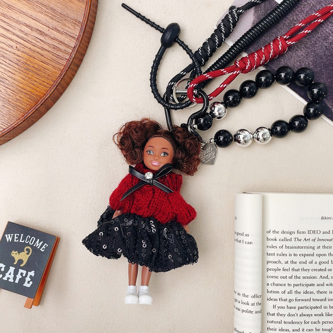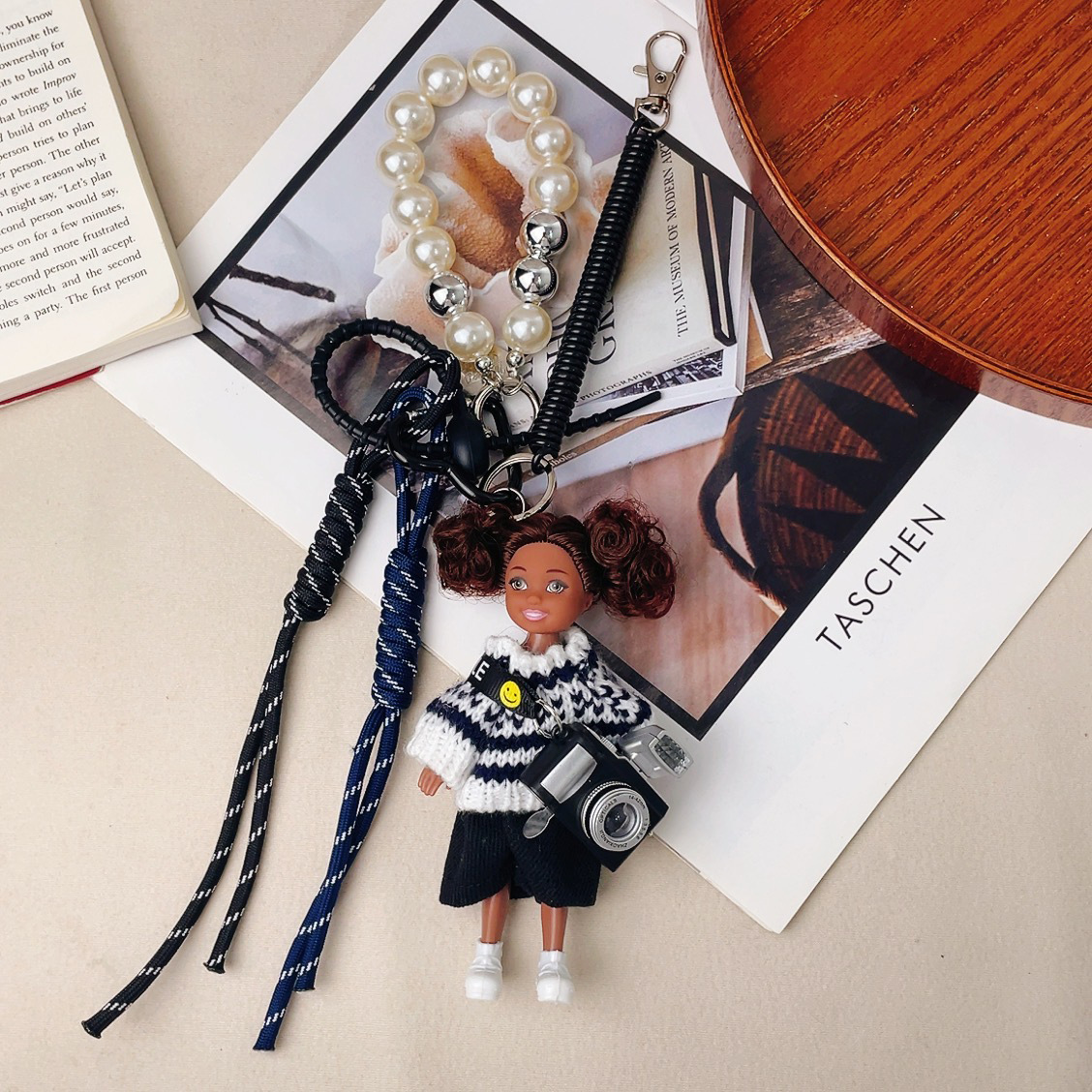 가방 교수형 인형 한국 하이 엔드 센스 귀여운 만화 바비 인형 키 체인 곱슬 머리 검은 소녀 Schoolbag 펜던트스토어 가기