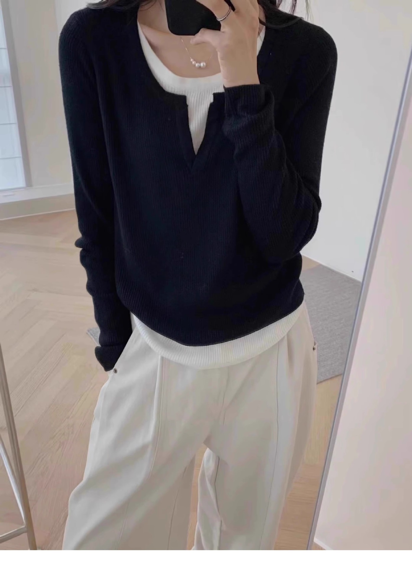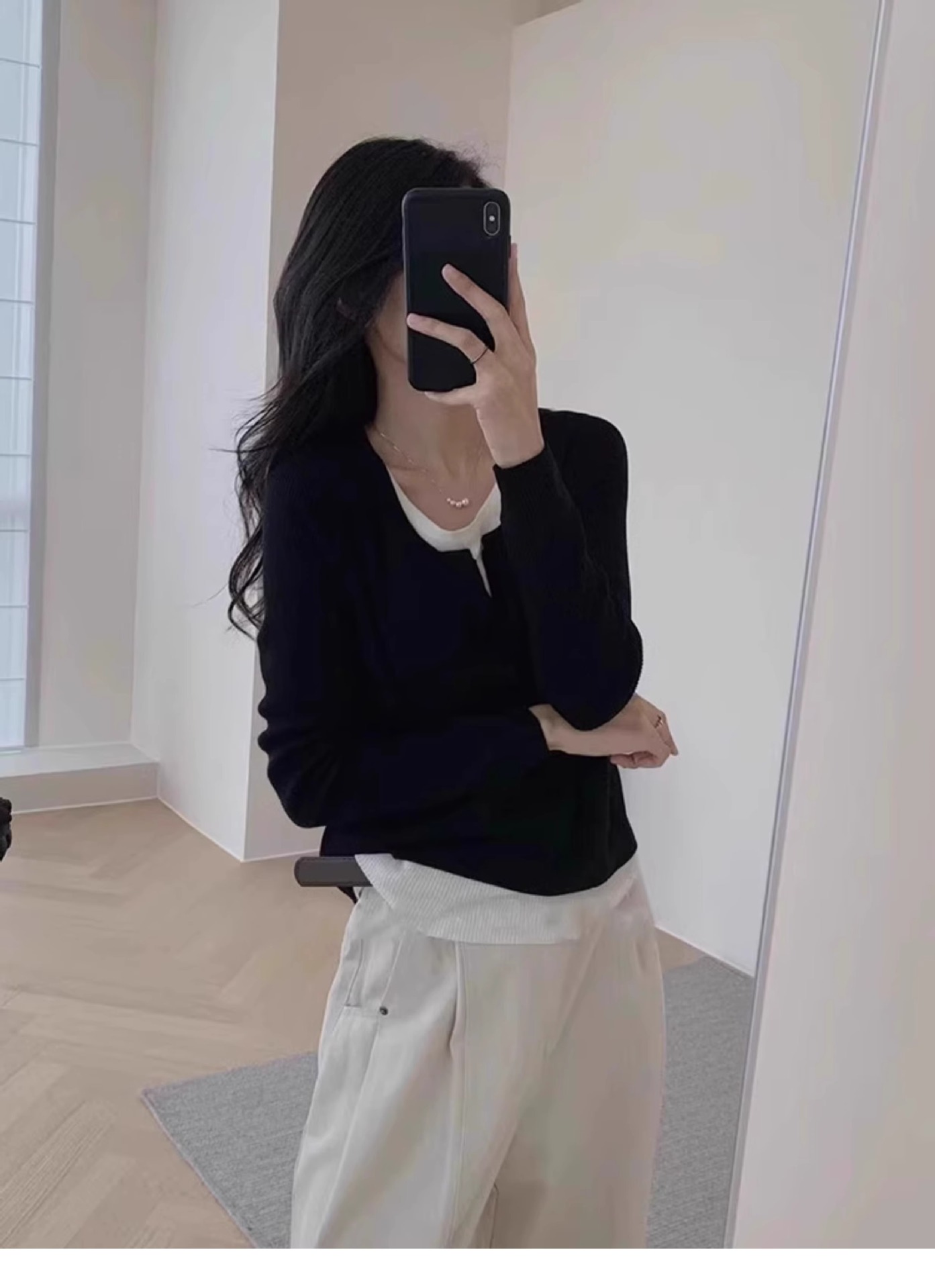 Chic Irregular Hem Top 여성용 봄과 가을 인테리어 가짜 투피스 바느질 긴팔 티셔츠 슬림핏 베이스 셔츠