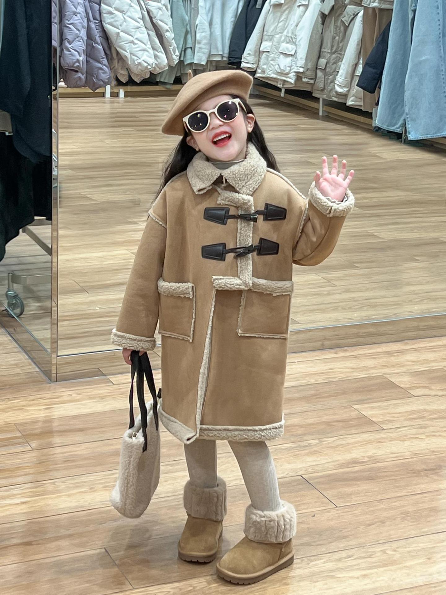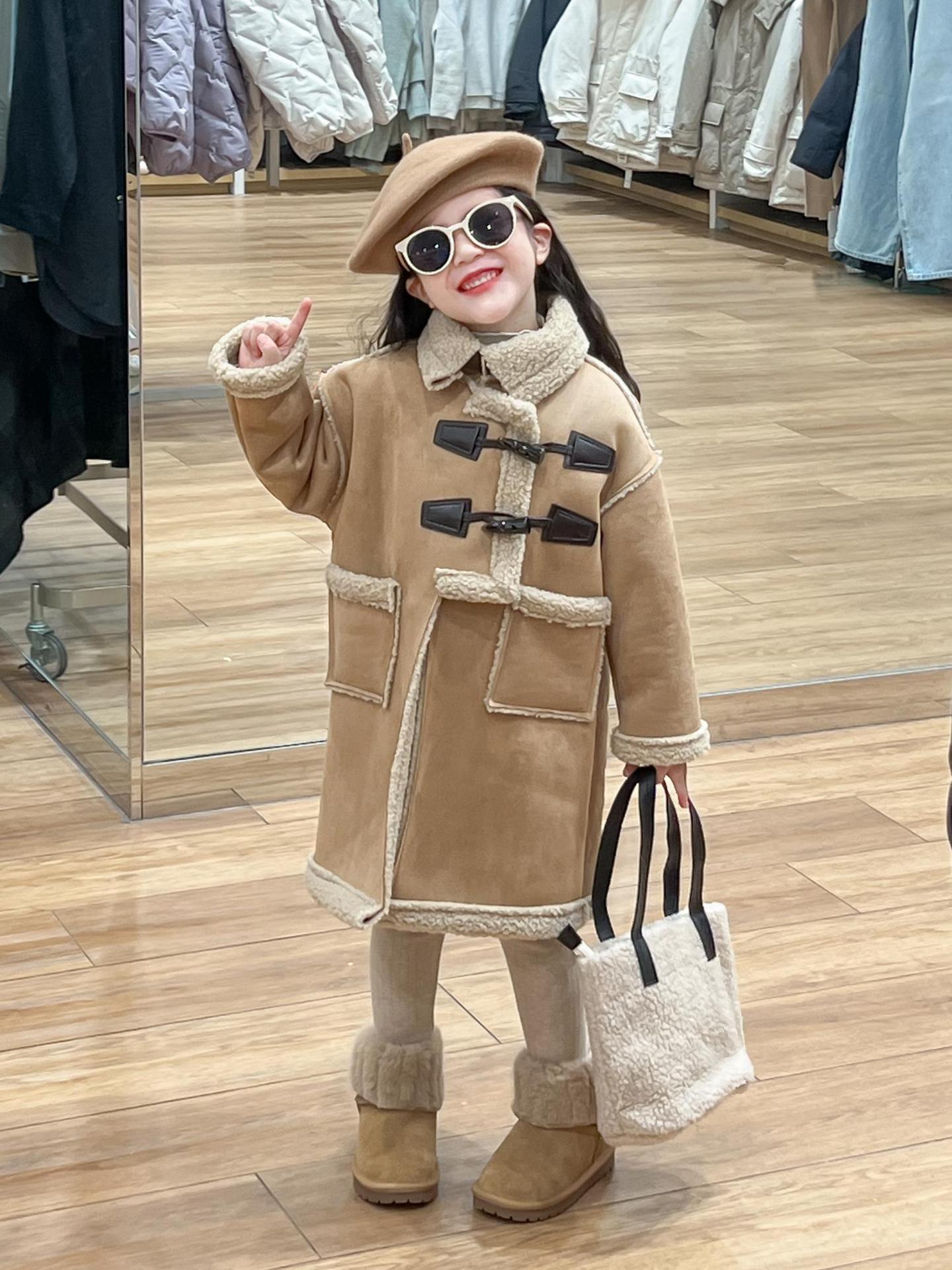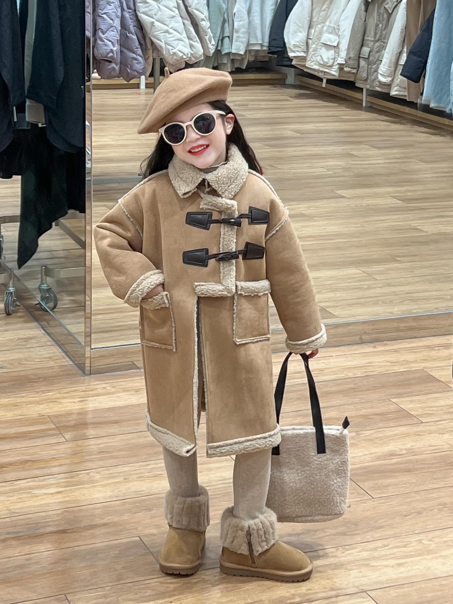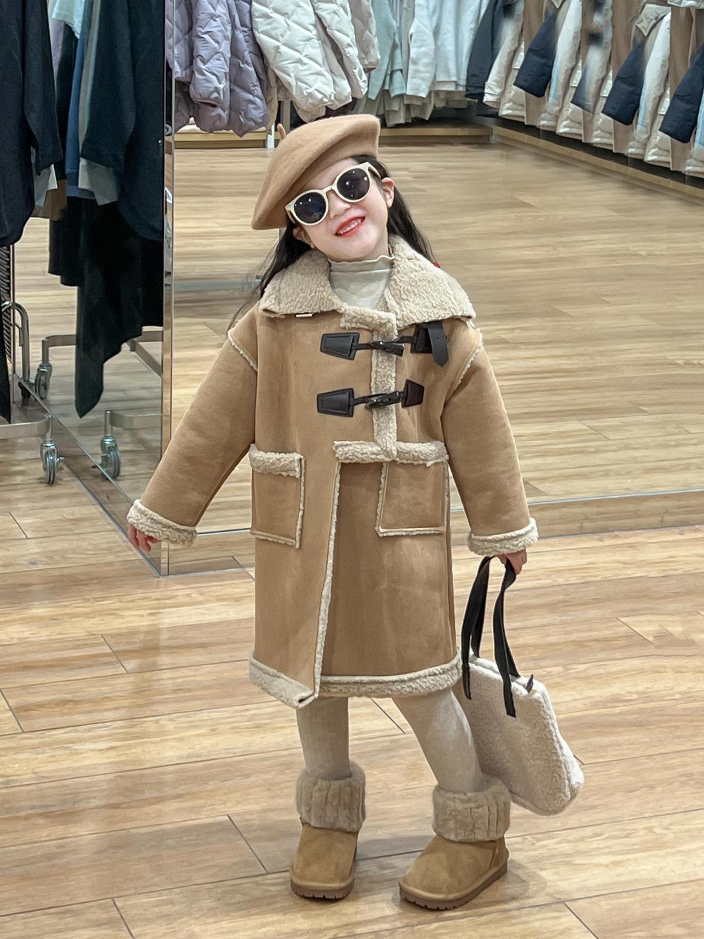 소녀 겨울 불규칙한 가죽 버튼 라켓 기모 두꺼운 다크 브라운 모피 원피스 따뜻한 중간 길이 코트 재킷스토어 가기