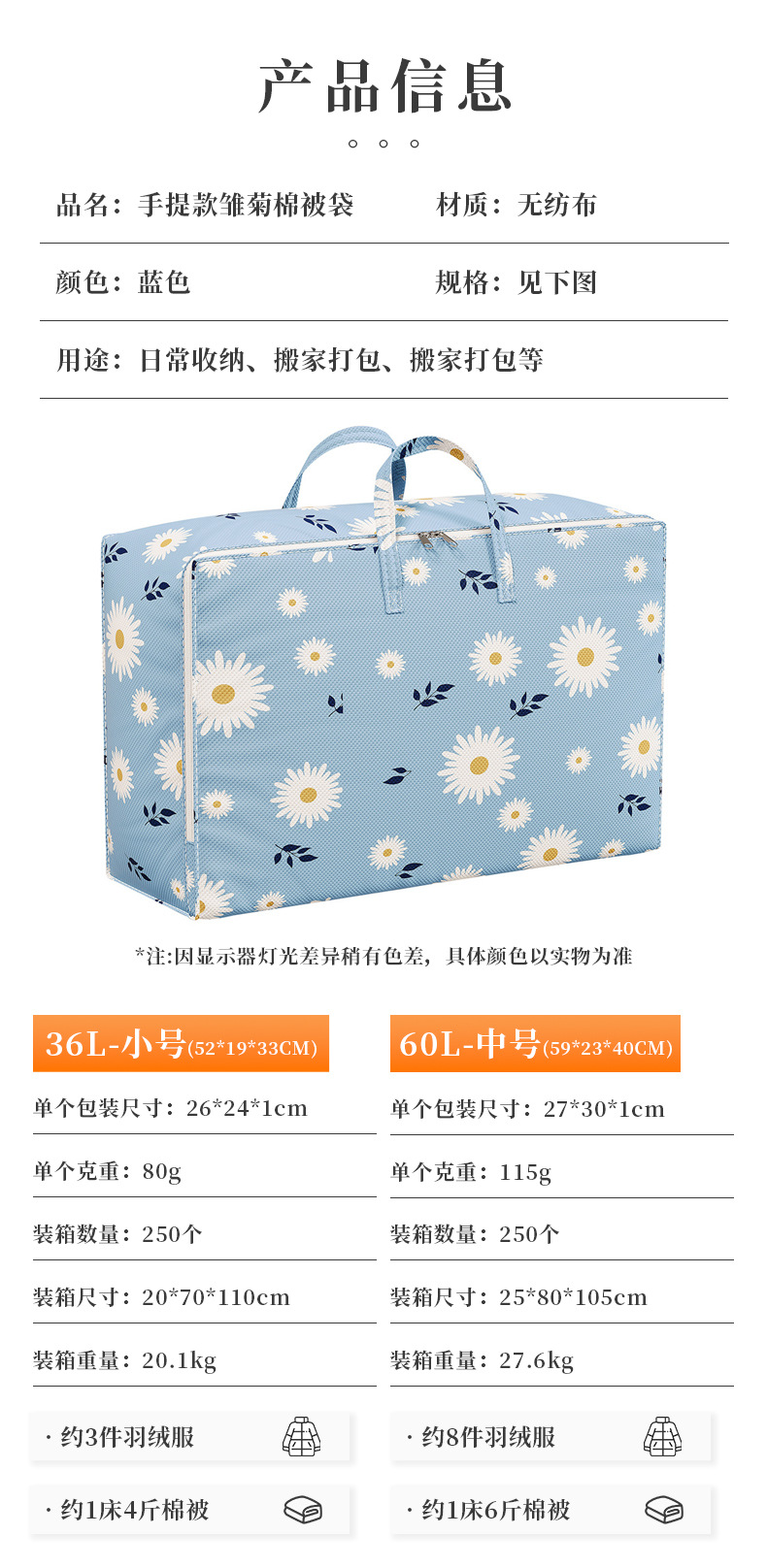 이불 보관 가방 부직포 휴대용 데이지 이불 가방 수납 짐 옷 이사 포장 가방 대용량