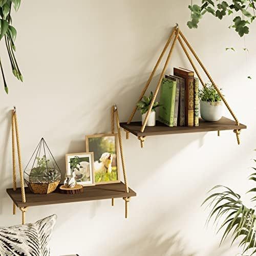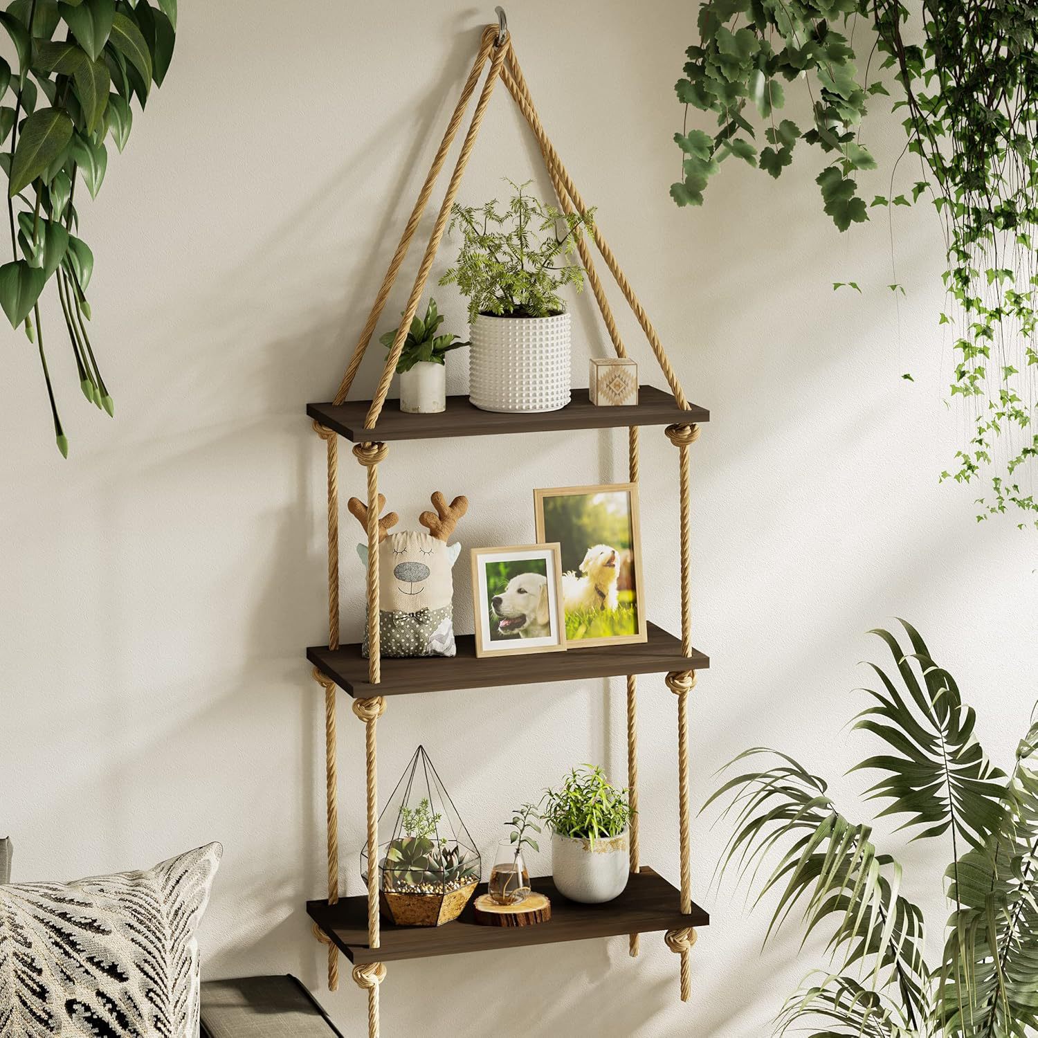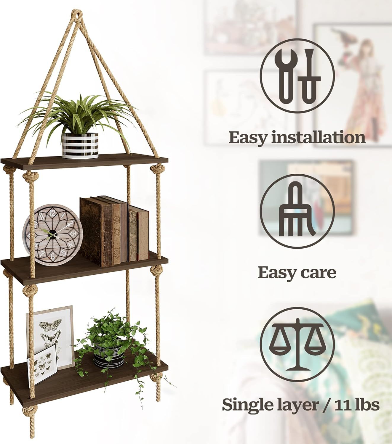 펀치없는 스토리지 랙 대마 로프 파티션 나무 책장 벽 장식 랙 라미네이트 거실 벽걸이 스토리지 랙