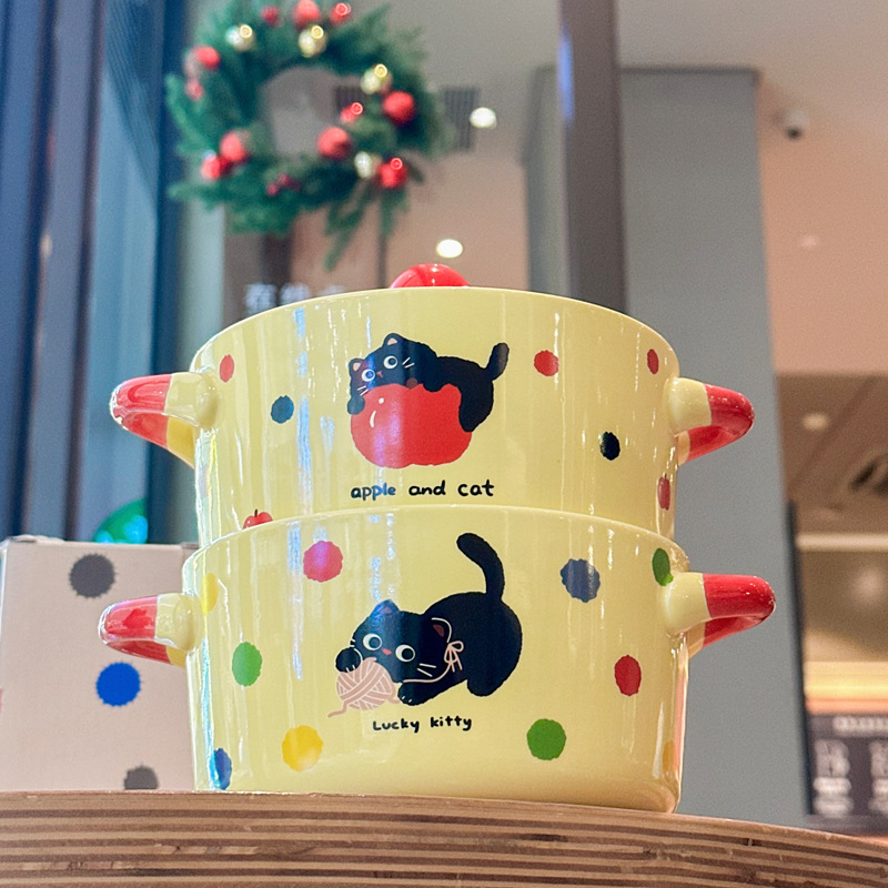 귀여운 웨이브 포인트 고양이 인스턴트 국수 그릇 과일 샐러드 디저트 그릇 학생 기숙사 인스턴트 국수 그릇 생일 선물