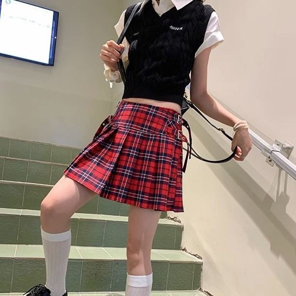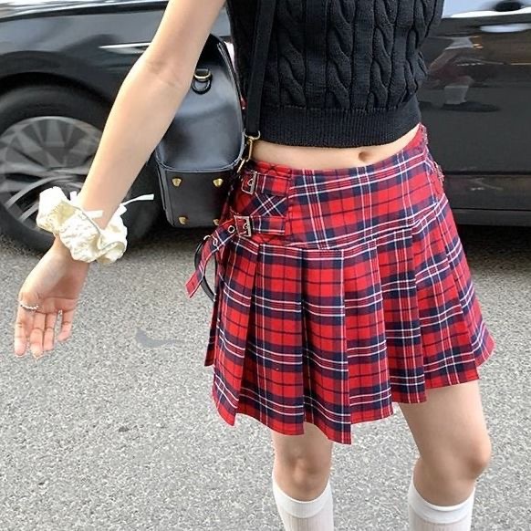 미국 스타일의 블루 체크 무늬 주름 치마 여성을위한 작은 소녀 뜨거운 소녀 치마, 짧은 치마 디자인 틈새 오버 스커트스토어 가기
