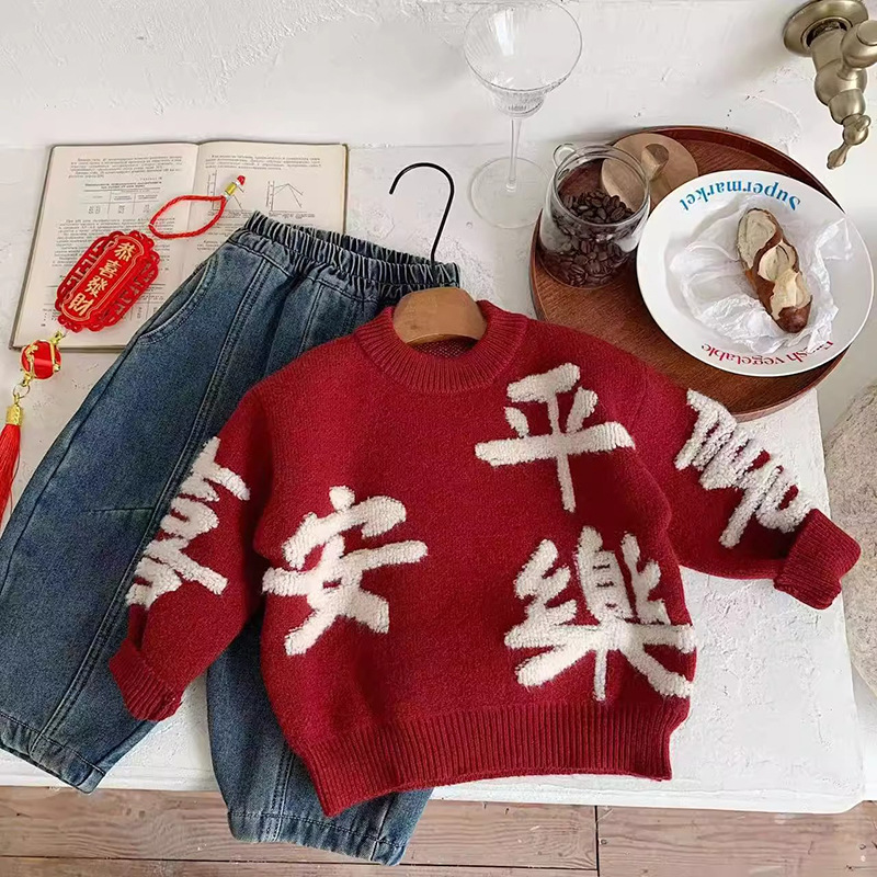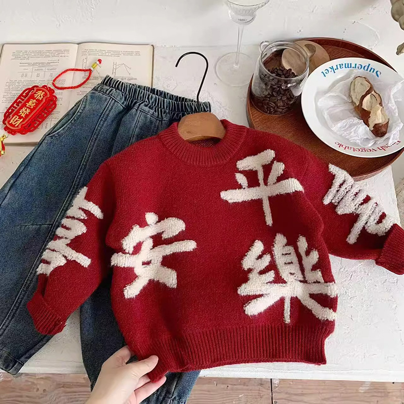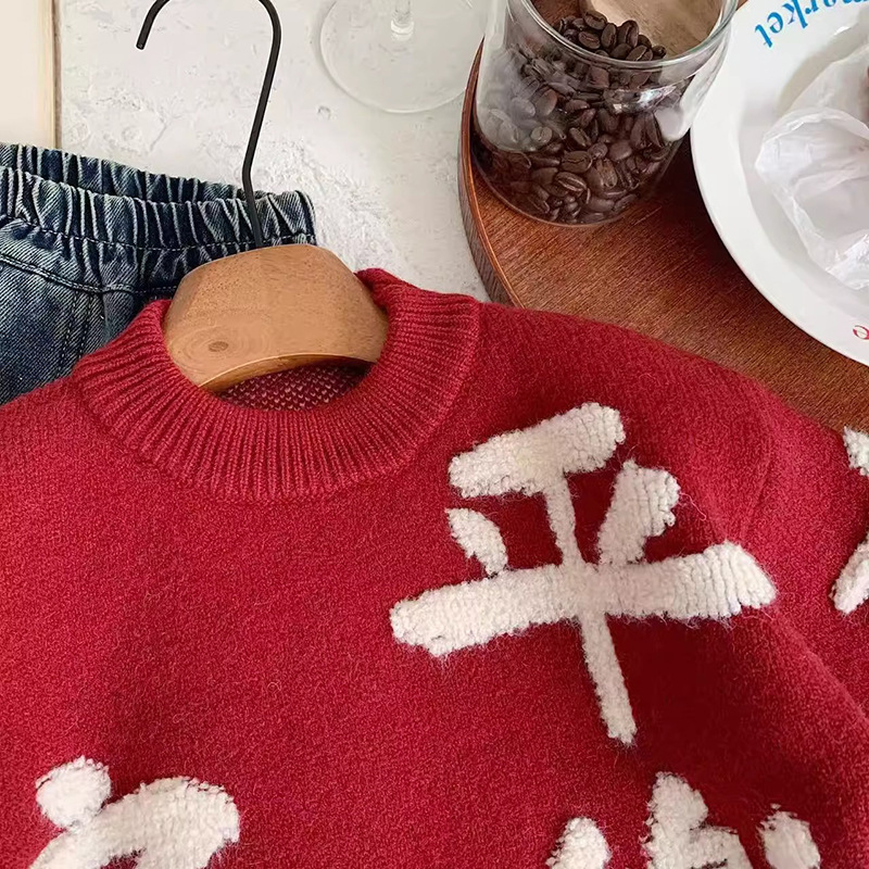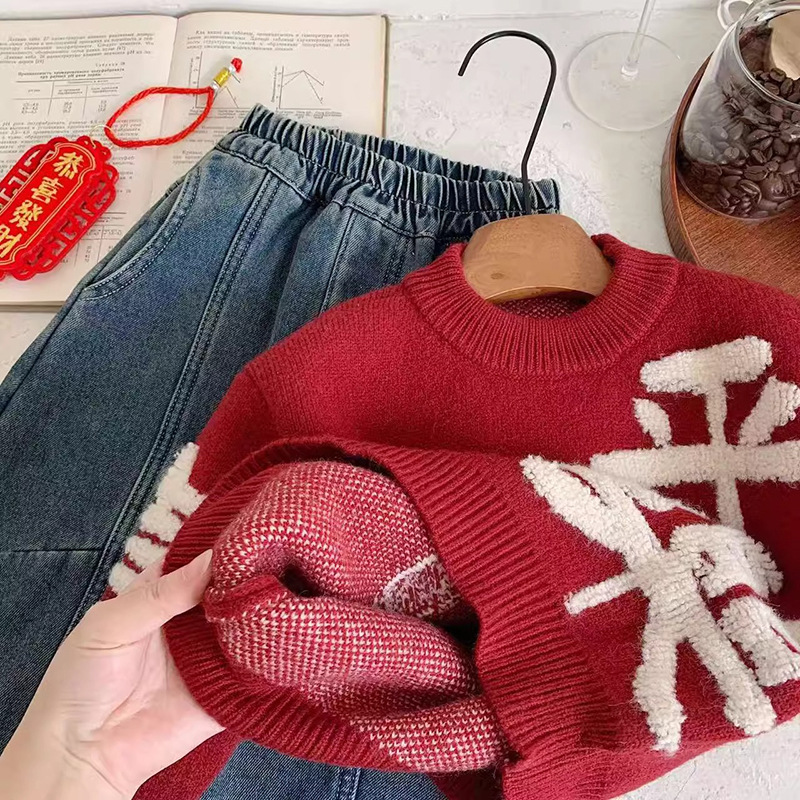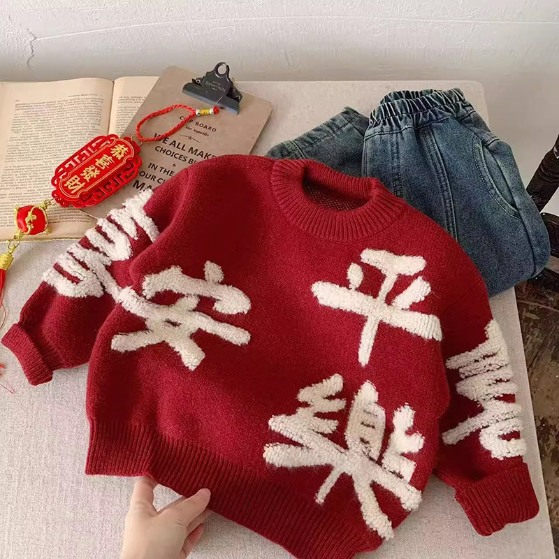 니트 스웨터 가을 겨울 아동복 2026 레드 컬러 중국풍 축제복 아기 남아 여아 어린이 스웨터 상의